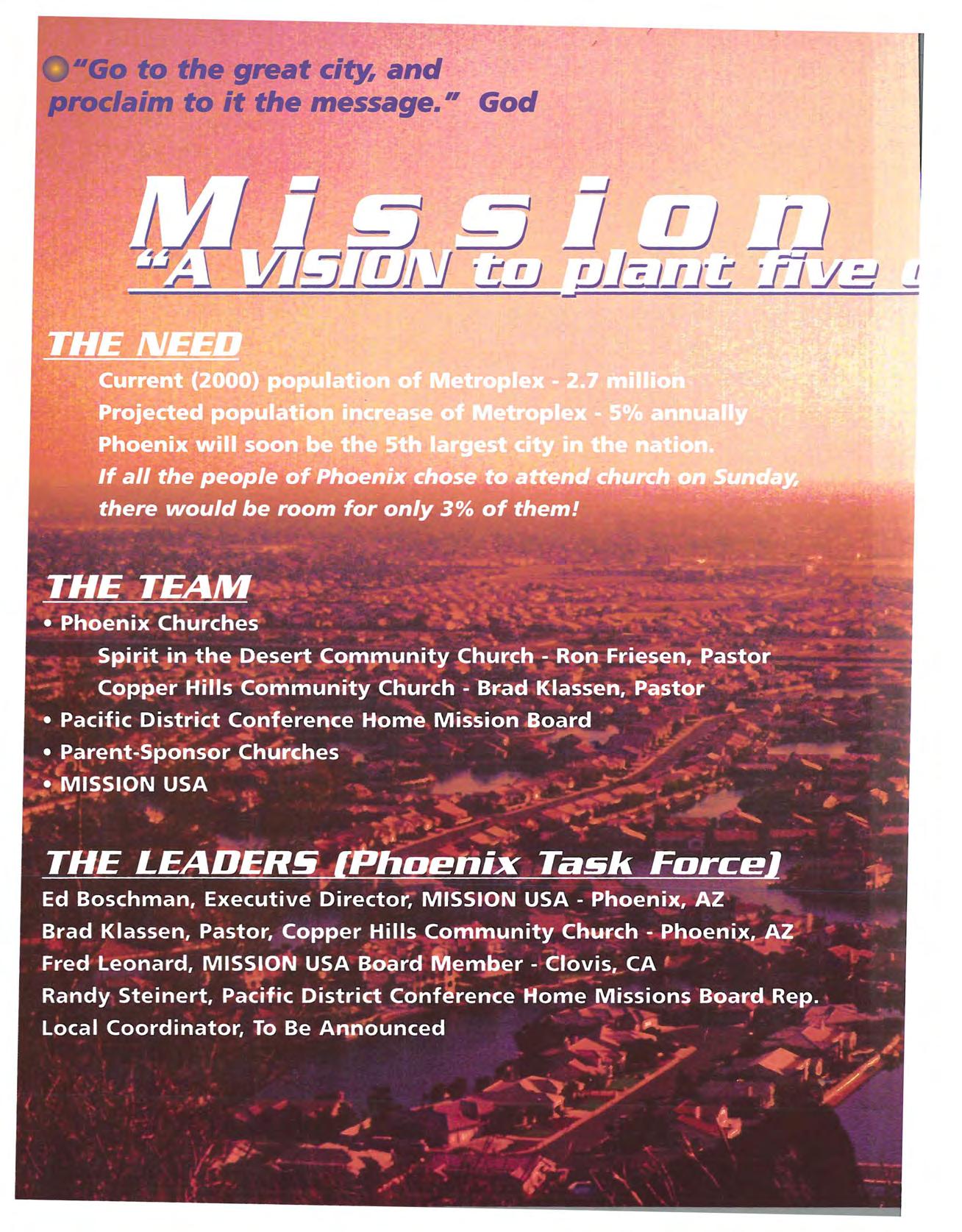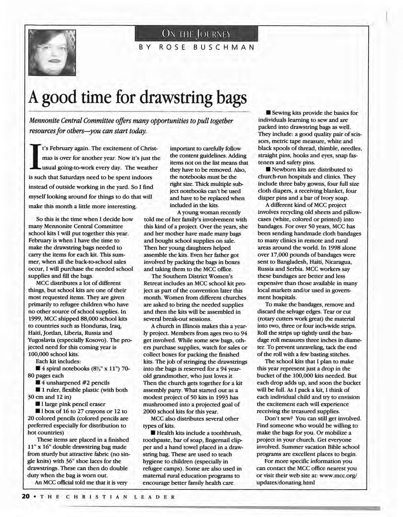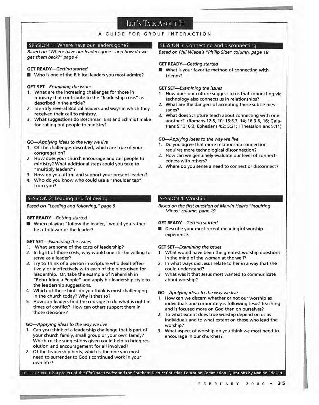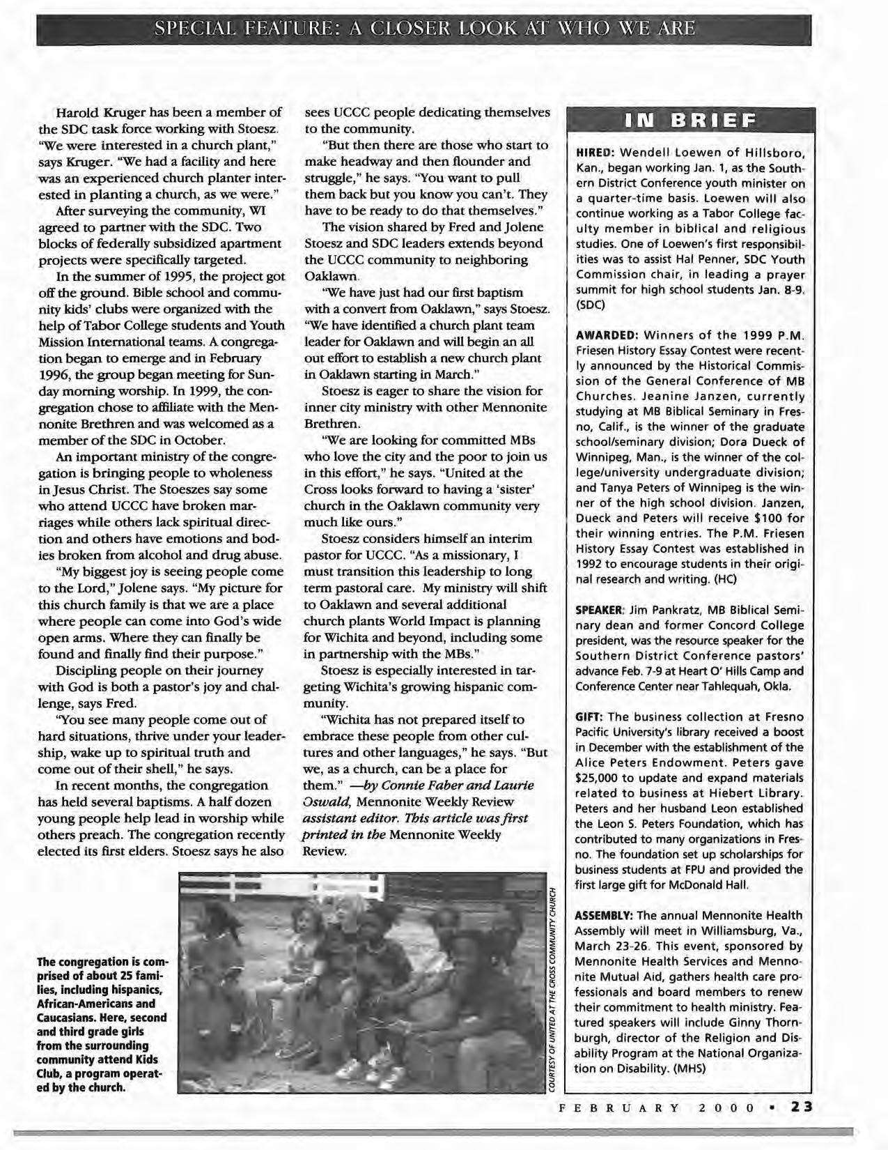 The Christian Leader (ISSN 0009-5149) is published monthly by the U.S. Conference of Mennonite Brethren Churches, 315 S. lincoln, Hillsboro, KS 67063. The Christian Leader seeks to inform Mennonite Brethren members and churches of the events, activities, decisions and issues of their denomination, and to instruct. inspire and initiate dialog so members will aspire to be faithful disciples of Christ as understood in the evangelical/Anabaptist theological tradition. However, the views expressed in this publication do not necessarily represent the position of the Christian Leader, the Board of Communications or the Mennonite Brethren Church.