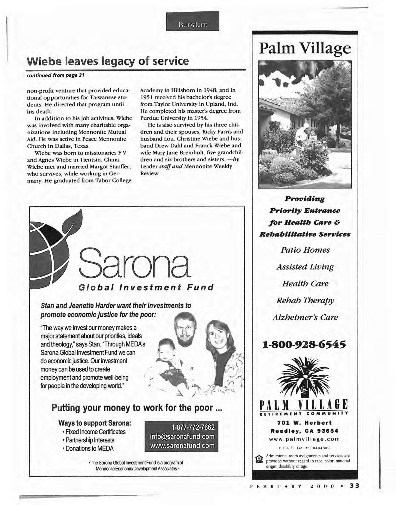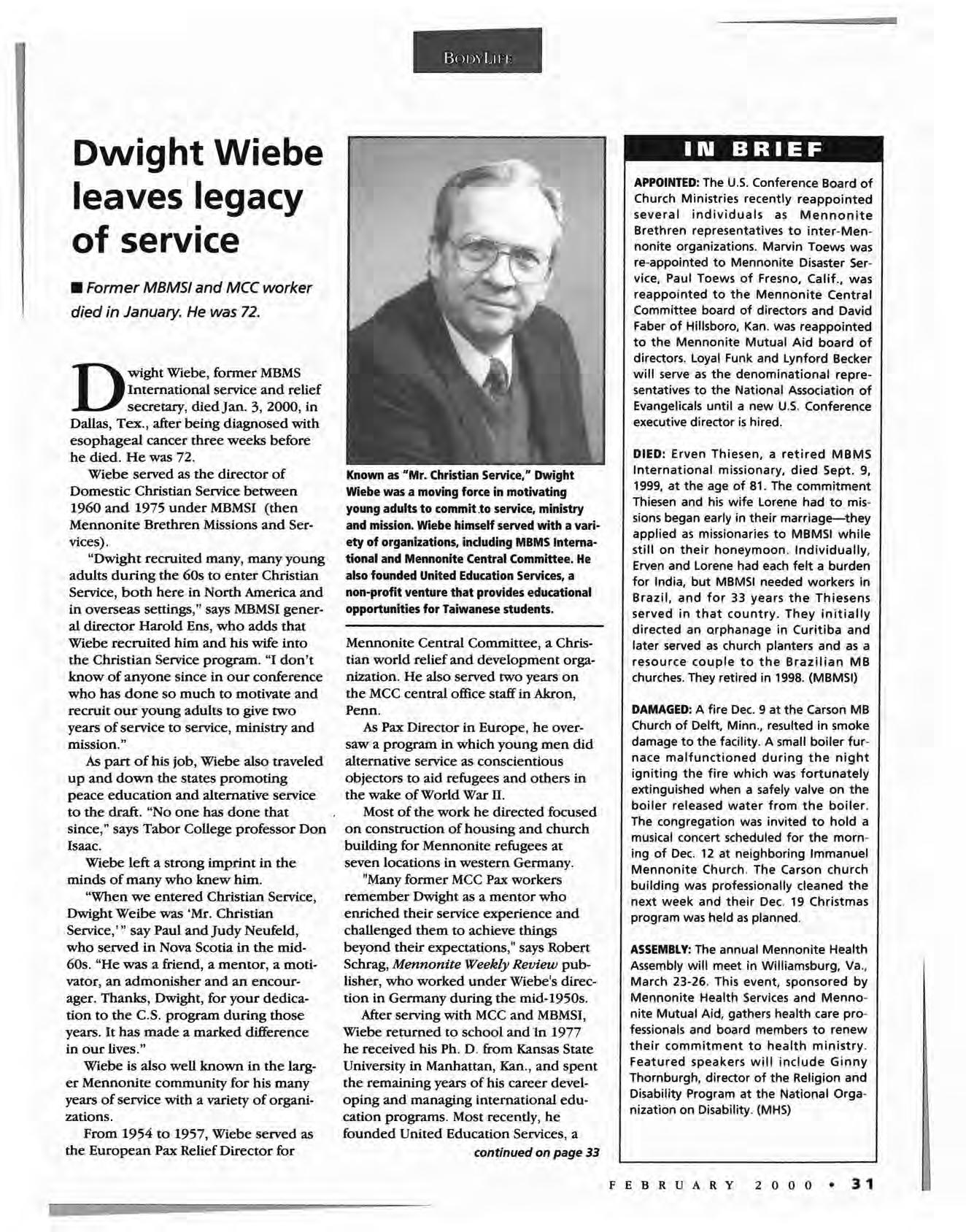 He is also survived by his three children and their spouses, Ricky Farris and husband Lou, Christine Wiebe and husband Drew Dahl and Franck Wiebe and wife Mary Jane Breinholt, five grandchildren and six brothers and sisters. -by Leader staff and Mennonite Weekly Review