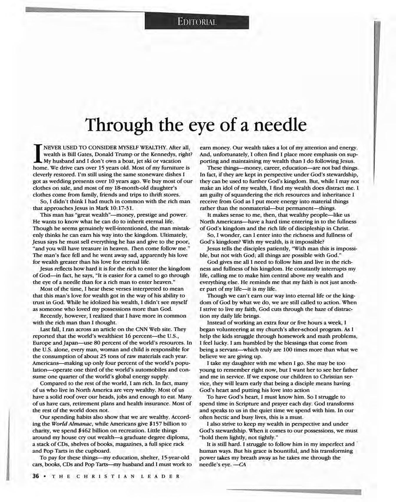 It is still hard. I struggle to follow him in my imperfect and' human ways. But his grace is bountiful, and his transforming power takes my breath away as he takes me through the needle's eye.·-GA