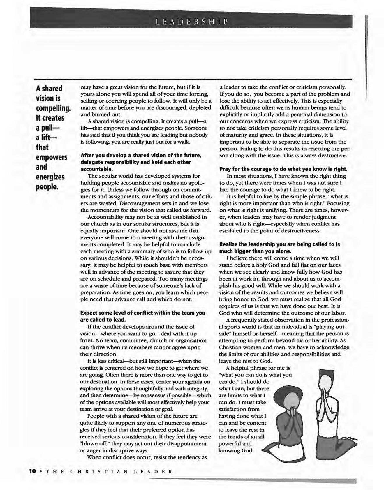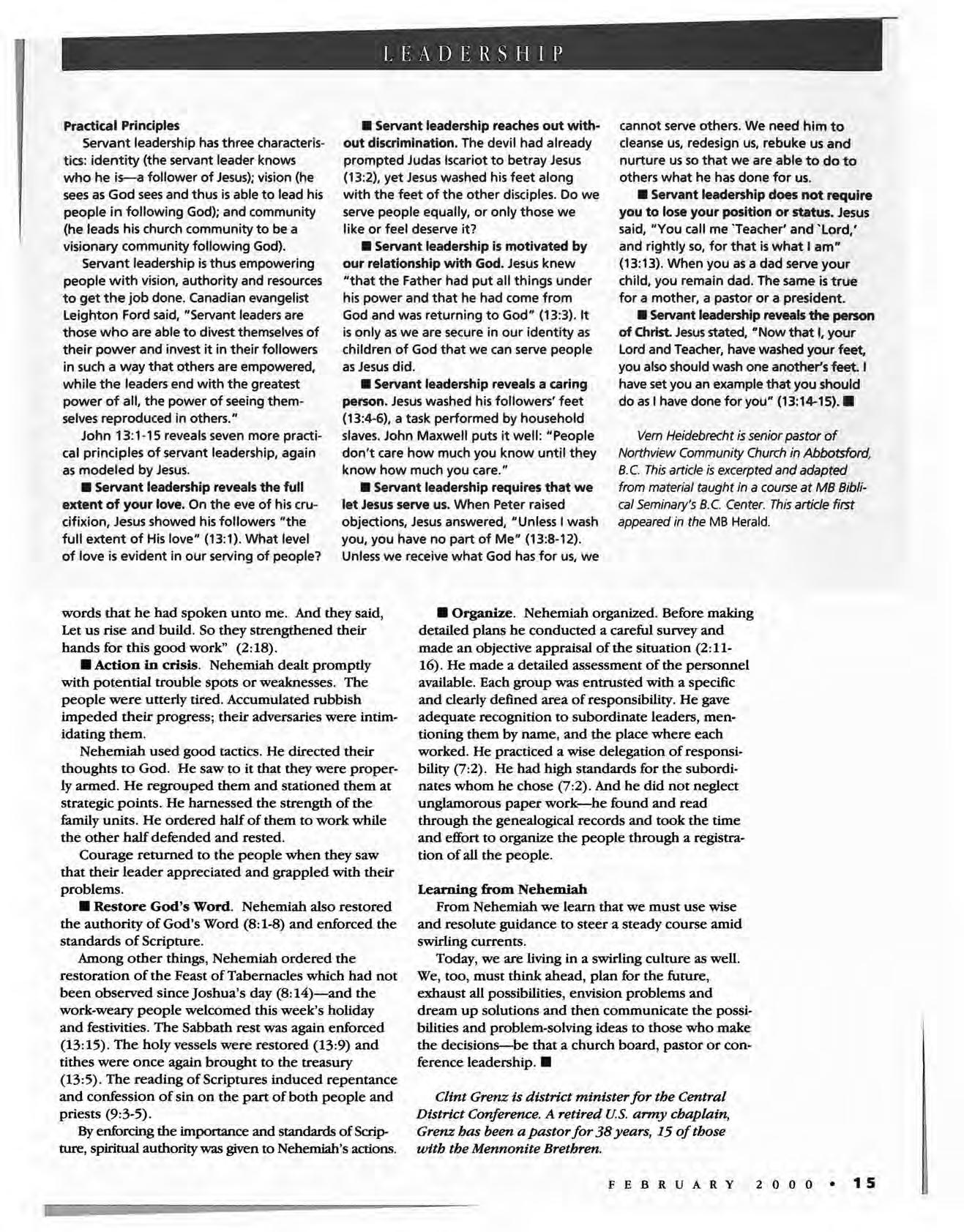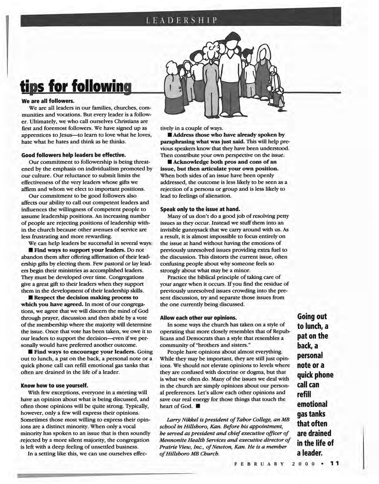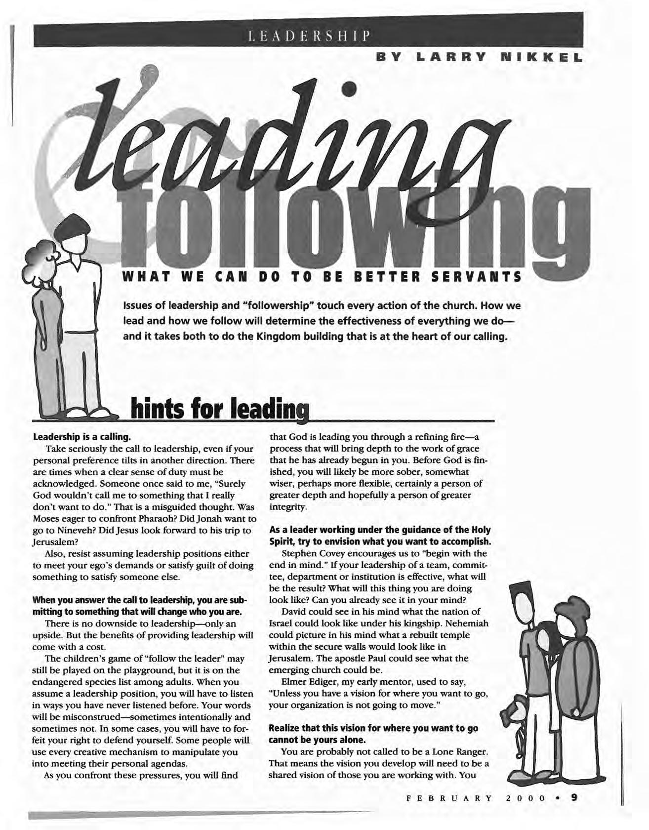 In our second feature, Larry Nikkel provides a number of ways we can be better leaders and followers. The church needs both to be effective at Kingdom building.