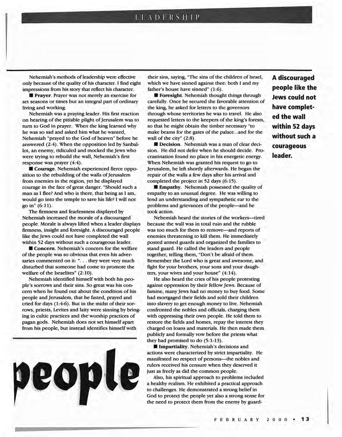 3. Try to think of a person in scripture who dealt effectively or ineffectively with each of the hints given for leadership. Or, take the example of Nehemiah in "Rebuilding a People" and apply his leadership style to the leadership suggestions.