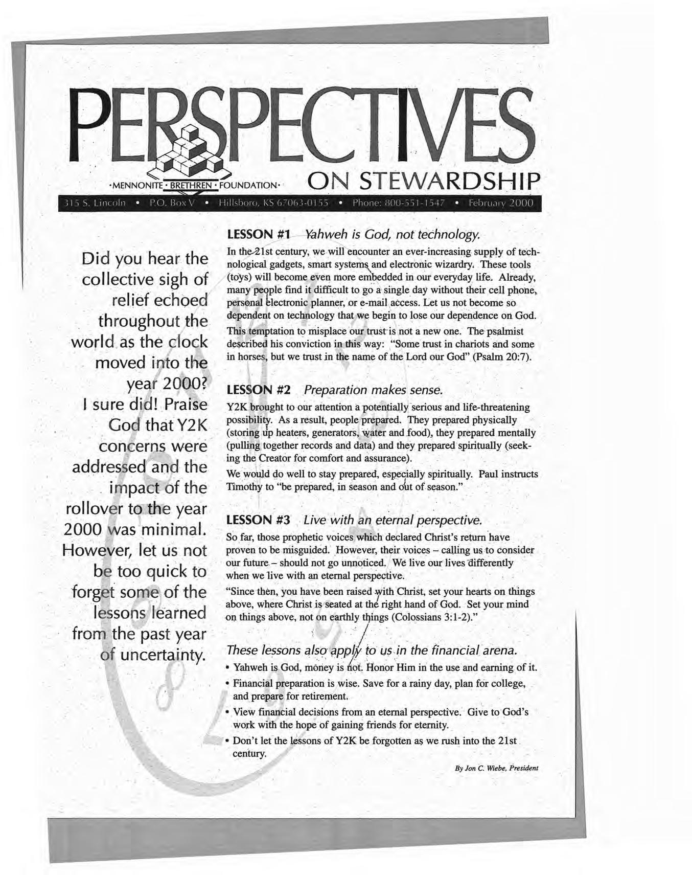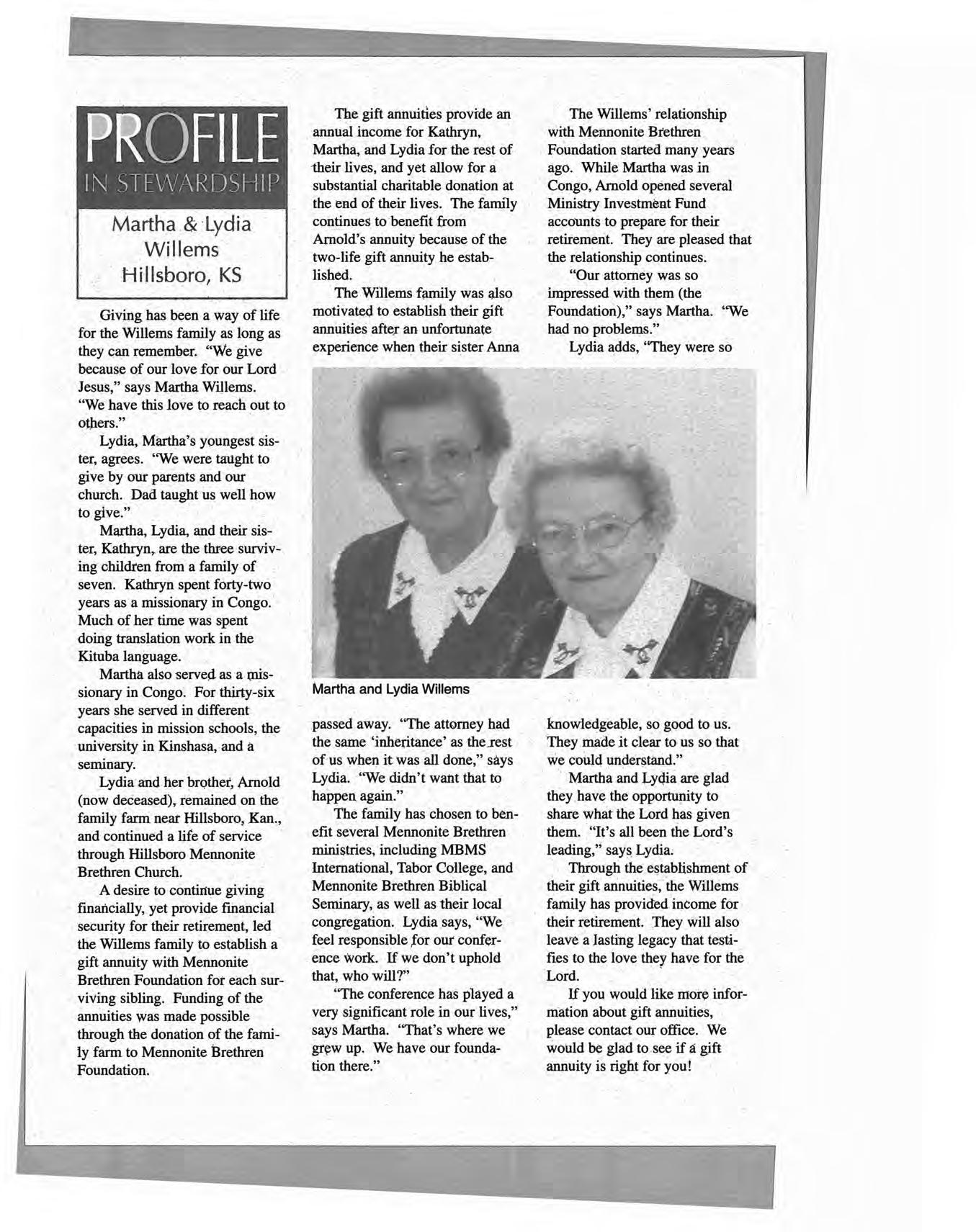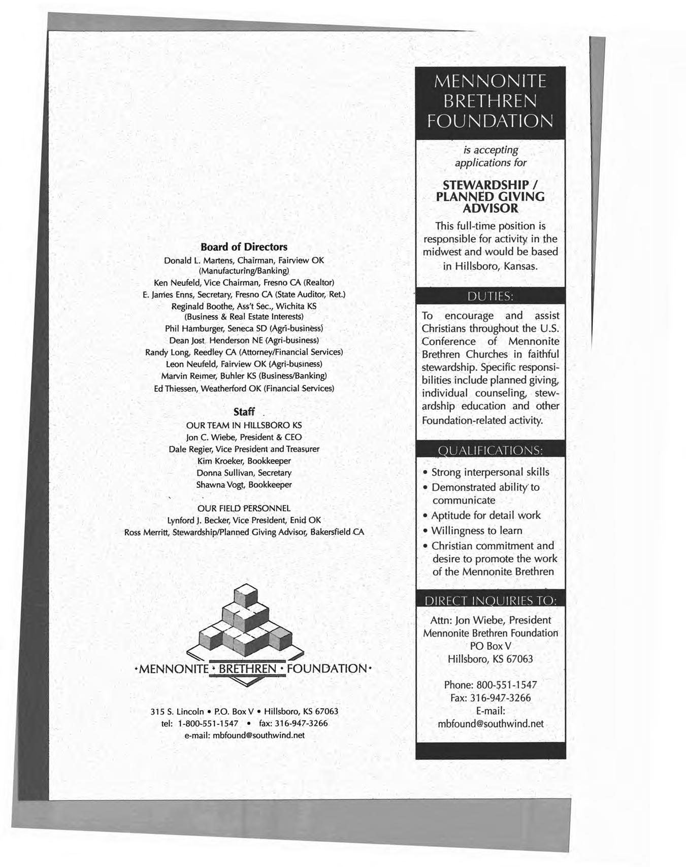 To encourage and assist Christians throughout the U.S. Conference of Mennonite Brethren Churches in faithful stewardship. Specific responsibilities include planned giving, charitable estate planning, individual counseling, stewardship education and other Foundation-related activity. QUALIFICA TlONS:
