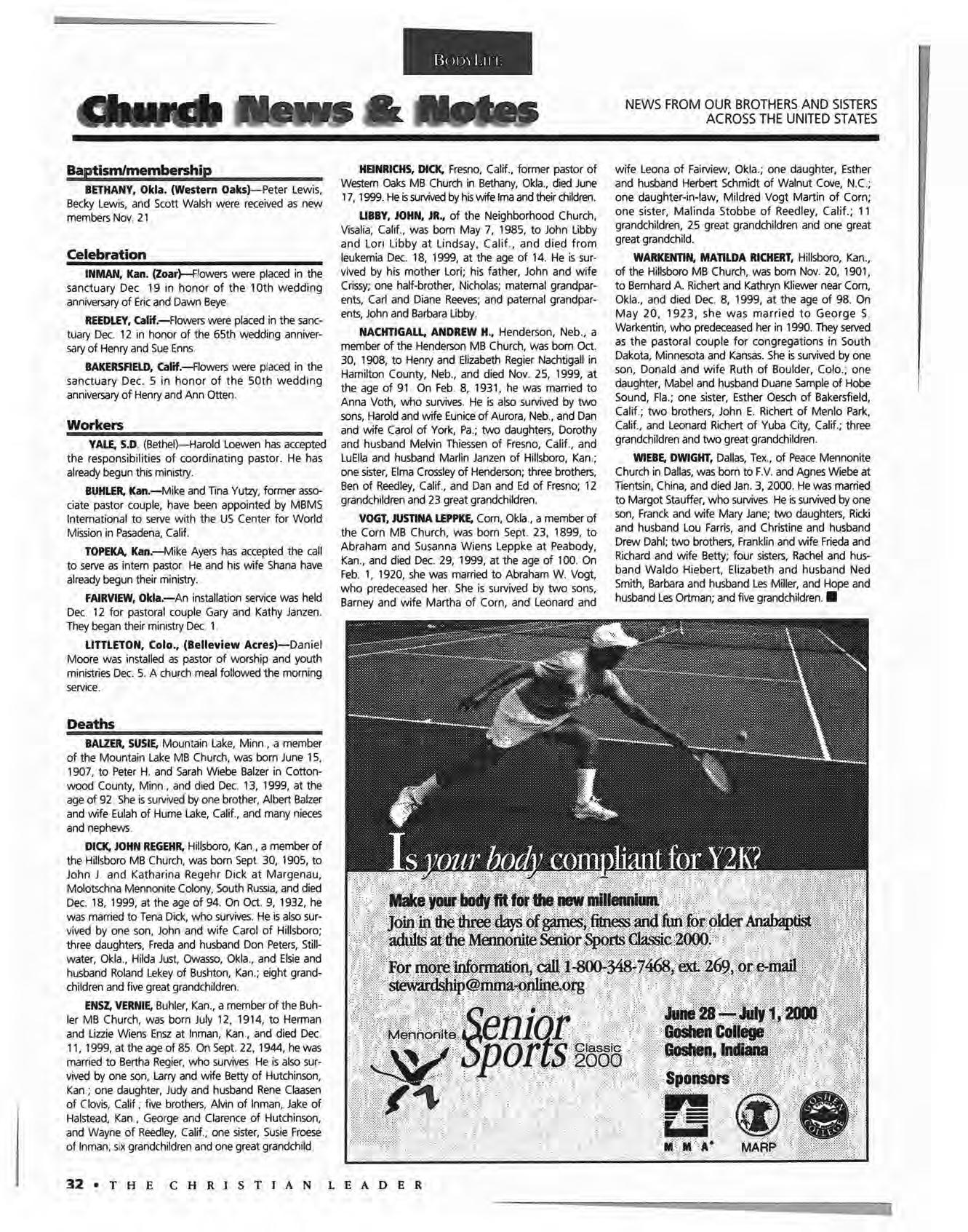 Postmaster: Send address changes to the Christian Leader, Box V, Hillsboro. KS 67063. Periodicals postage paid at Hillsboro, Kansas.