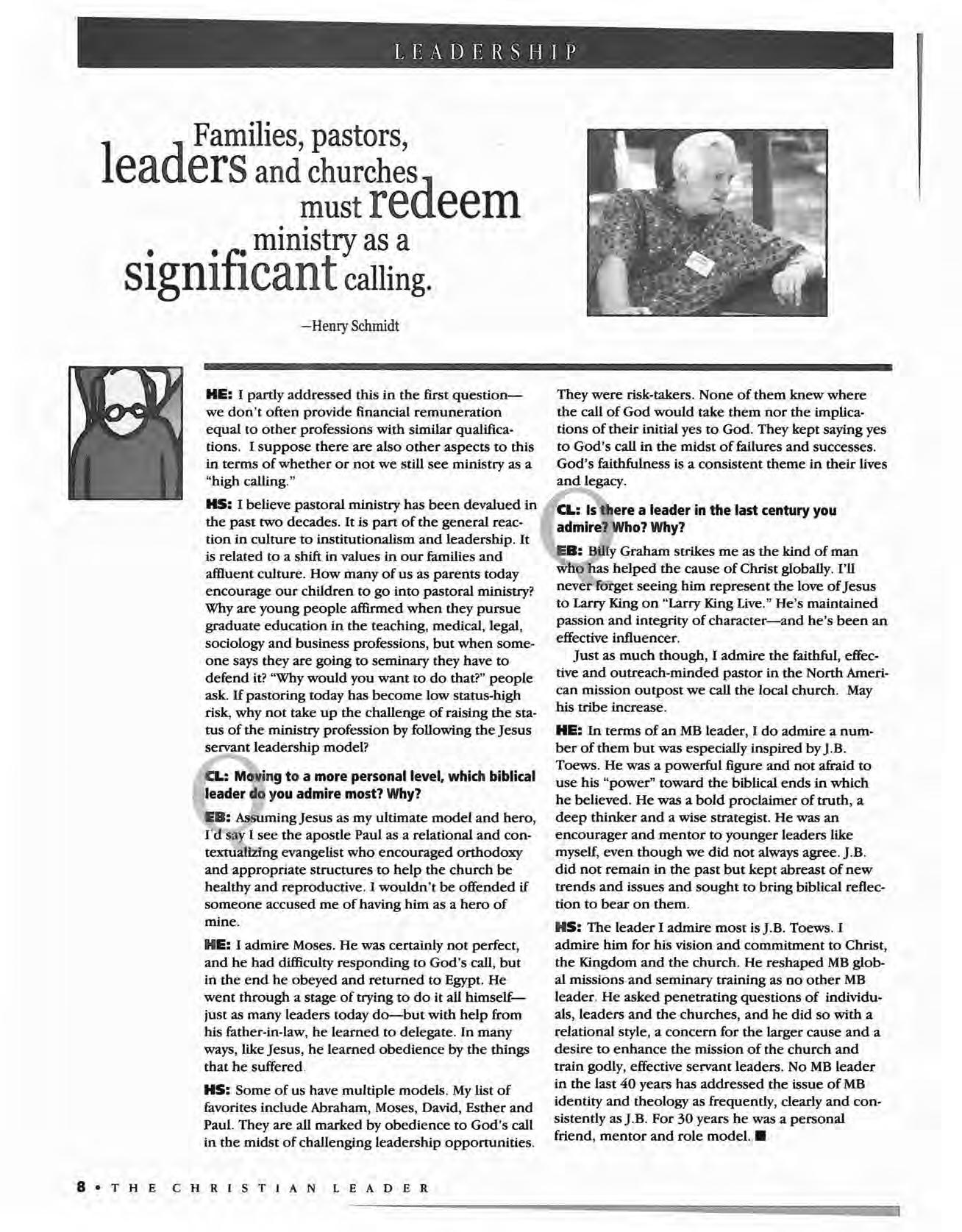 In our first feature, we asked three of our denominational leaders-Ed Boschman, Harold Ens and Henry Schmidt-to give us their thoughts on why we are experiencing this leadership crisis and what we as churches can do about it.