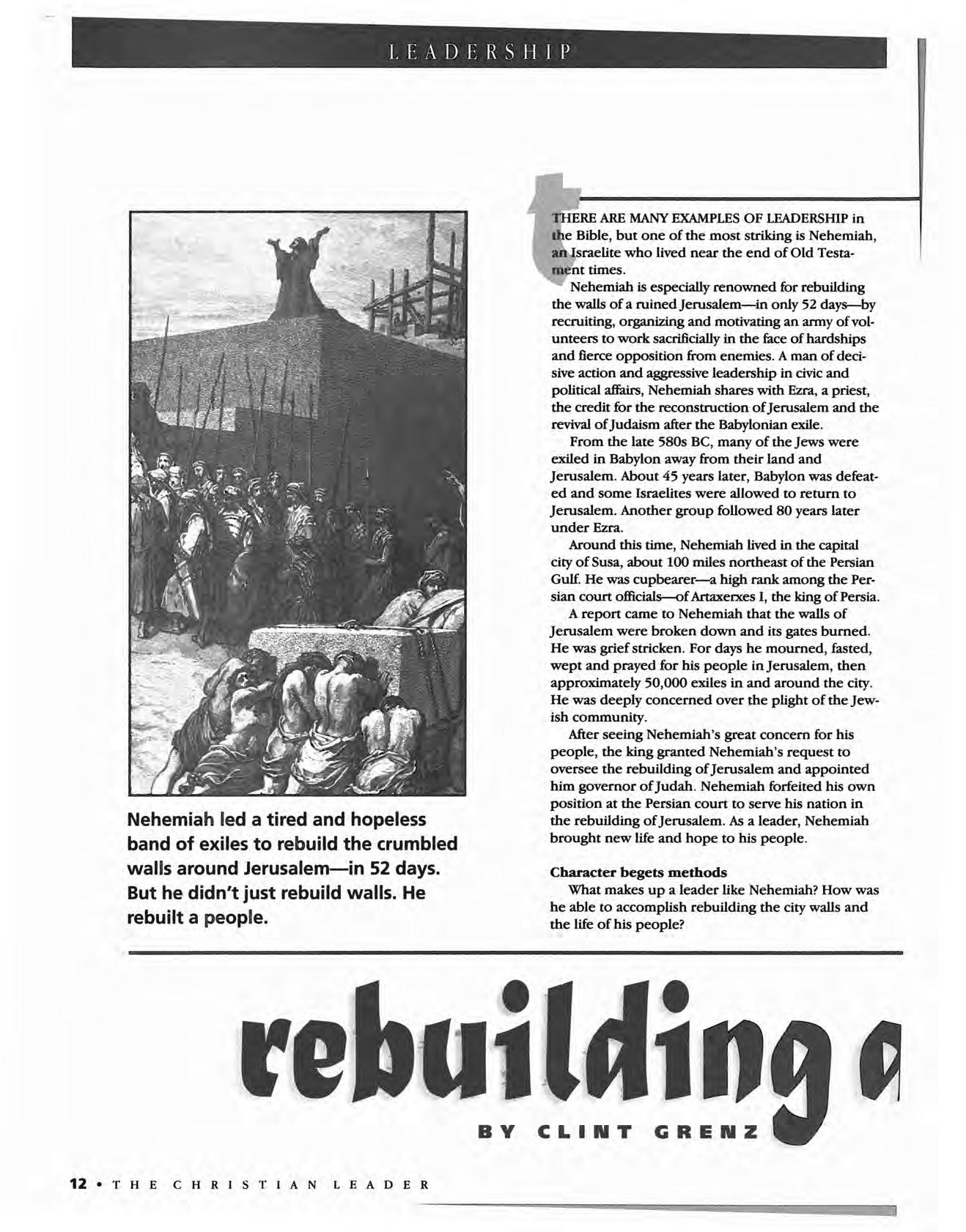 One of the most striking leaders in the Bible is Nehemiah, who not only led his people to rebuild the walls of Jerusalem in 52 days but gave them back hope and new life as well. BY