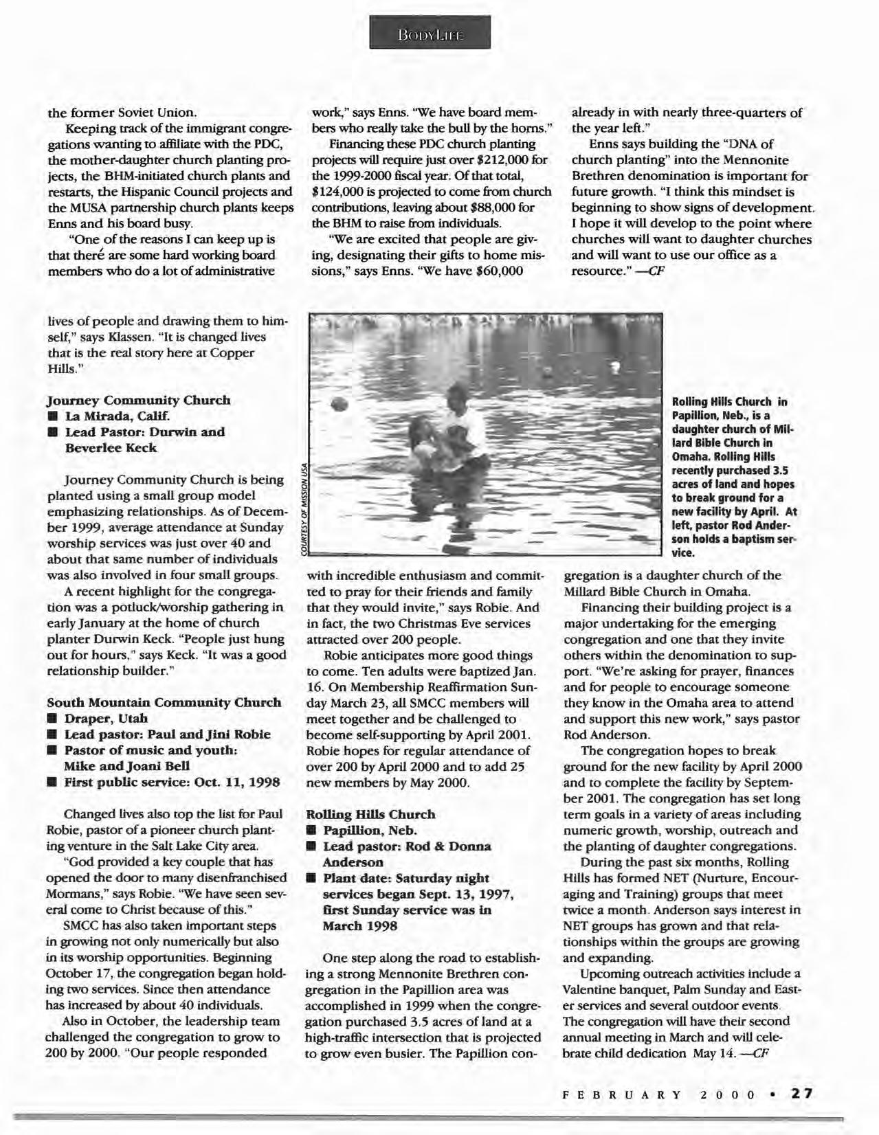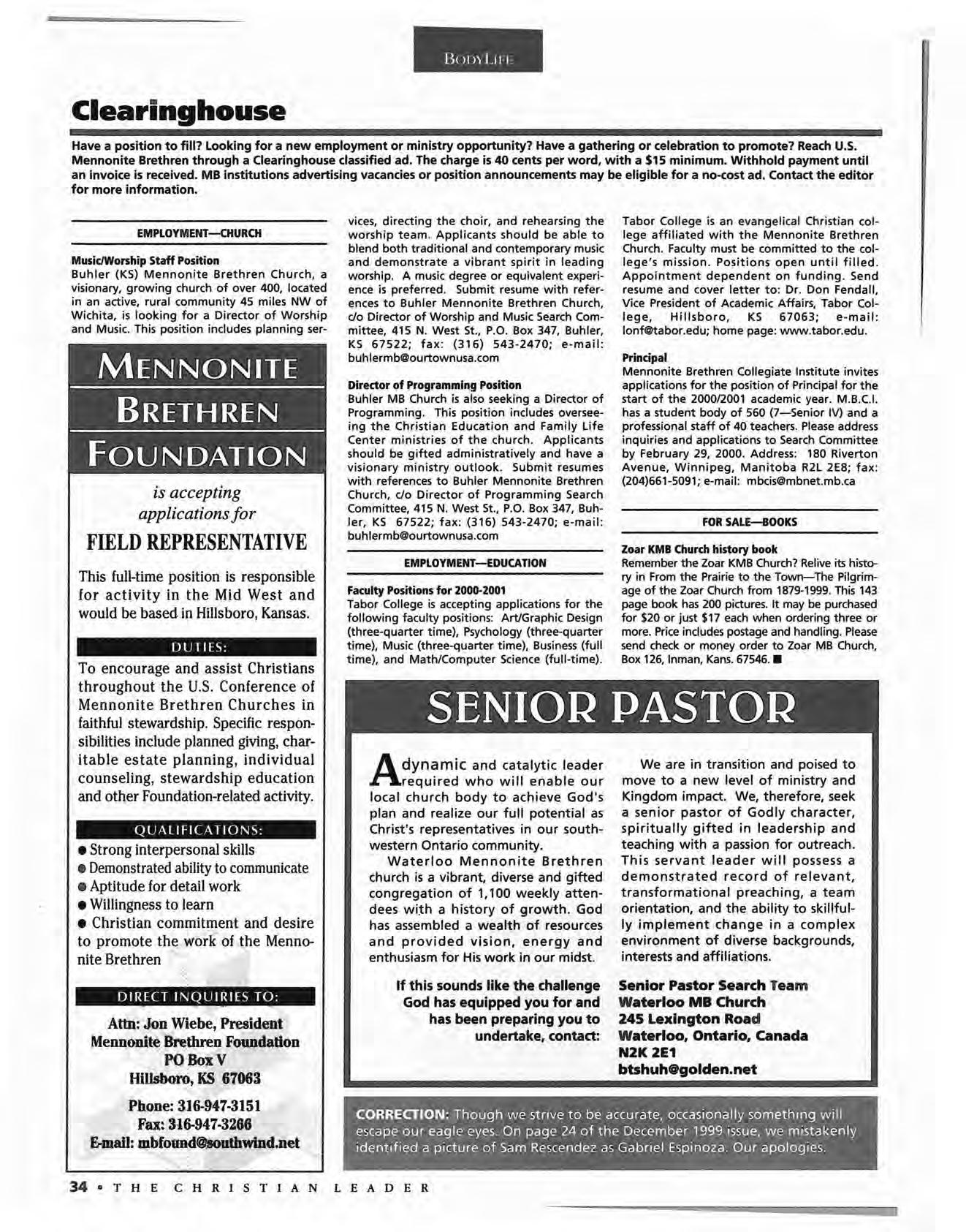 vices, directing the choir, and rehearsing the worship team. Applicants should be able to blend both traditional and contemporary music and demonstrate a vibrant spirit in leading worship. A music degree or equivalent experience is preferred. Submit resume with references to Buhler Mennonite Brethren Church, do Director of Worship and Music Search Committee, 415 N. West St., P.O. Box 347, Buhler, KS 67522; fax: (316) 543-2470; e-mail: buhlermb@ourtownusa.com