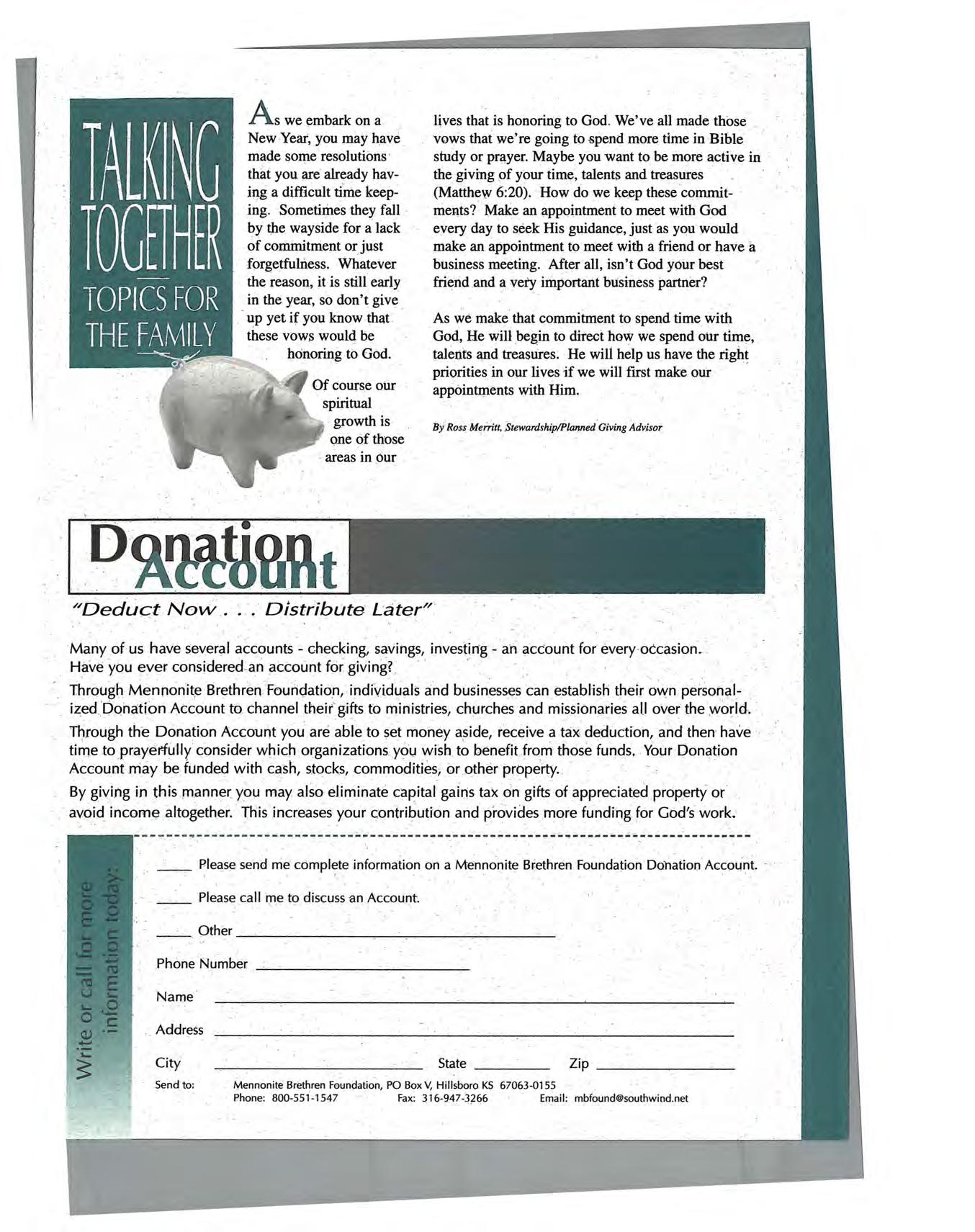 The editors invite free-lance article submissions, essays to Forum and letters to the editor. Forum is open to members or attendees of Mennonite Brethren churches. The essays can address any issue of relevance and interest to the faith and life of the Mennonite Brethren Church and should be no longer than BOO words and include the home church and occupation of the writer. A SASE must accompany articles and forum essays.
