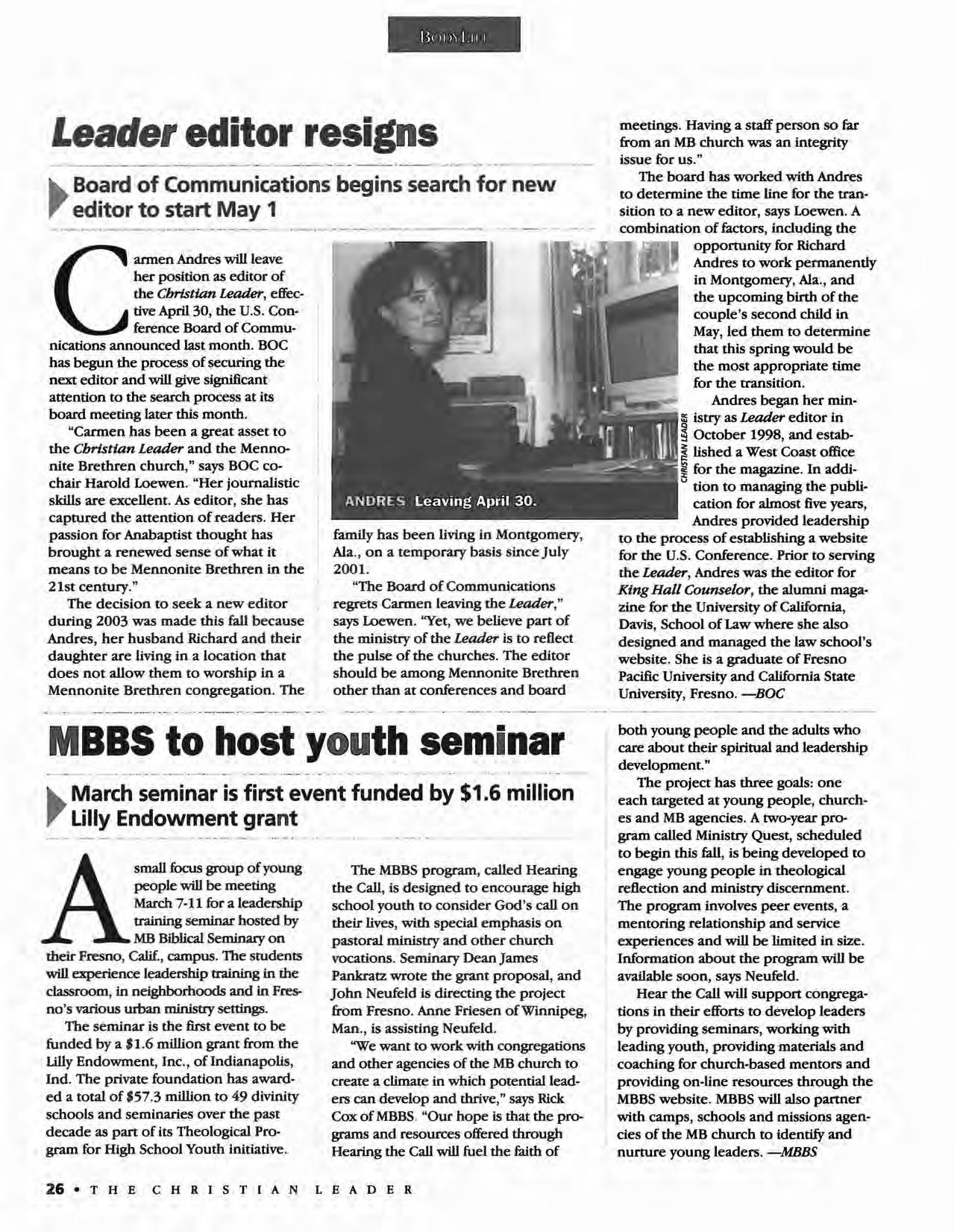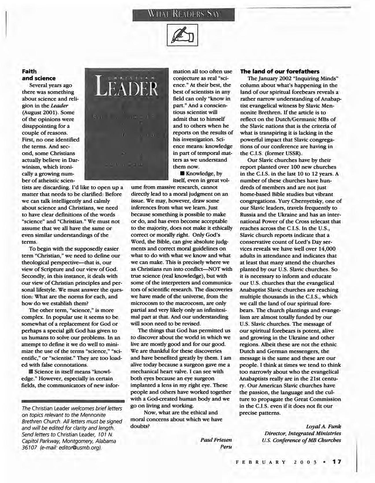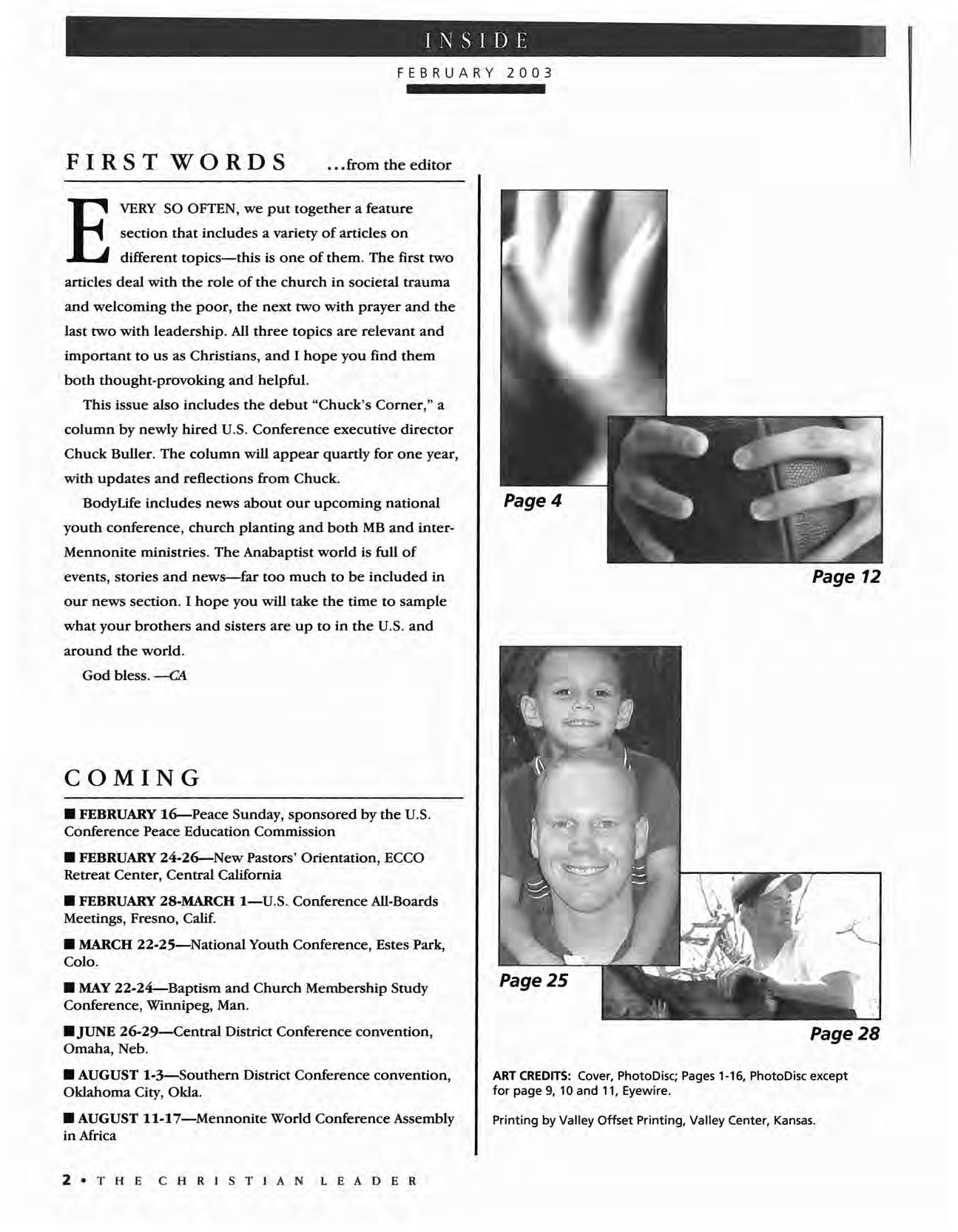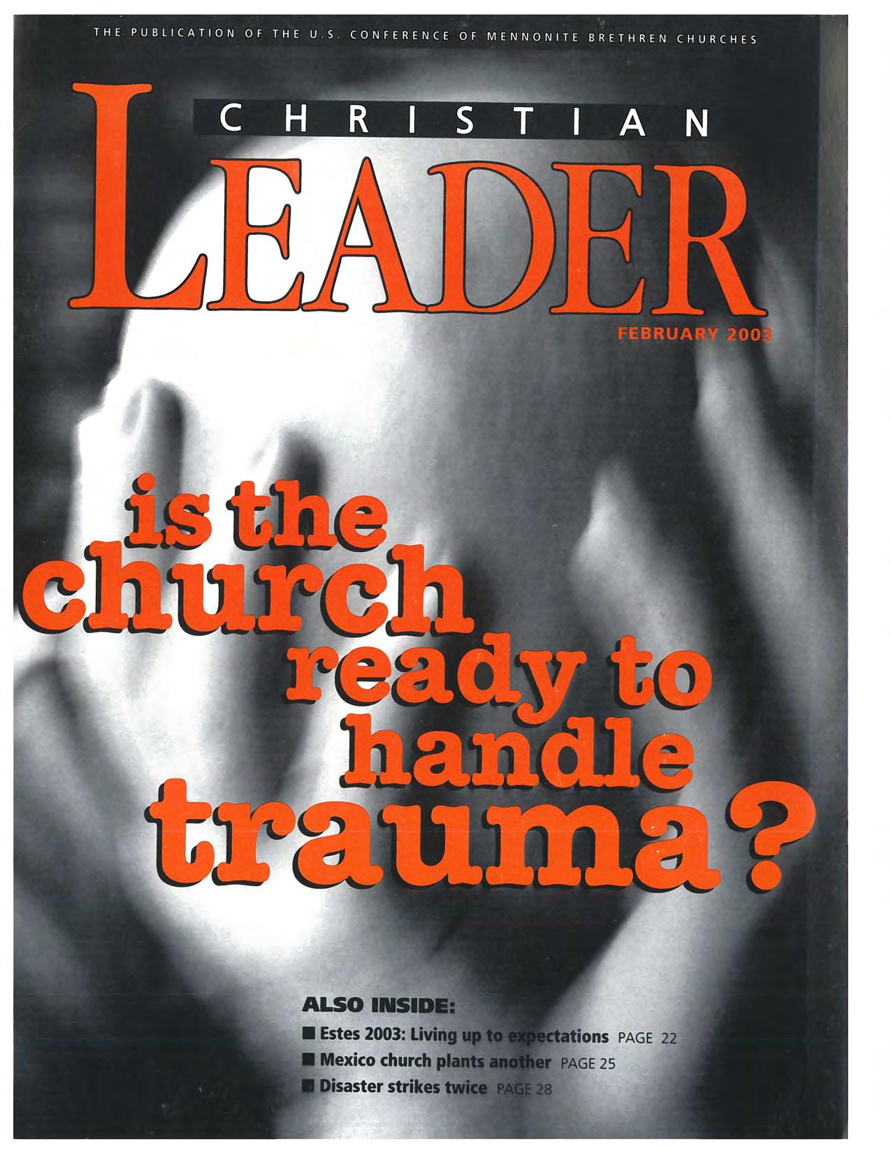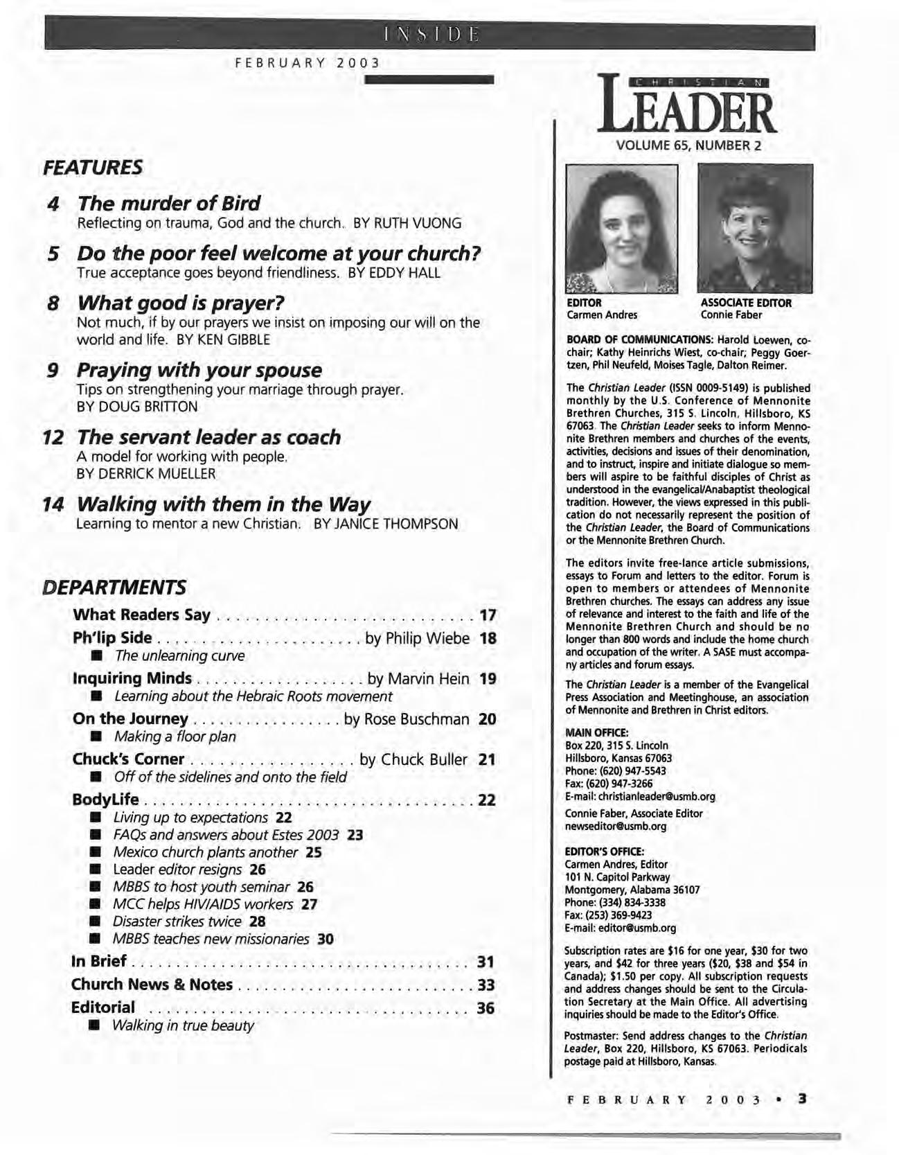 The Christian Leader (ISSN 0009-5149) is published monthly by the U.S. Conference of Mennonite Brethren Churches, 315 S. Lincoln, Hillsboro, KS 67063. The Christian Leader seeks to inform Mennonite Brethren members and churches of the events, activities, decisions and issues of their denomination, and to instruct, inspire and initiate dialogue so members will aspire to be faithful disciples of Christ as understood in the evangelicaVAnabaptist theological tradition. However, the views expressed in this publication do not necessarily represent the position of the Christian Leader, the Board of Communications or the Mennonite Brethren Church.