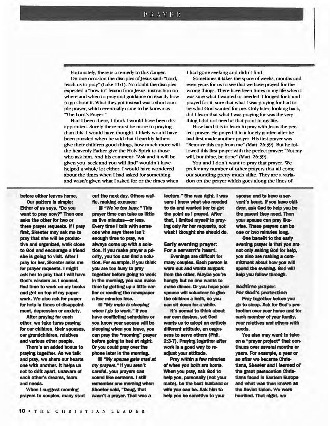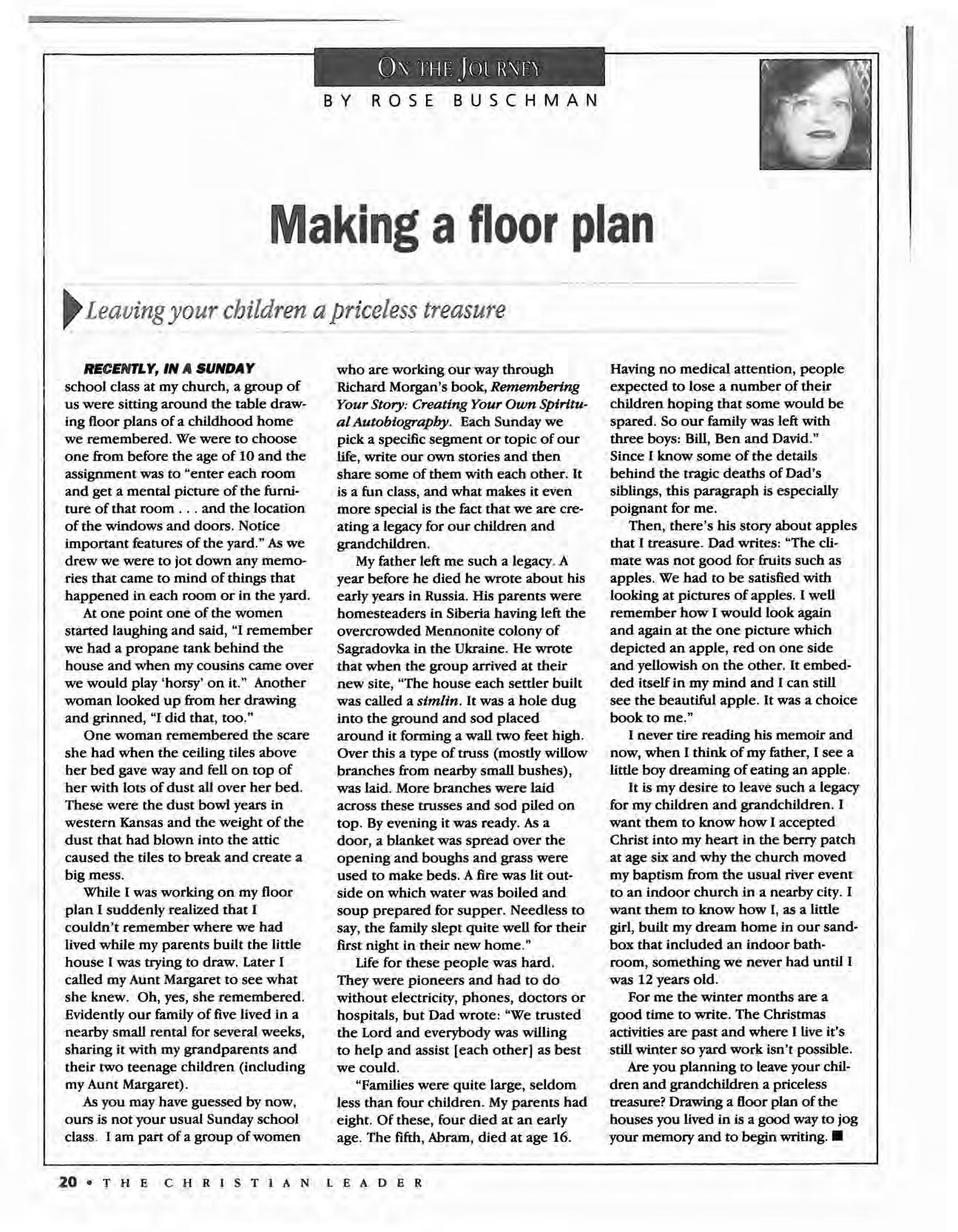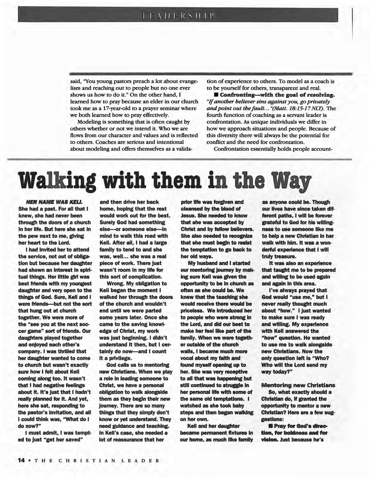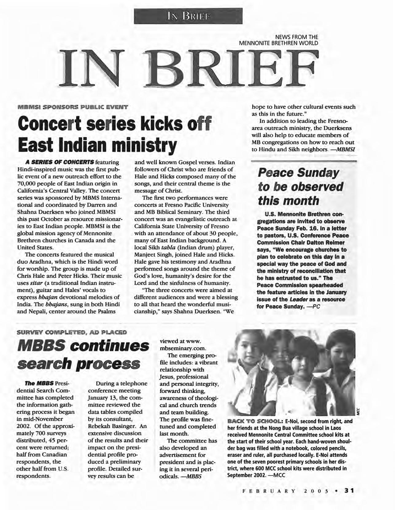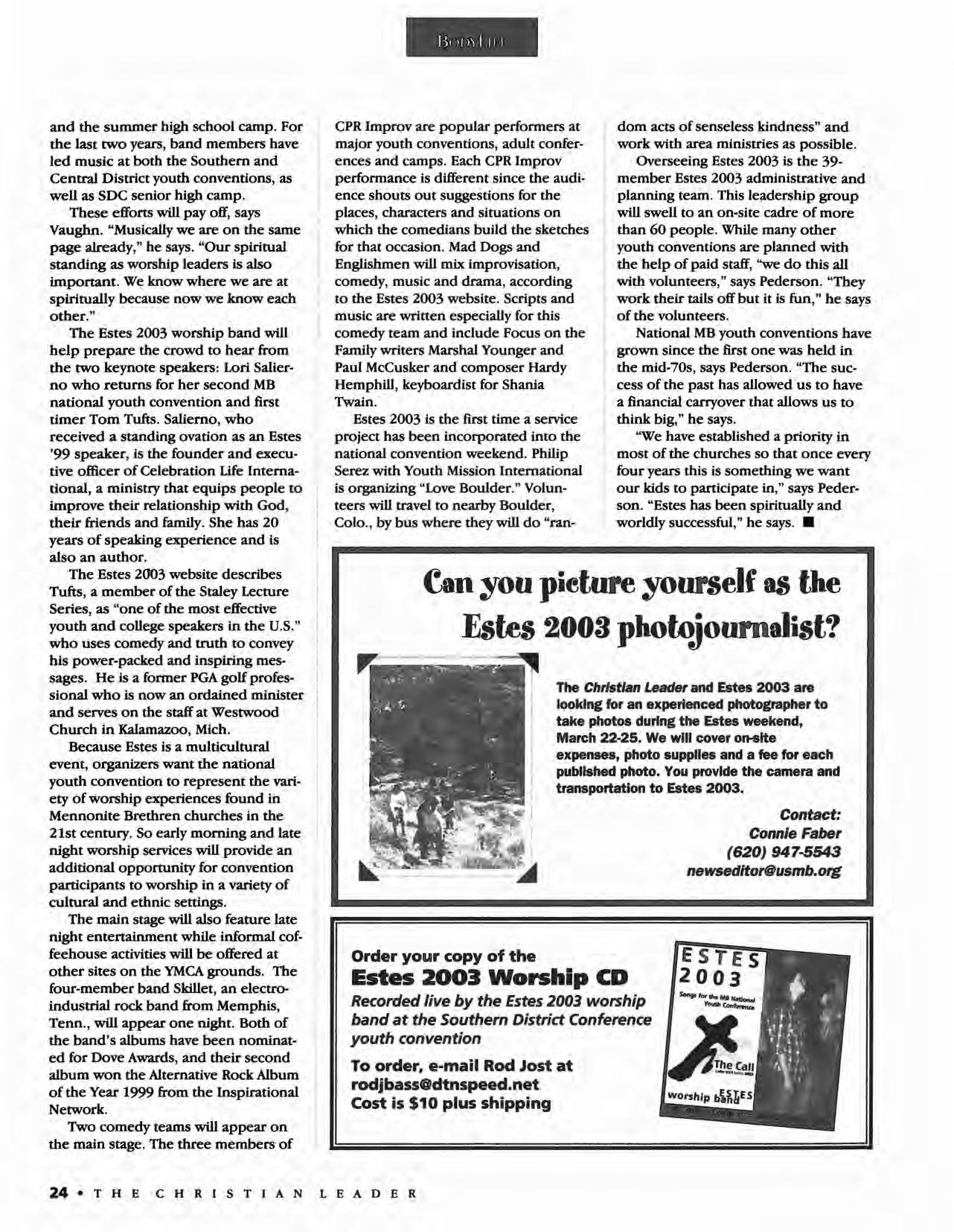 The Christian Leader (ISSN 0009-5149) is published monthly by the U.S. Conference of Mennonite Brethren Churches, 315 S. Lincoln, Hillsboro, KS 67063. The Christian Leader seeks to inform Mennonite Brethren members and churches of the events, activities, decisions and issues of their denomination, and to instruct, inspire and initiate dialogue so members will aspire to be faithful disciples of Christ as understood in the evangelicaVAnabaptist theological tradition. However, the views expressed in this publication do not necessarily represent the position of the Christian Leader, the Board of Communications or the Mennonite Brethren Church.