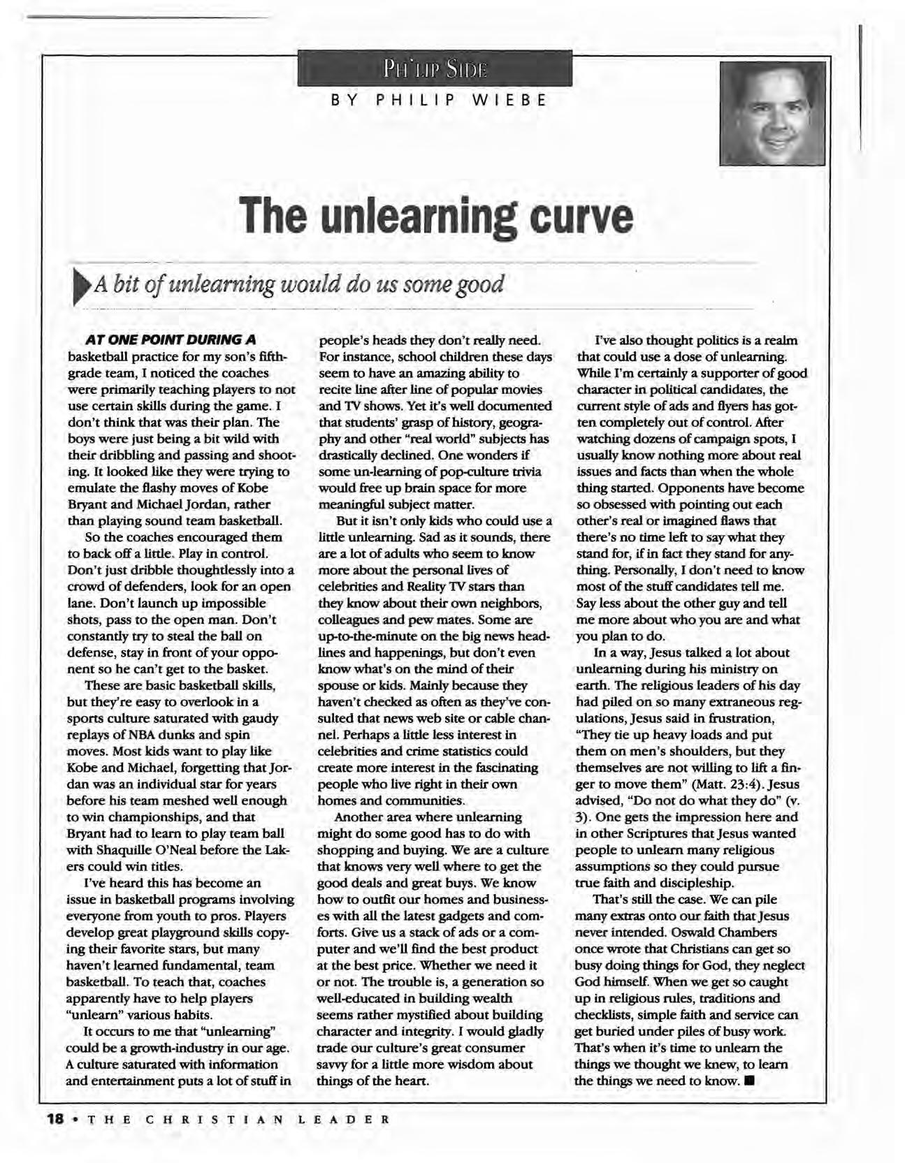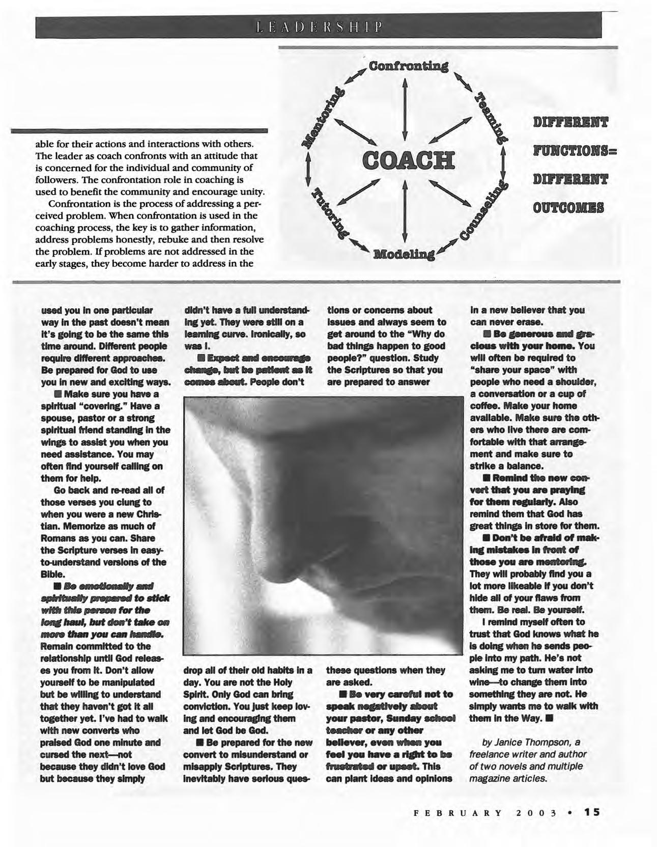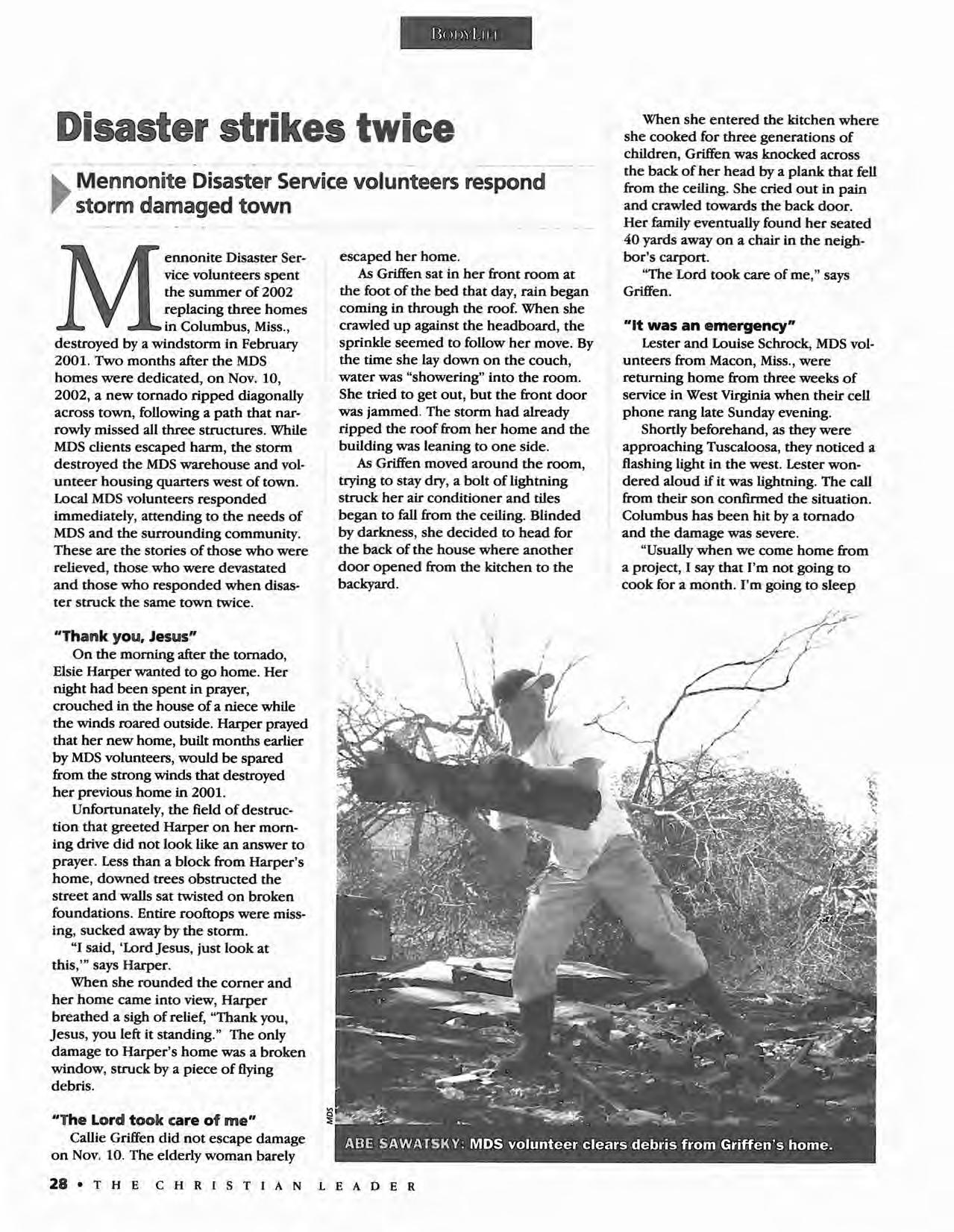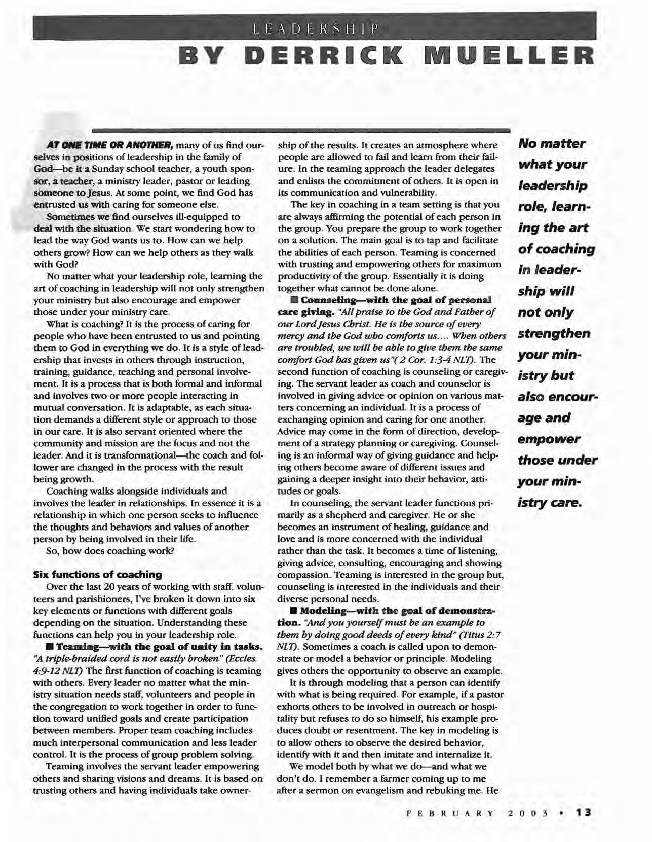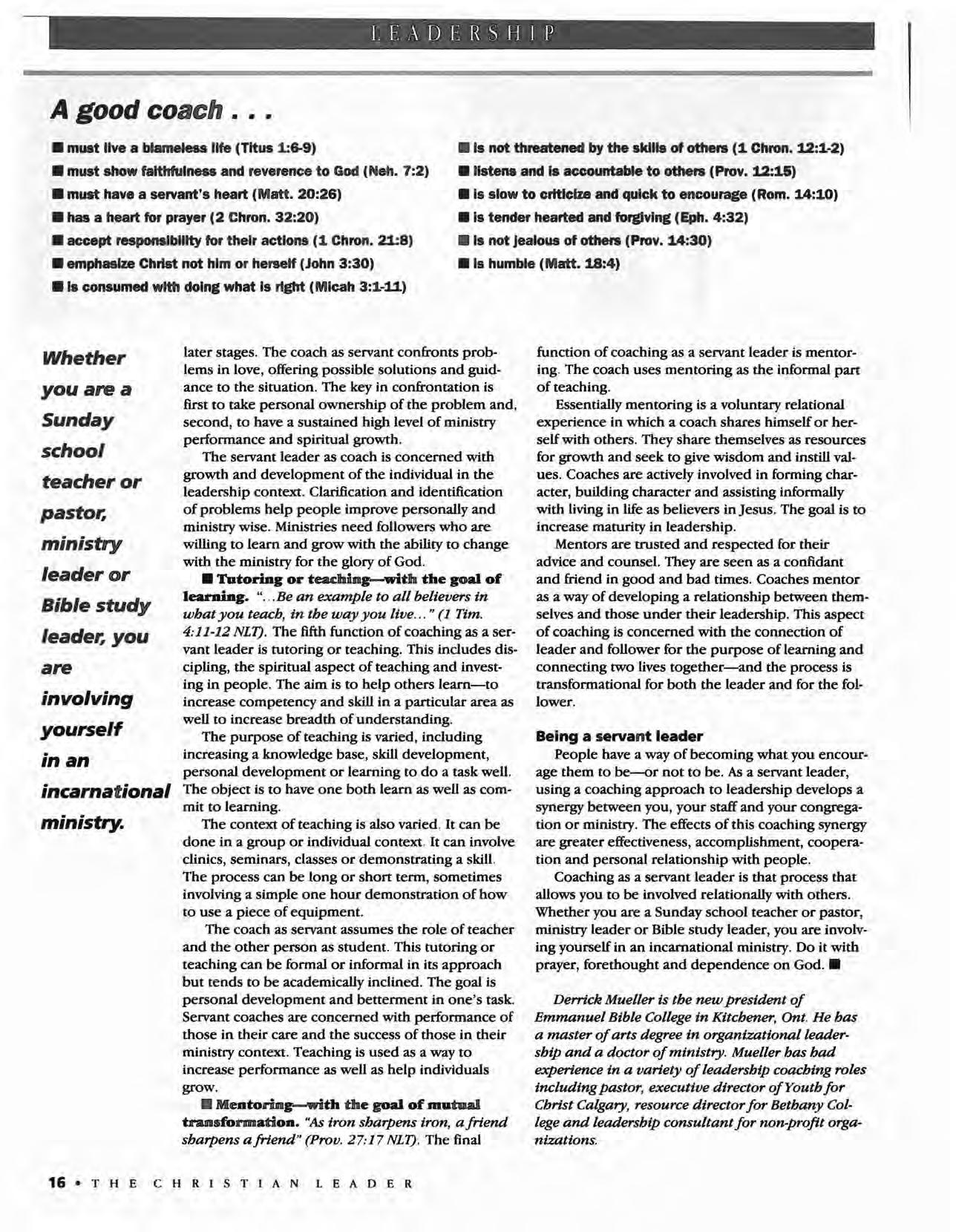 The Christian Leader (ISSN 0009-5149) is published monthly by the U.S. Conference of Mennonite Brethren Churches, 315 S. Lincoln, Hillsboro, KS 67063. The Christian Leader seeks to inform Mennonite Brethren members and churches of the events, activities, decisions and issues of their denomination, and to instruct, inspire and initiate dialogue so members will aspire to be faithful disciples of Christ as understood in the evangelicaVAnabaptist theological tradition. However, the views expressed in this publication do not necessarily represent the position of the Christian Leader, the Board of Communications or the Mennonite Brethren Church.