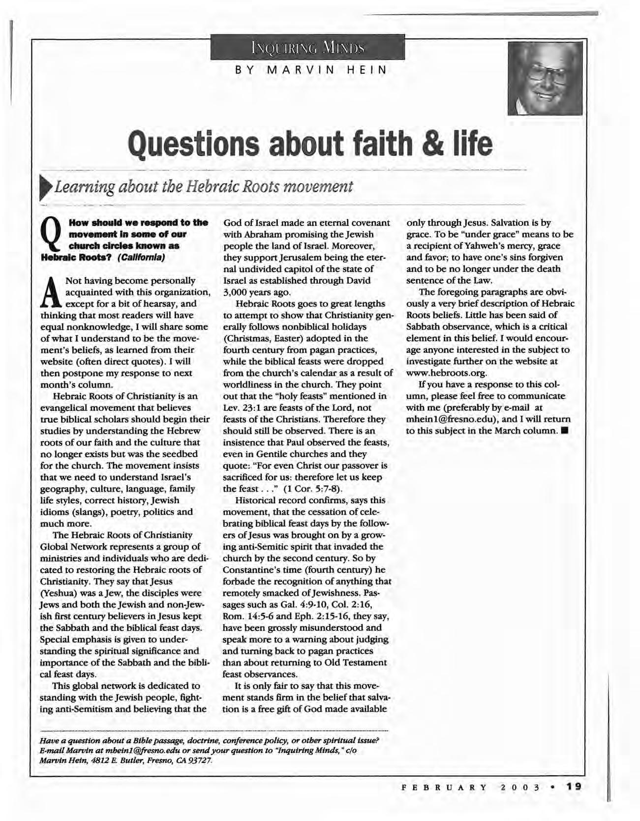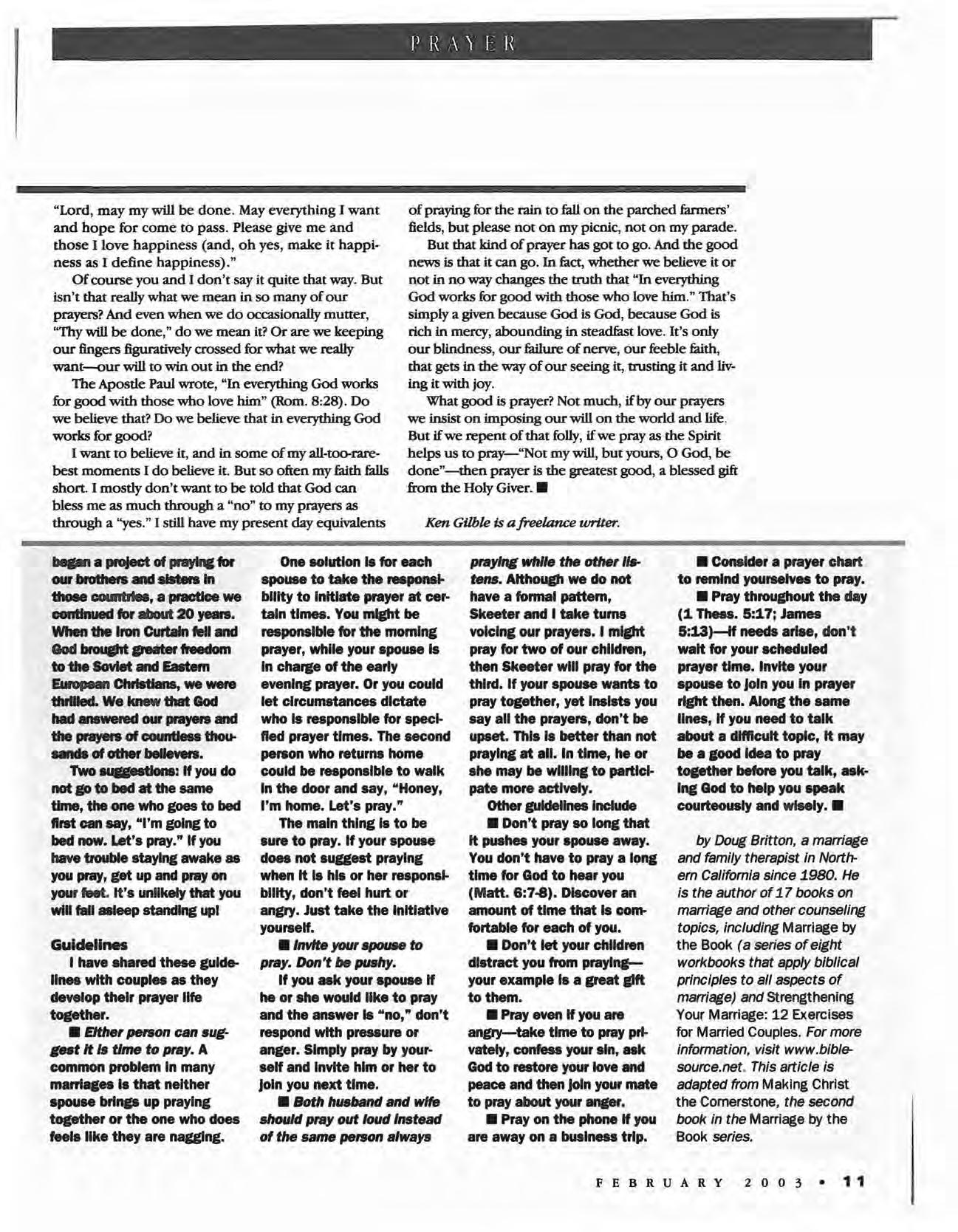 Ulysses. Kan.-Pastor Nate Gift has challenged the congregation to join him in reading through the Bible in 2003. Calendar prayer guides were distributed and Gift has promised a free dinner to everyone who meets the goal. Fresno. Calif. (Bethany)-The congregation's adult ministries hosted a conference on spiritual warfare Jan. 12-13. The guest speaker was Pierre Gilbert, faculty member at MB Biblical Seminary and Canadian Menno-nite University of Winnipeg, Man.