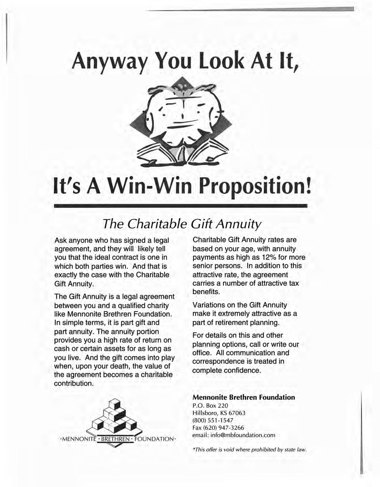 The Gift Annuity is alegal agreement between you and a qualified charity like Mennonite Brethren Foundation. In simple terms, it is part gift and part annuity. The annuity portion provides you a high rate of return on cash or certain assets for as long as you live. And the gift comes into play when, upon your death, the value of the agreement becomes a charitable contribution.