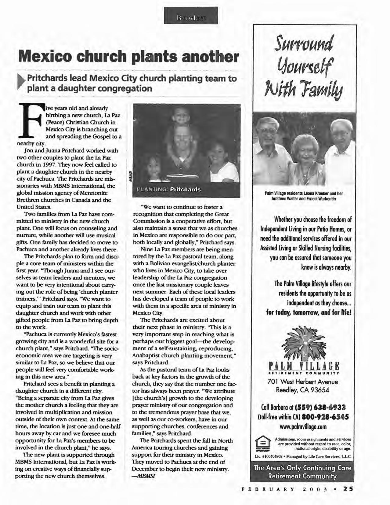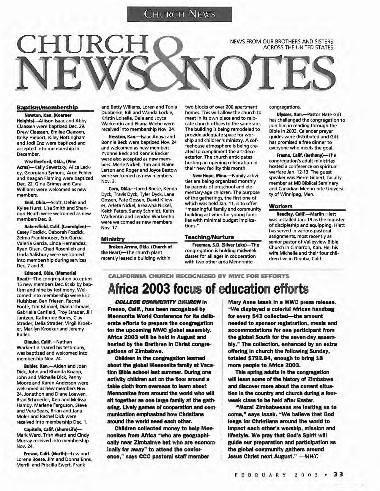 COLLEGE COIIIIMUNITY CHURCH In Fresno, Calif., has been recognized by Mennonite World Conference for Its deliberate efforts to prepare the congregation for the upcoming MWC global assembly. Africa 2003 will be held In August and hosted by the Brethren In Christ congregations of Zimbabwe.