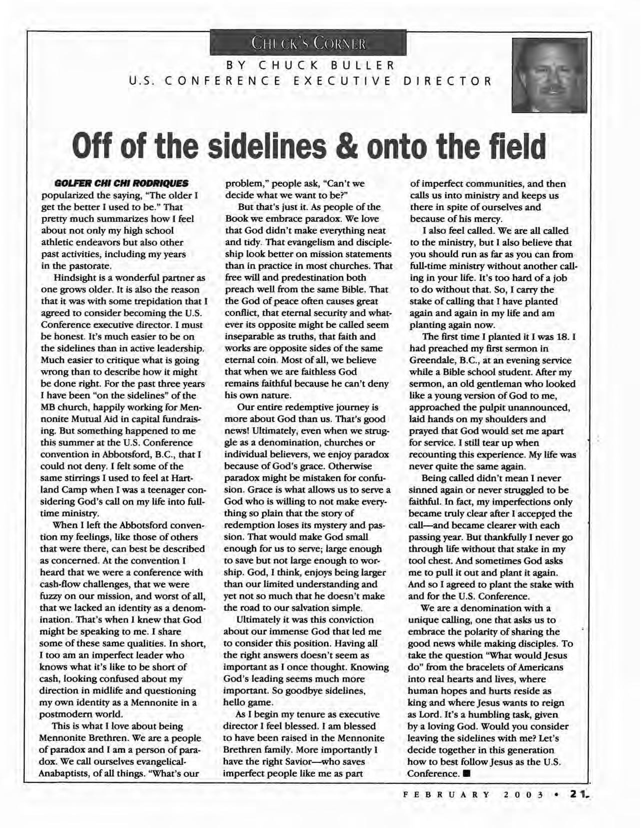 This issue also includes the debut "Chuck's Corner," a column by newly hired u.S. Conference executive director Chuck Buller. The column will appear quartly for one year, with updates and reflections from Chuck.