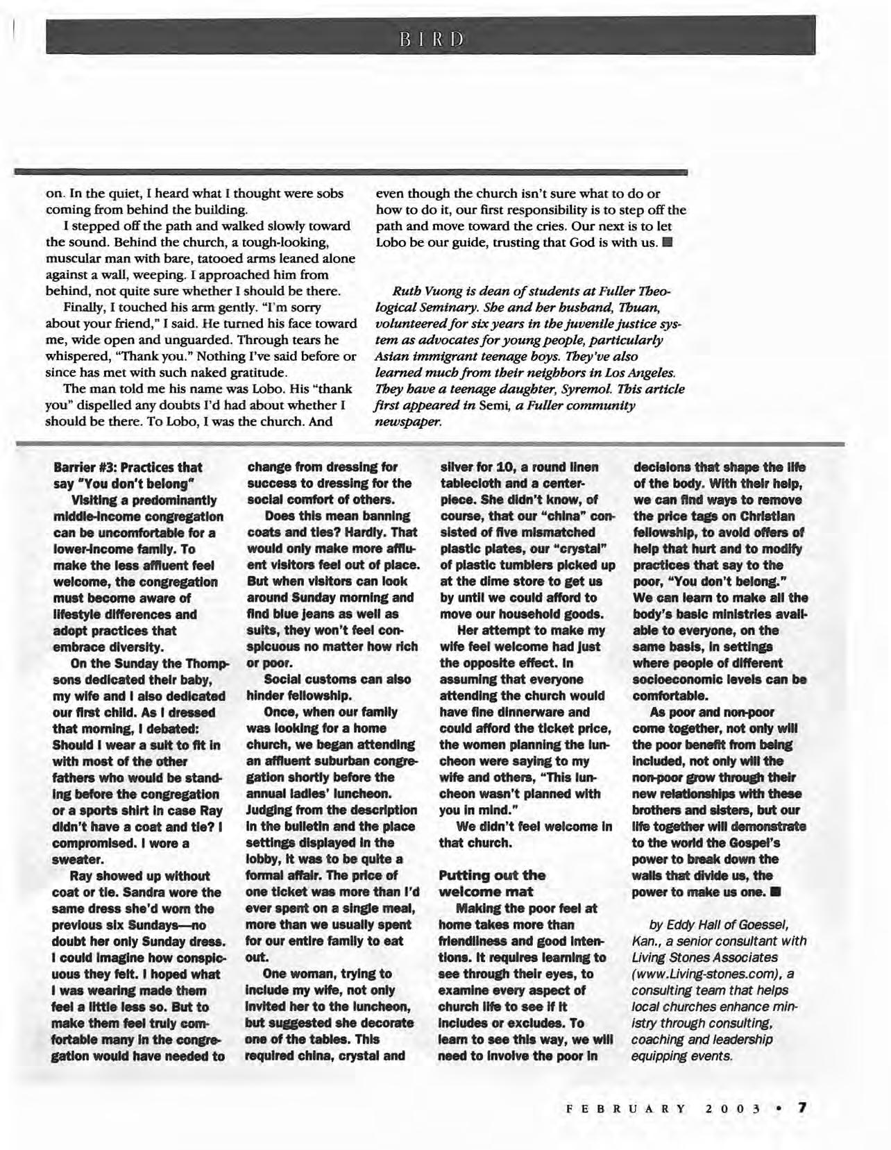 Though we had worshiped at the church for years, we'd never noticed the barriers. In fact, we could now see how we had unknowingly raised similar barriers In a youth program we had directed In that very church. Only when we saw the church through the eyes of the poor did these banters tHacome visible.