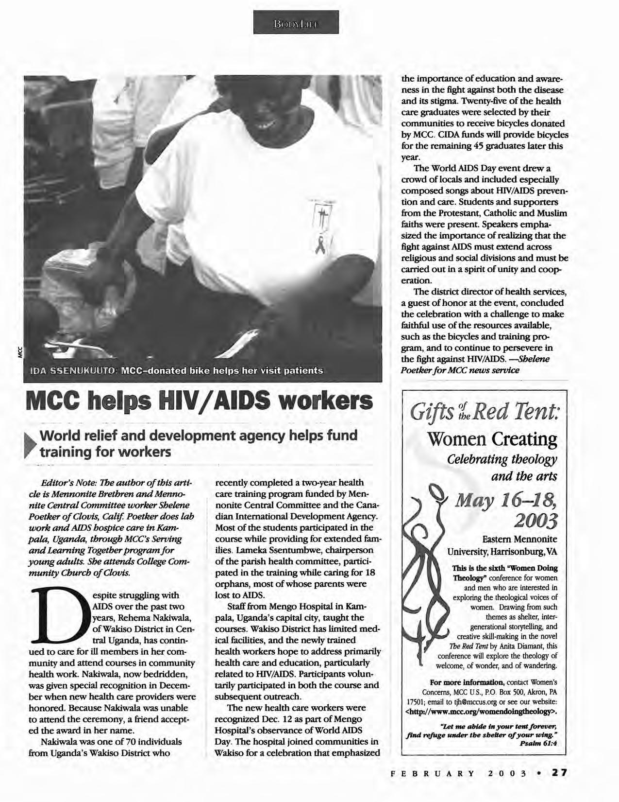 Mary Anne Isaak In a MWC press release. "We displayed a colorful African handbag for every $43 collected-the amount needed to sponsor registration, meals and accommodations for one participant from the global South for the seven-day assembly." The collection, enhanced by an extra offering In church the following Sunday, totaled $792.84, enough to bring 18 more people to Africa 2003.