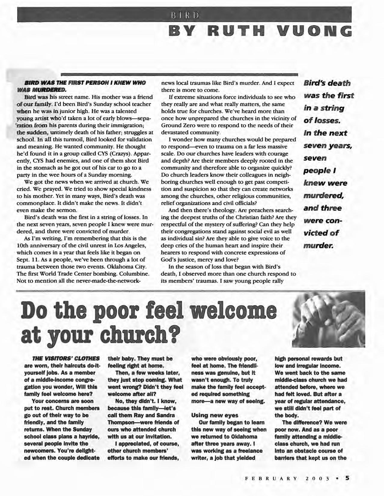 EVERY SO OFTEN, we put together a feature section that includes a variety of articles on different topics-this is one of them. The first two articles deal with the role of the church in societal trauma and welcoming the poor, the next two with prayer and the last two with leadership. All three topics are relevant and important to us as Christians, and I hope you find them both thought-provoking and helpful.