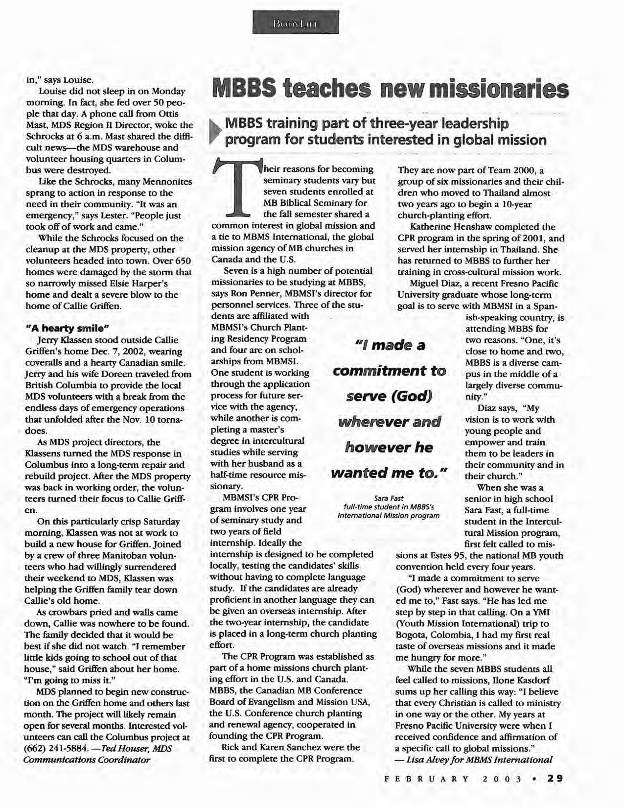 BodyLife includes news about our upcoming national youth conference, church planting and both MB and interMennonite ministries. The Anabaptist world is full of events, stories and news-far too much to be included in our news section. I hope you will take the time to sample what your brothers and sisters are up to in the u.S. and around the world.