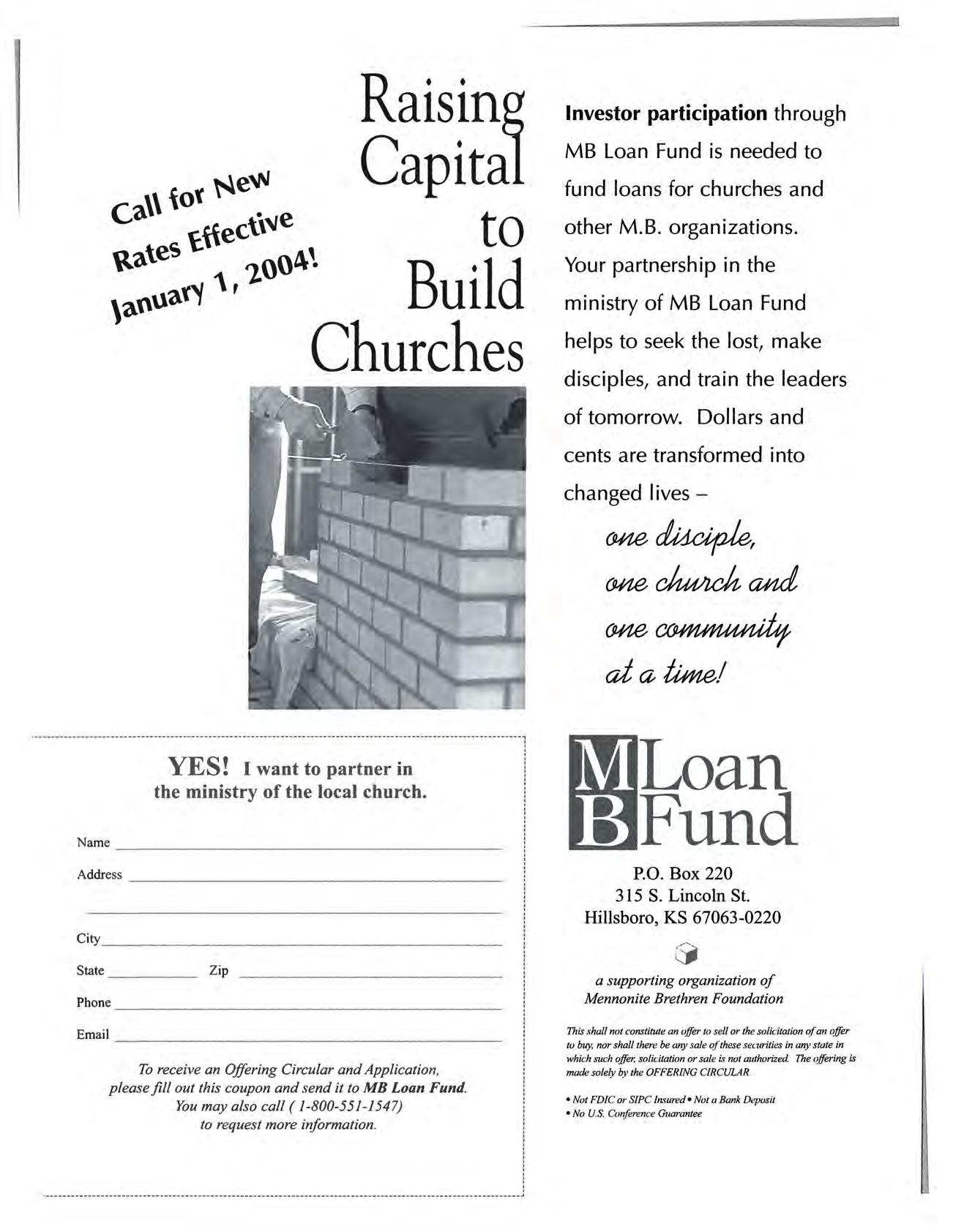 Investor participation through MB Loan Fund is needed to fund loans for churches and other M.B. organizations. Your partnership in the ministry of MB Loan Fund helps to seek the lost, make disciples, and train the leaders of tomorrow. Dollars and cents are transformed into changed livescltwtoh and at a tune!