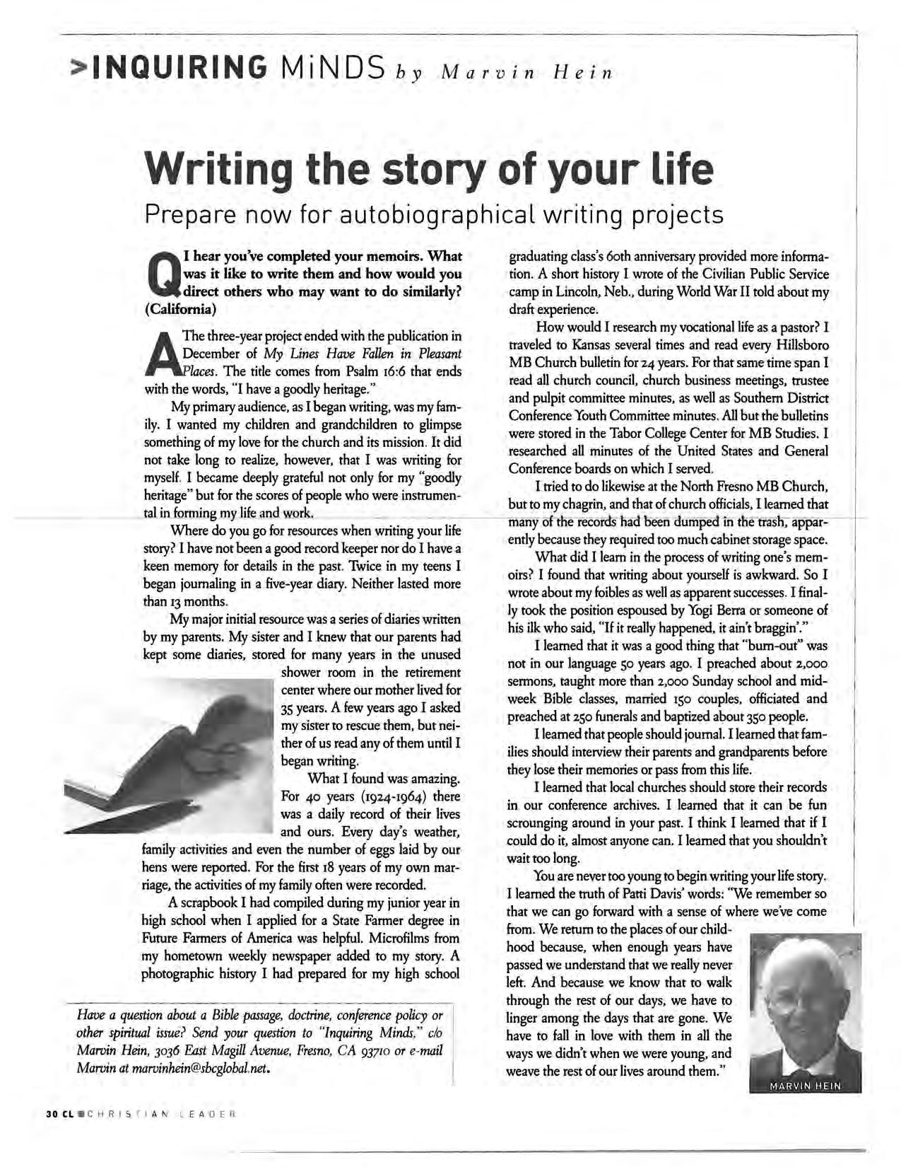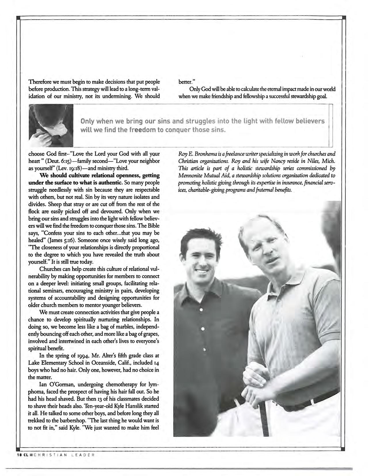 EDITORIAL POLICY The views expressed in thi s publi cation do not necessarily repre sent the position of th e Christian L eader the U.S. Conference Leader ship Board or the Mennonite Brethren Church Scripture references are from New International Version unless otherwise noted The editors invite freelance article submissions. A SASE must accompany articles