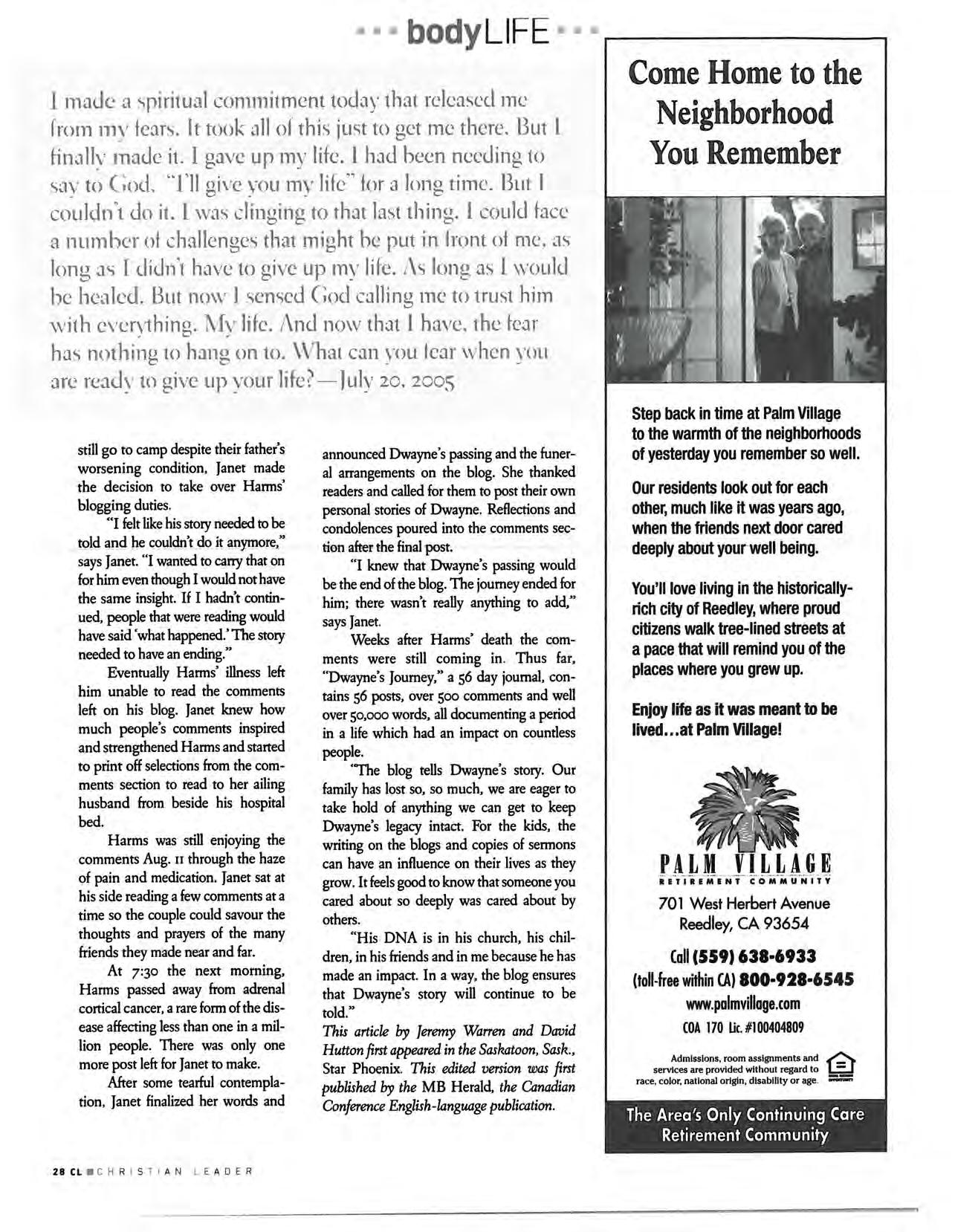 Blogging is a new and popular fonn of communication among young adults. Leader staff have been looking for an opportunity to highlight blogging in the magazine. Thanks to a reprint from the MB Herald, our sister Canadian publication, this month you can read about Mennonite Brethren pastor Dwayne Hanns who used a blog to talk candidly about his battle with cancer (see story page 26). As a follow-up, we would like to publish an article about the experiences of other MB bloggers. If you are a blogger or know a MB who blogs and would like to help us with the research for this article, please contact us at editor@usmb.org.