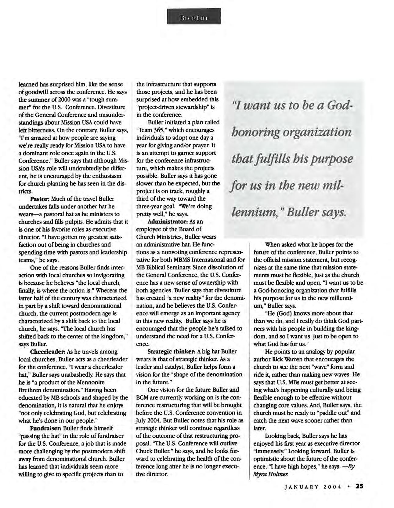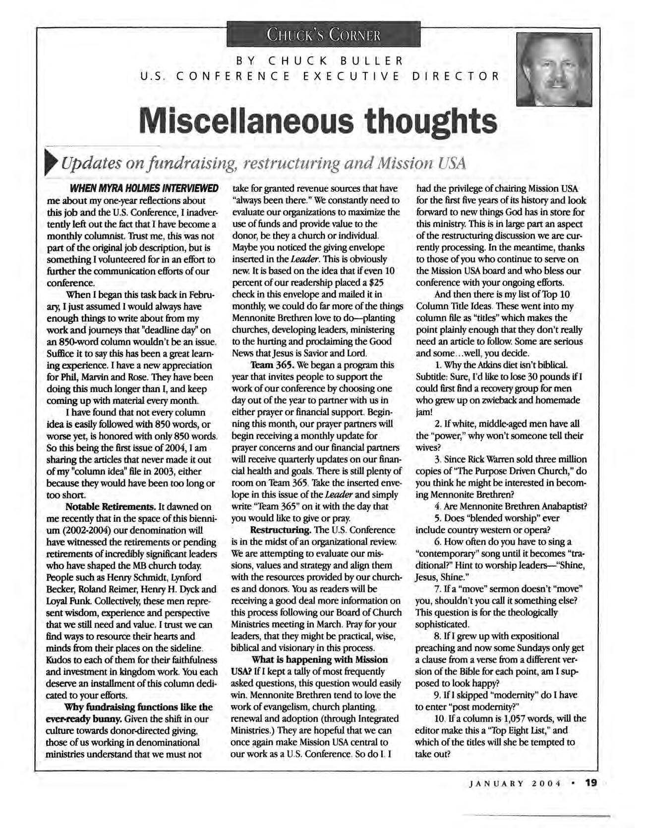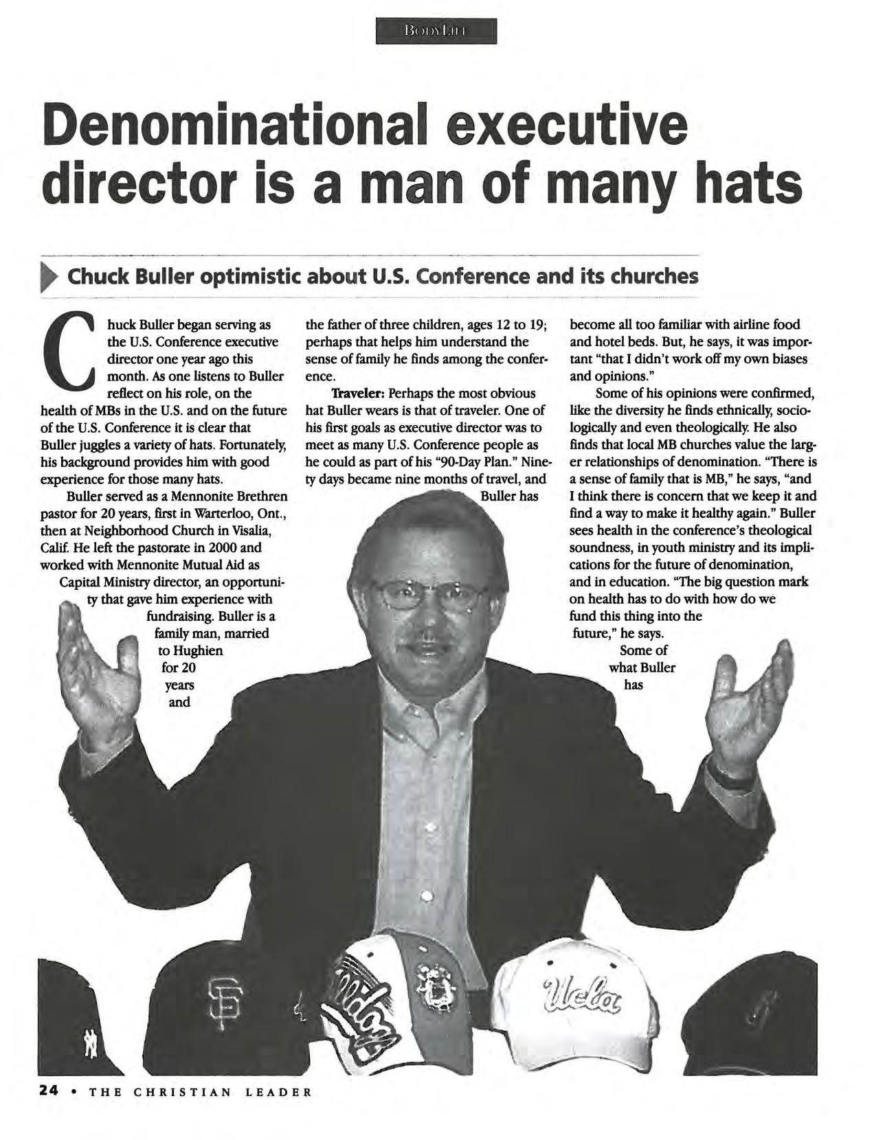 This month marks the one-year anniversary of Chuck Buller's appointment as the U S Conference executive director. The denomination has done without a fulltime lead staff member for many years and we wondered what roles Buller found himself filling this first year and what impressions he's developed as he's traveled among U.S. churches. Typical of Buller's schedule, Leader writer Myra Holmes and Buller first visited at the Denver airport as Buller was between flights and then again by phone