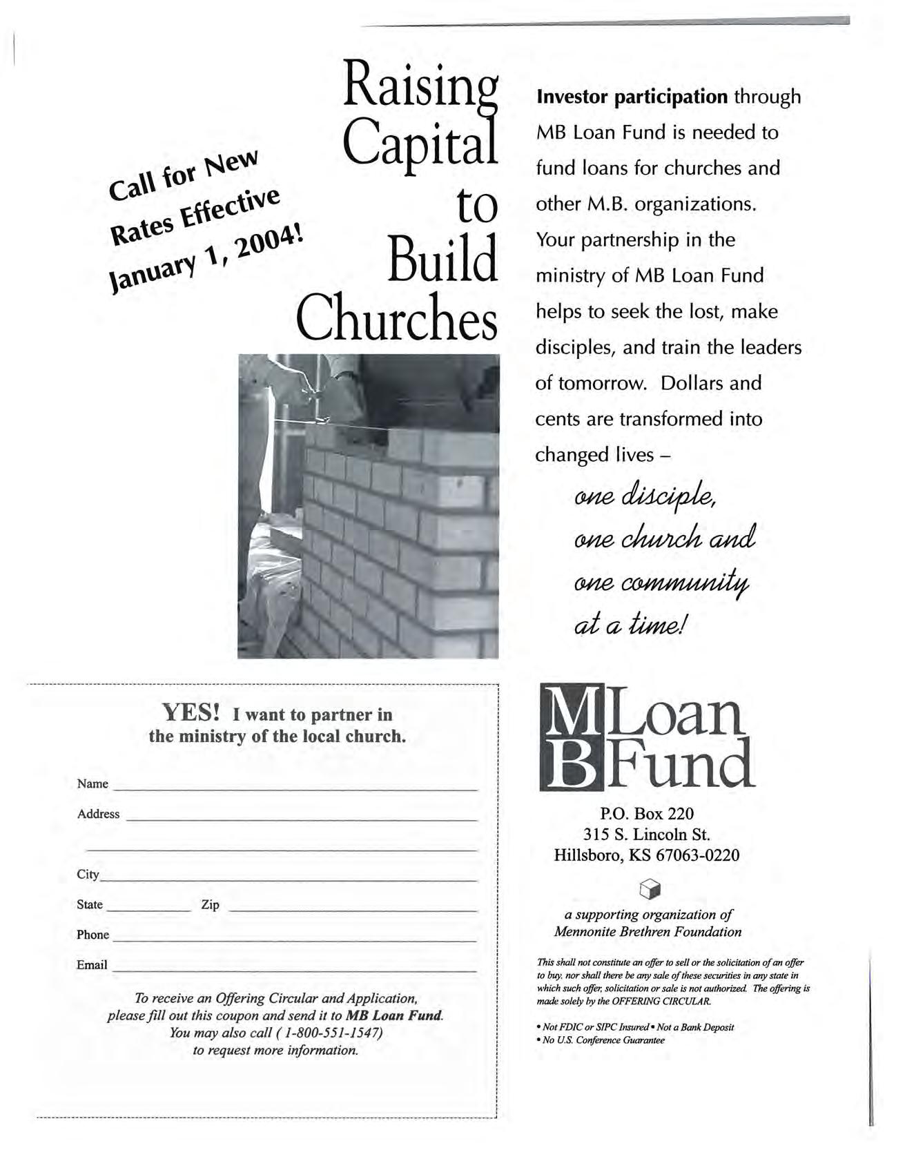 Investor participation through MB Loan Fund is needed to fund loans for churches and other M.B. organizations. Your partnership in the ministry of MB Loan Fund helps to seek the lost, make disciples, and train the leaders of tomorrow. Dollars and cents are transformed into changed lives -