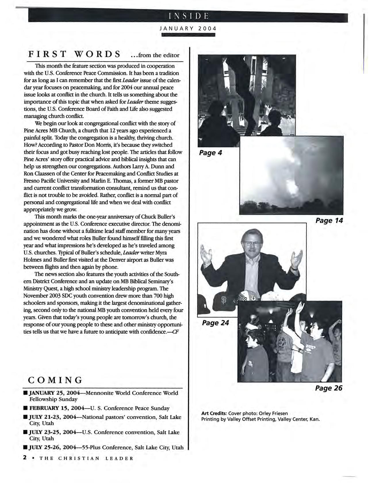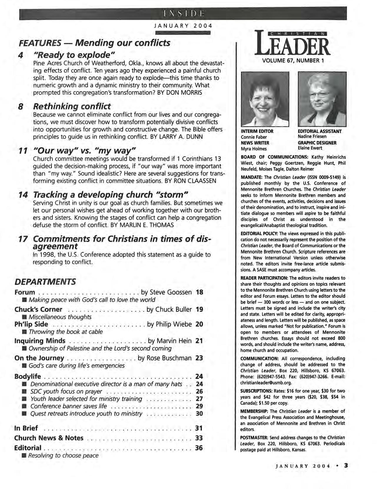 This month the feature section was produced in cooperation with the u.s. Conference Peace Commission. It has been a tradition for as long as I can remember that the first Leader issue of the calendar year focuses on peacemaking, and for 2004 our annual peace issue looks at conflict in the church It tells us something about the importance of this topic that when asked for Leader theme suggestions, the U.S. Conference Board of Faith and llie also suggested managing church conflict.