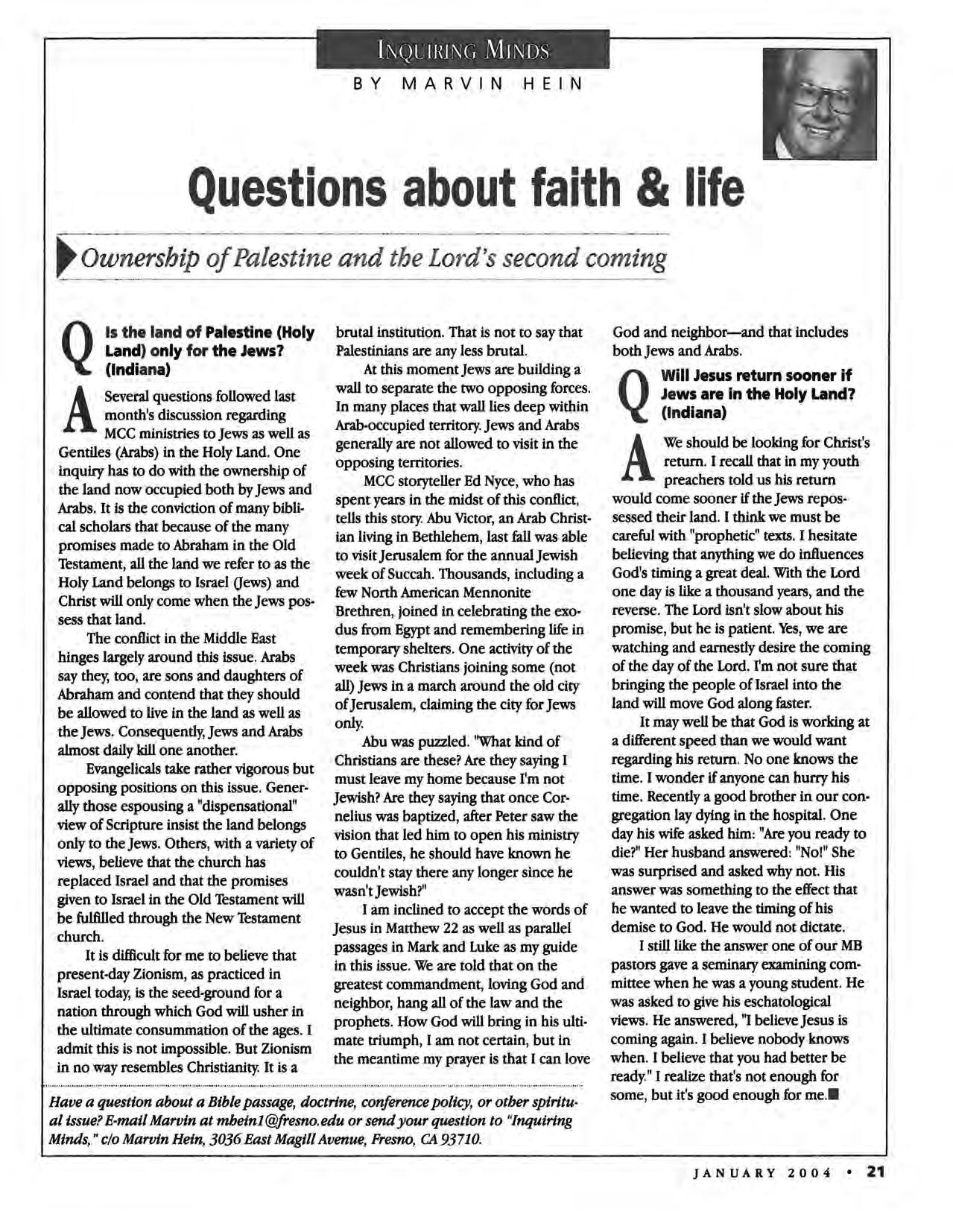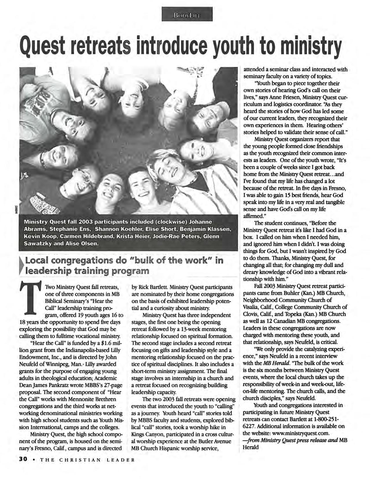 The news section also features the youth activities of the Southern District Conference and an update on MB Biblical Seminary's Ministry Quest, a high school ministry leadership program The November 2003 SDC youth convention drew more than 700 high schoolers and sponsors, making it the largest denominational gathering, second only to the national MB youth convention held every four years. Given that taday's young people are tomorrow's church, the response of our young people to these and other ministry opportunities tells us that we have a future to anticipate with confidence -CF