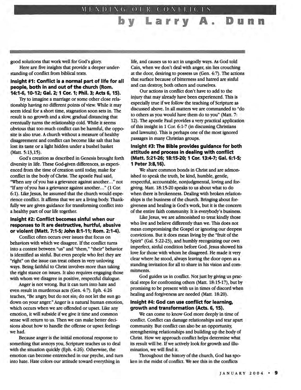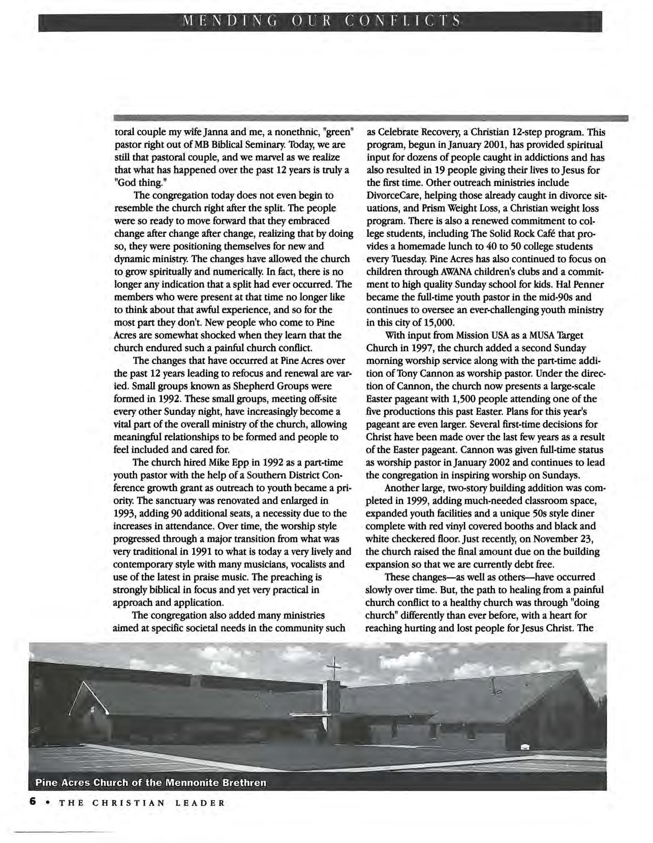 We begin our look at congregational conflict with the story of Pine Acres MB Church , a church that 12 years ago experienced a painful split. Today the congregation is a healthy, thriving church How? According to Pastor Don Morris, it's because they switched their focus and got busy reaching lost people The articles that follow Pine Acres' story offer practical advice and biblical insights that can help us strengthen our congregations Authors Larry A Dunn and Ron Claassen of the Center for Peacemaking and Conflict Studies at Fresno Pacific University and Marlin E. Thomas, a former MB pastor and current conflict transformation consultant, remind us that conflict is not trouble to be avoided . Rather, conflict is a normal part of personal and congregational life and when we deal with conflict appropriately we grow.