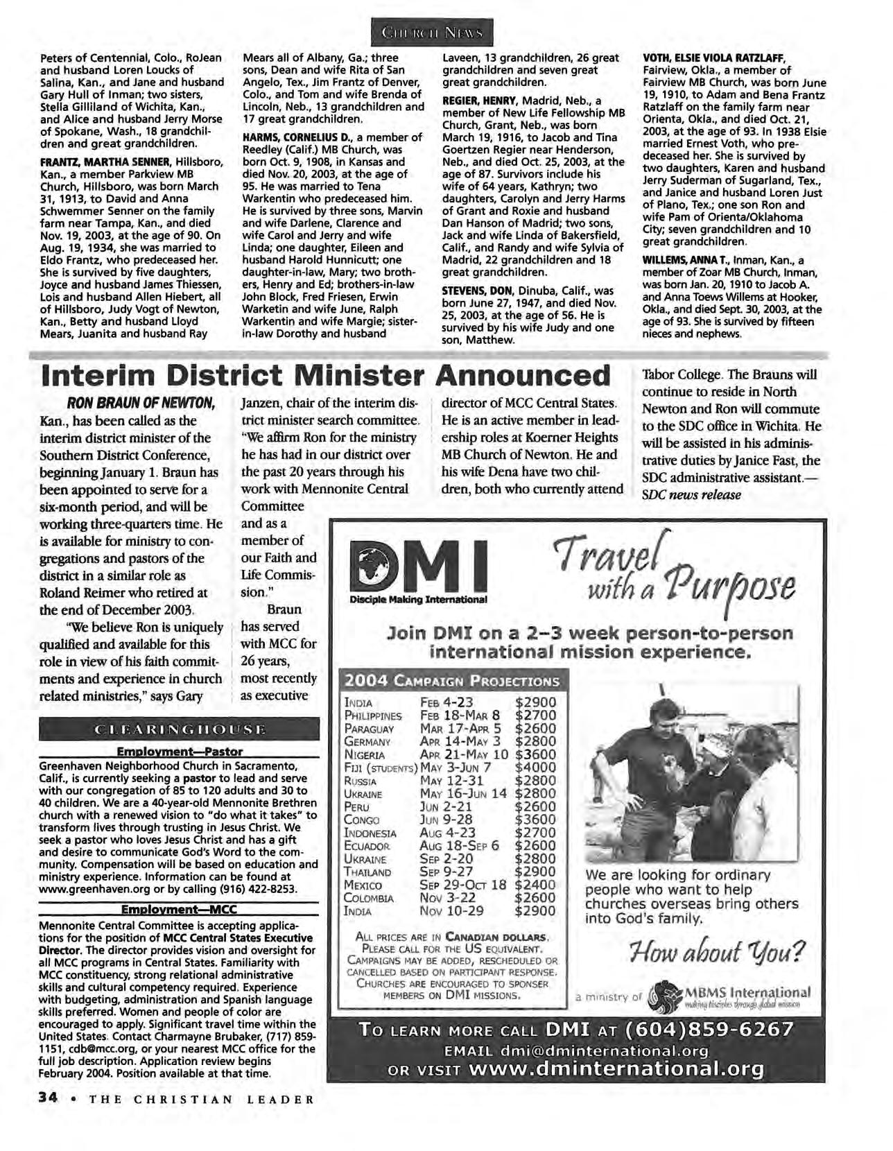 RON BRAUN OF NEWTON, Kan , has been called as the interim district minister of the Southern District Conference, beginning January 1. Braun has been appointed to for a six-month period, and will be working three-quarters time He is available for ministry to congregations and pastors of the district in a similar role as Roland Reimer who retired at the end of December 2003 and as a member of our Faith and Life Commis-