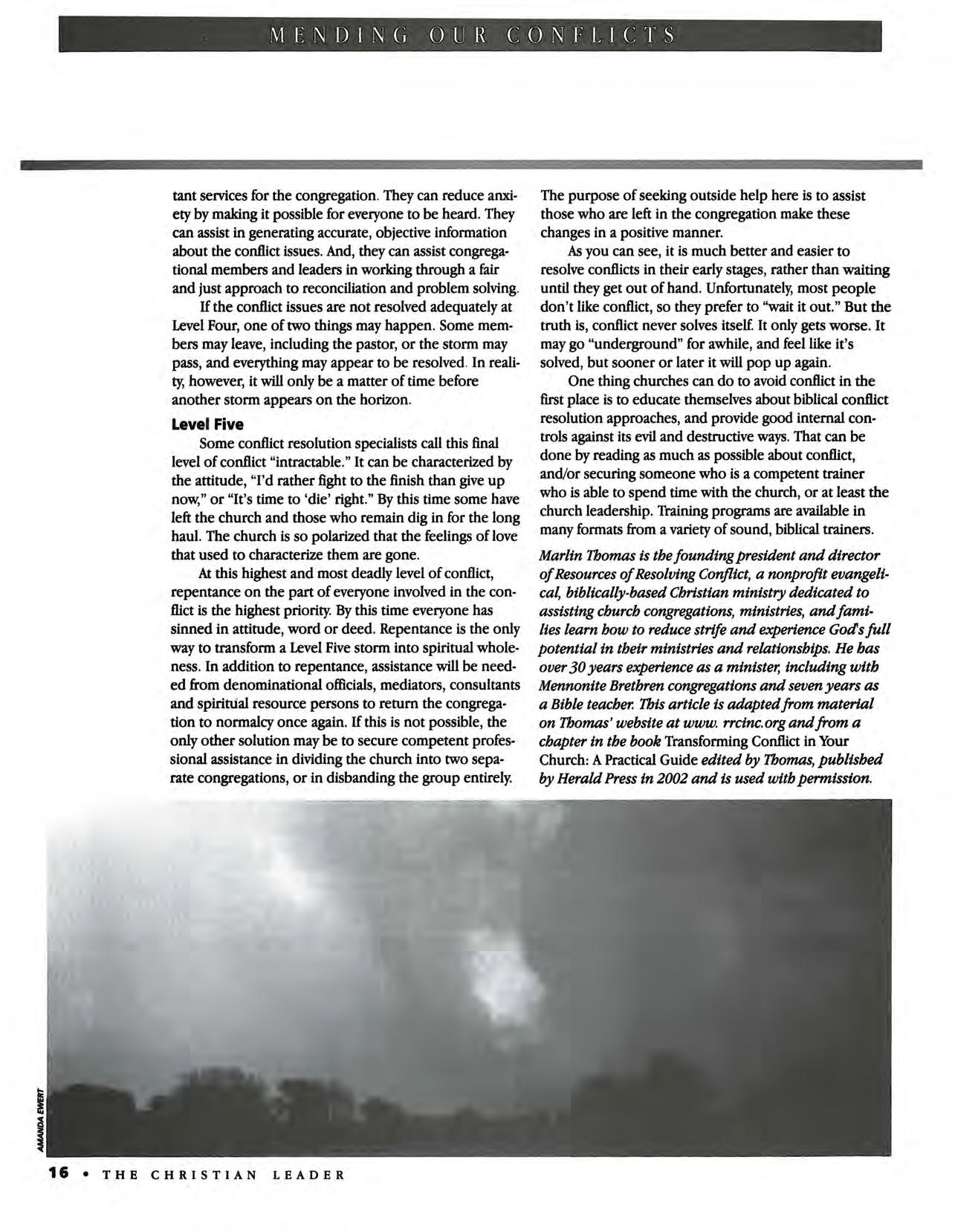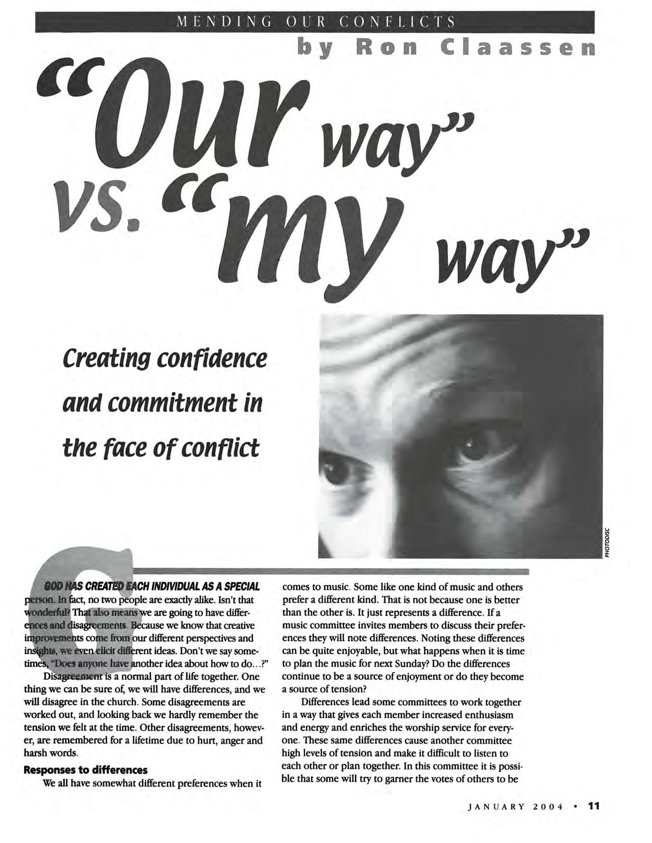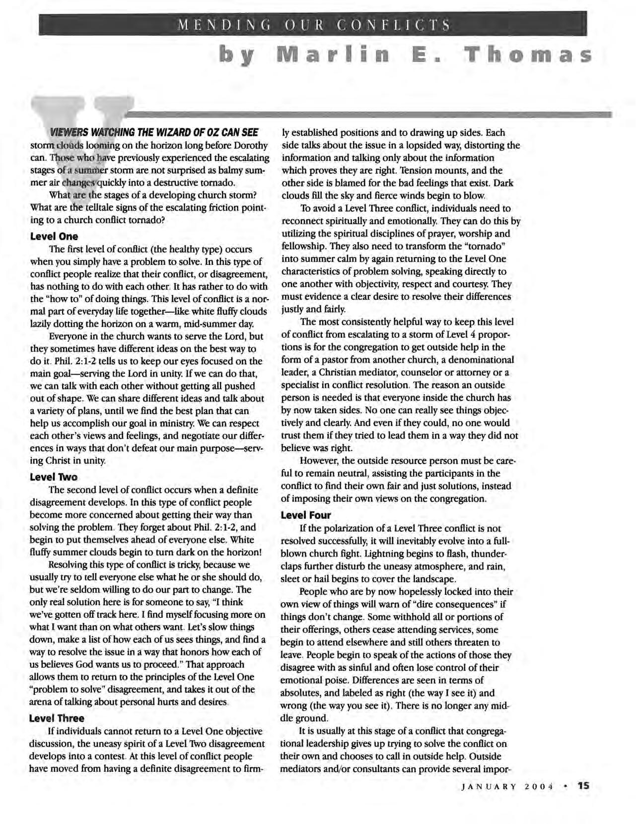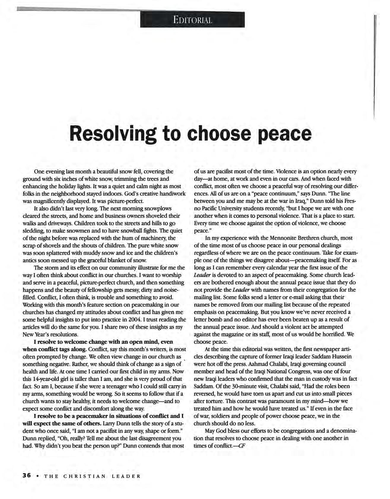 The storm and its effect on our community illustrate for me the way I often think about conflict in our churches. I want to worship and serve in a peaceful, picture-perfect church, and then something happens and the beauty of fellowship gets messy, dirty and noisefilled. Conflict, I often think, is trouble and something to avoid. Working with this month's feature section on peacemaking in our churches has changed my attitudes about conflict and has given me some helpful insights to put into practice in 2004 I trust reading the articles will do the same for you. I share two of these insights as my New Year's resolutions.