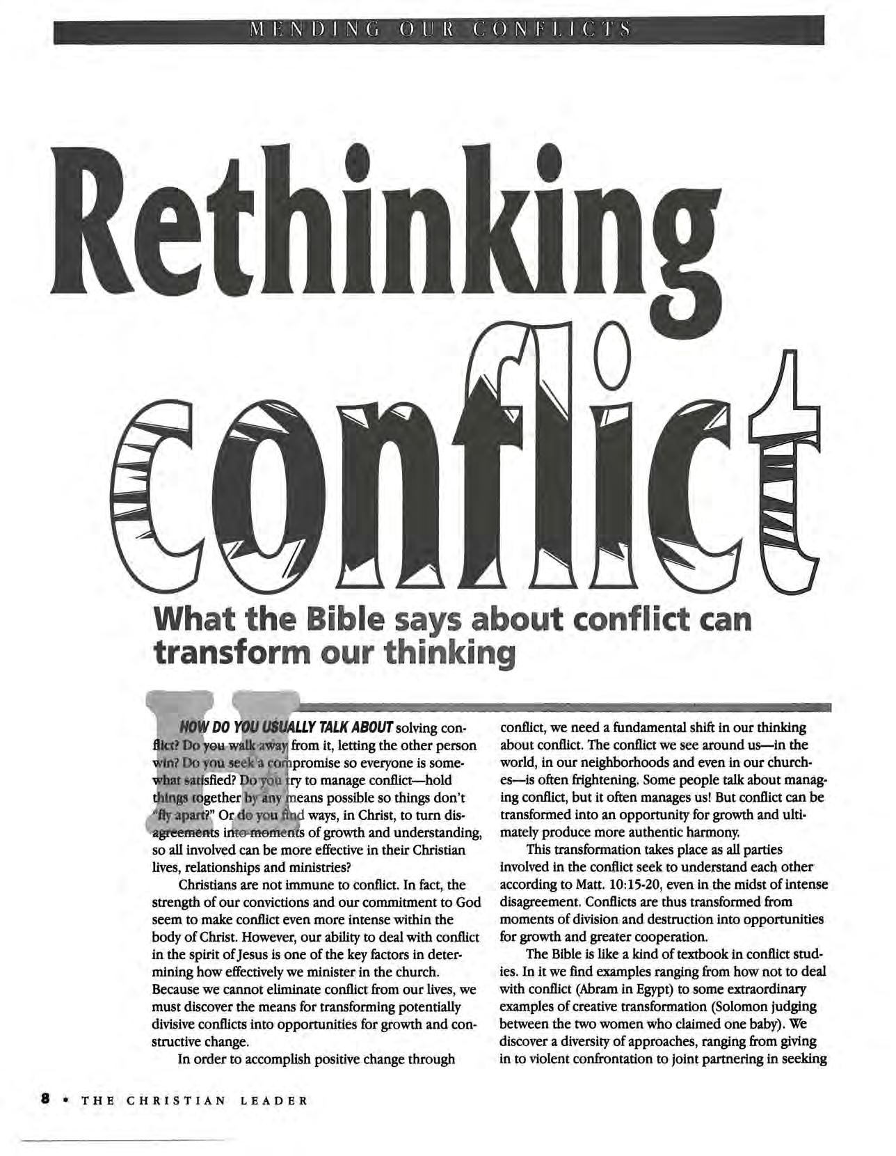 Because we cannot eliminate conflict from our lives and our congregations, we must discover how to transform potentially divisive conflicts into opportunities for growth and constructive change. The Bible offers principles to guide us in rethinking conflict. BY
