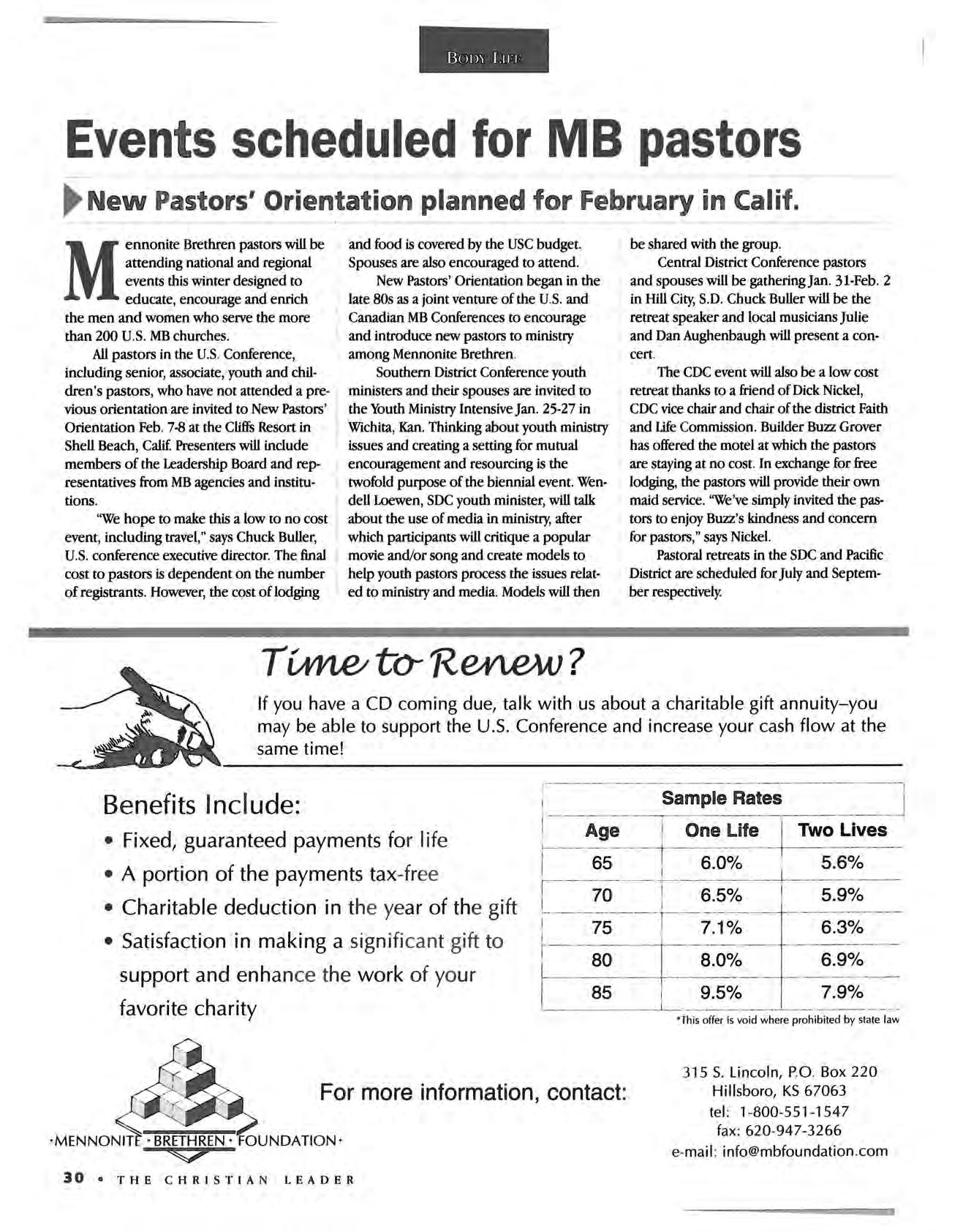 COMMUNICATION: All correspondence, including change of address, should be addressed to the Christian Leader, Box 220, Hillsboro, KS 67063. Phone : (620)947-5543 Fax : (620)947 -3266. E-mail : christianleader@usmb.org