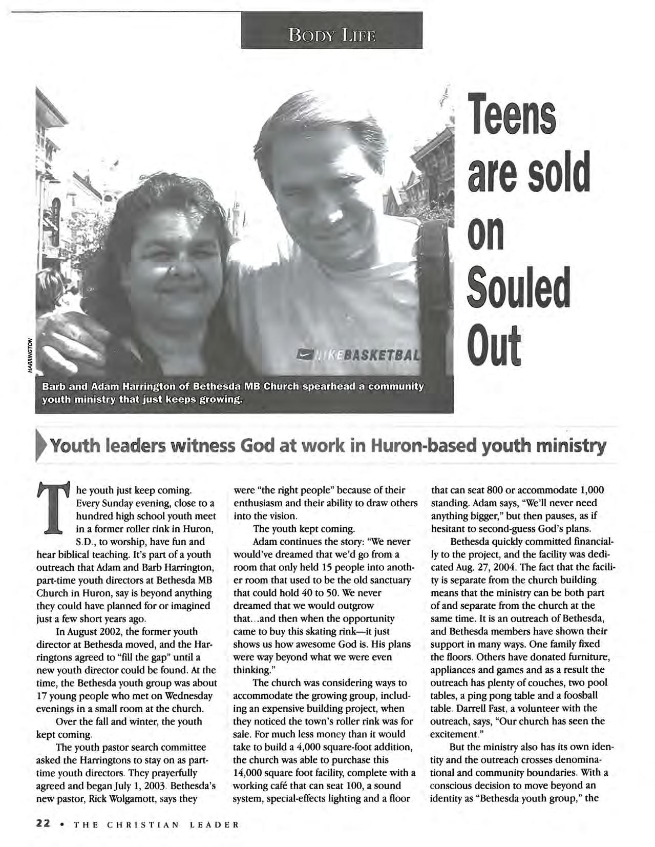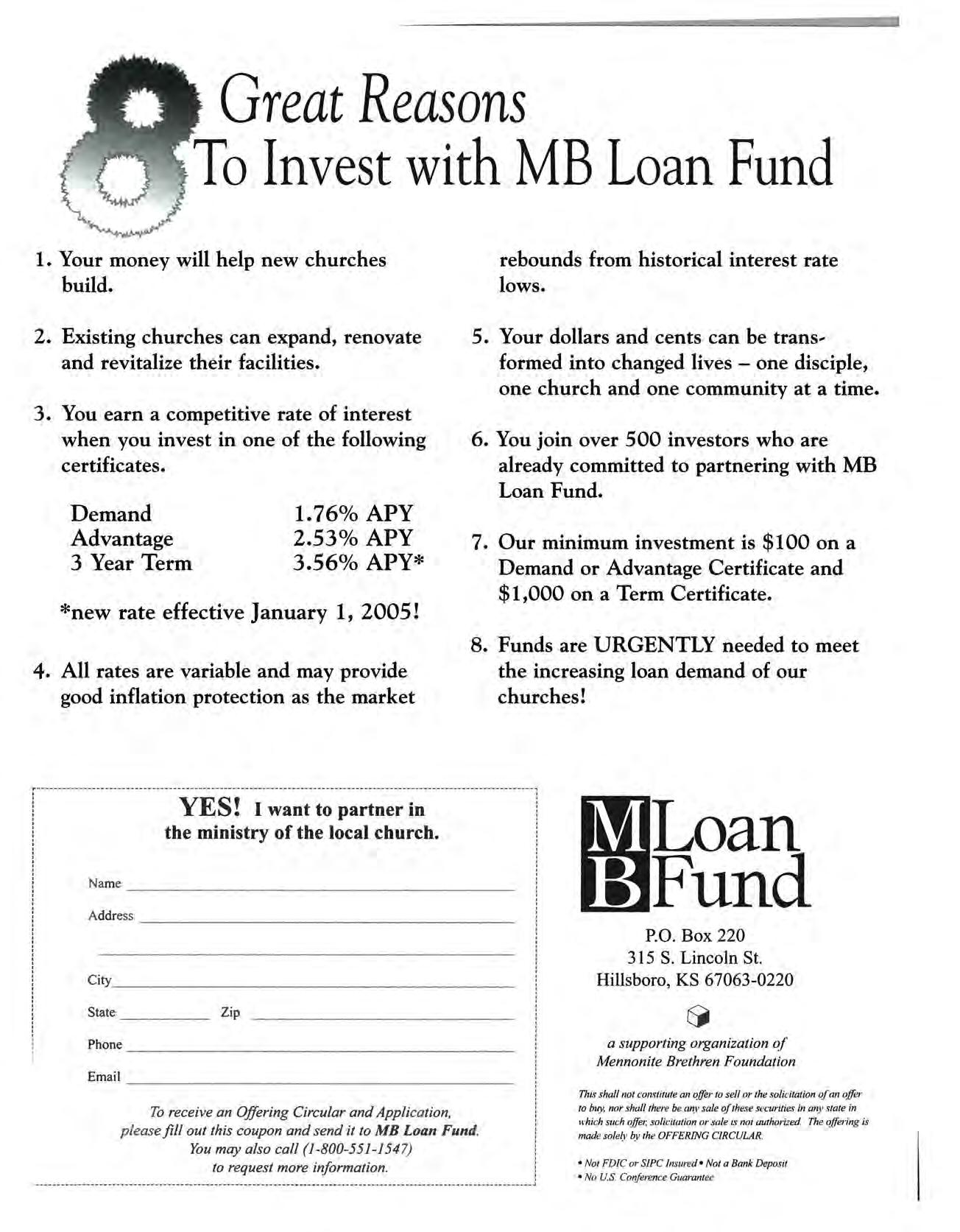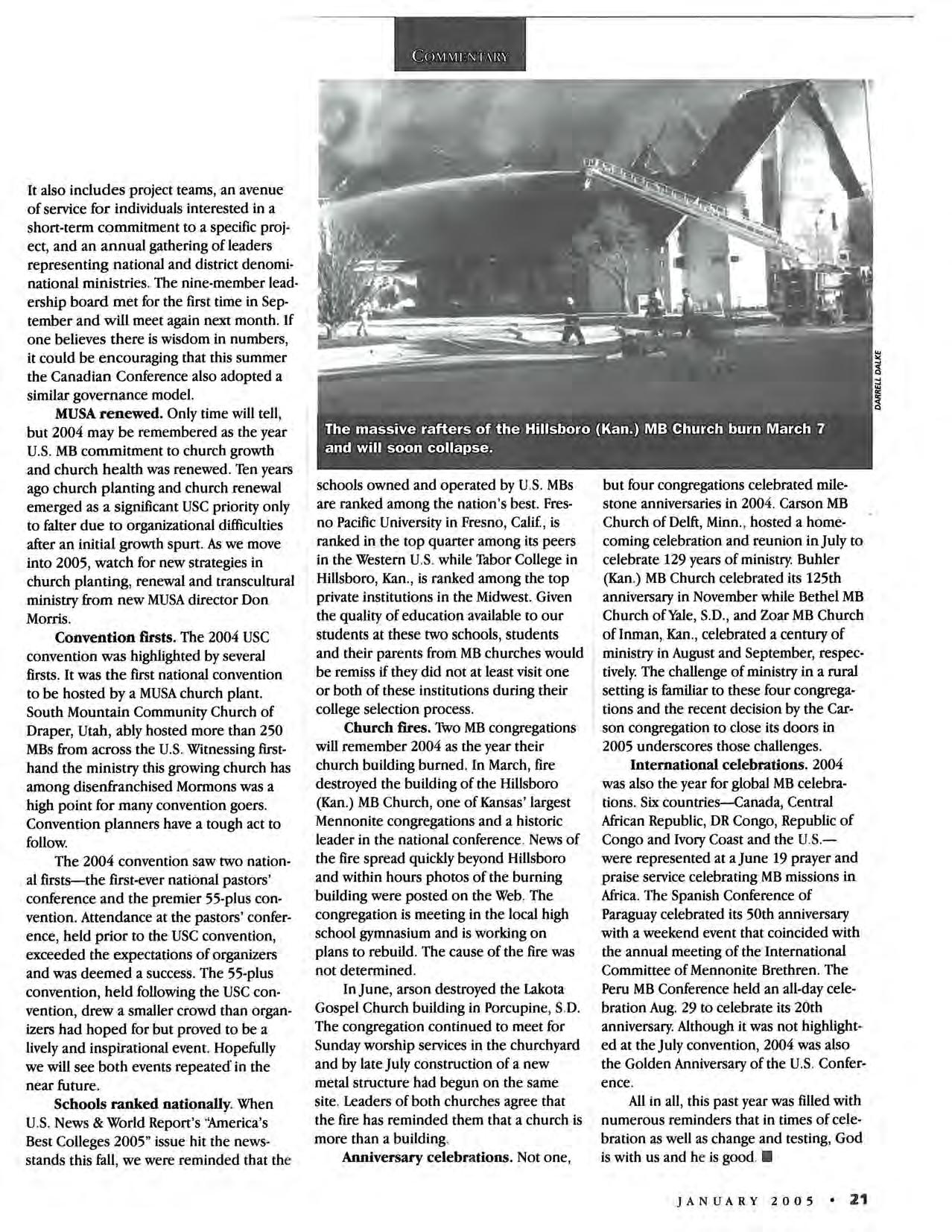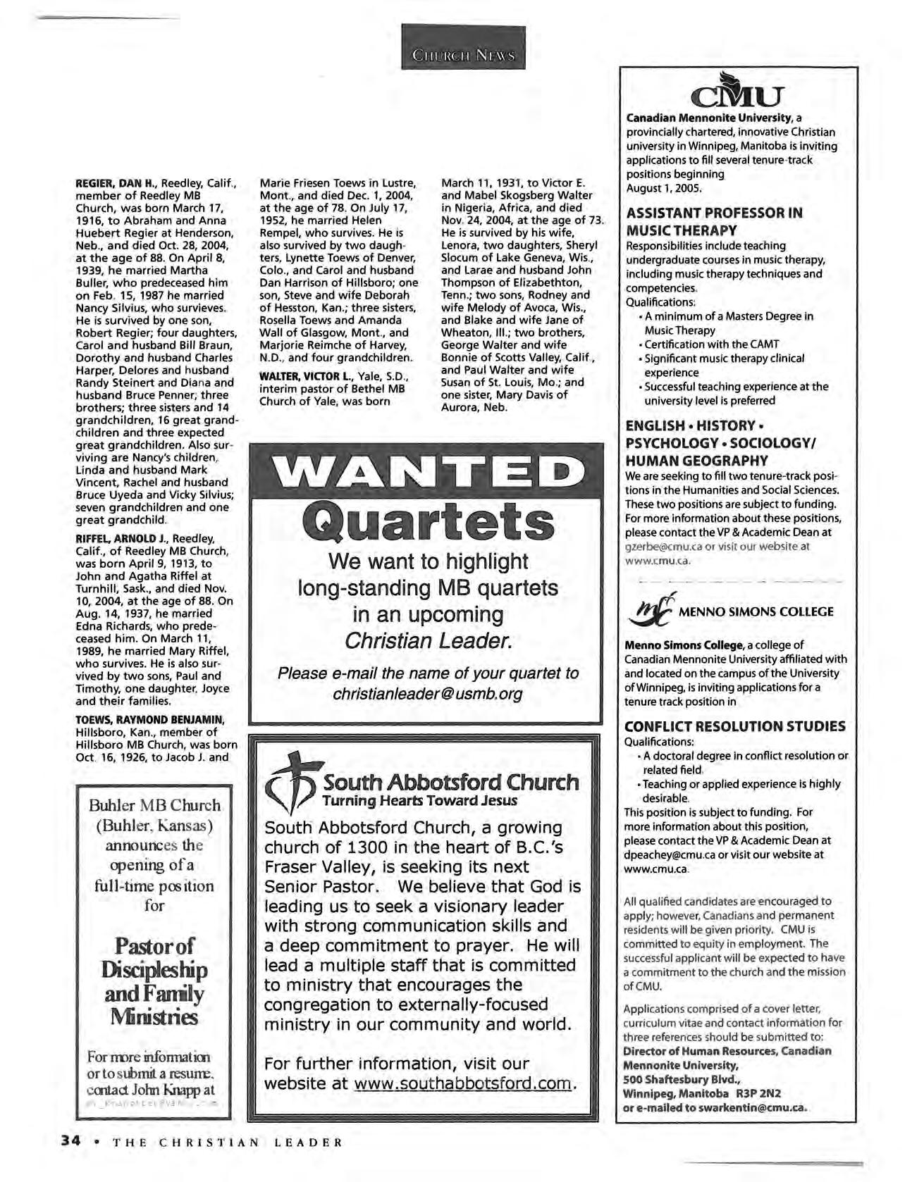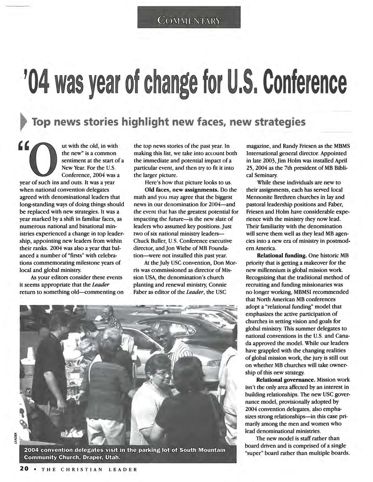 In the news section we include a review of U.S. Conference 2004 highlights, an interview with a Kansas couple that has ventured into the world of in vitro fertilization, the story of a growing community youth outreach in South Dakota and news from British Columbia of Mennonite Brethren facing the challenge of working with a local Buddhist temple proposing significant facility expansion.