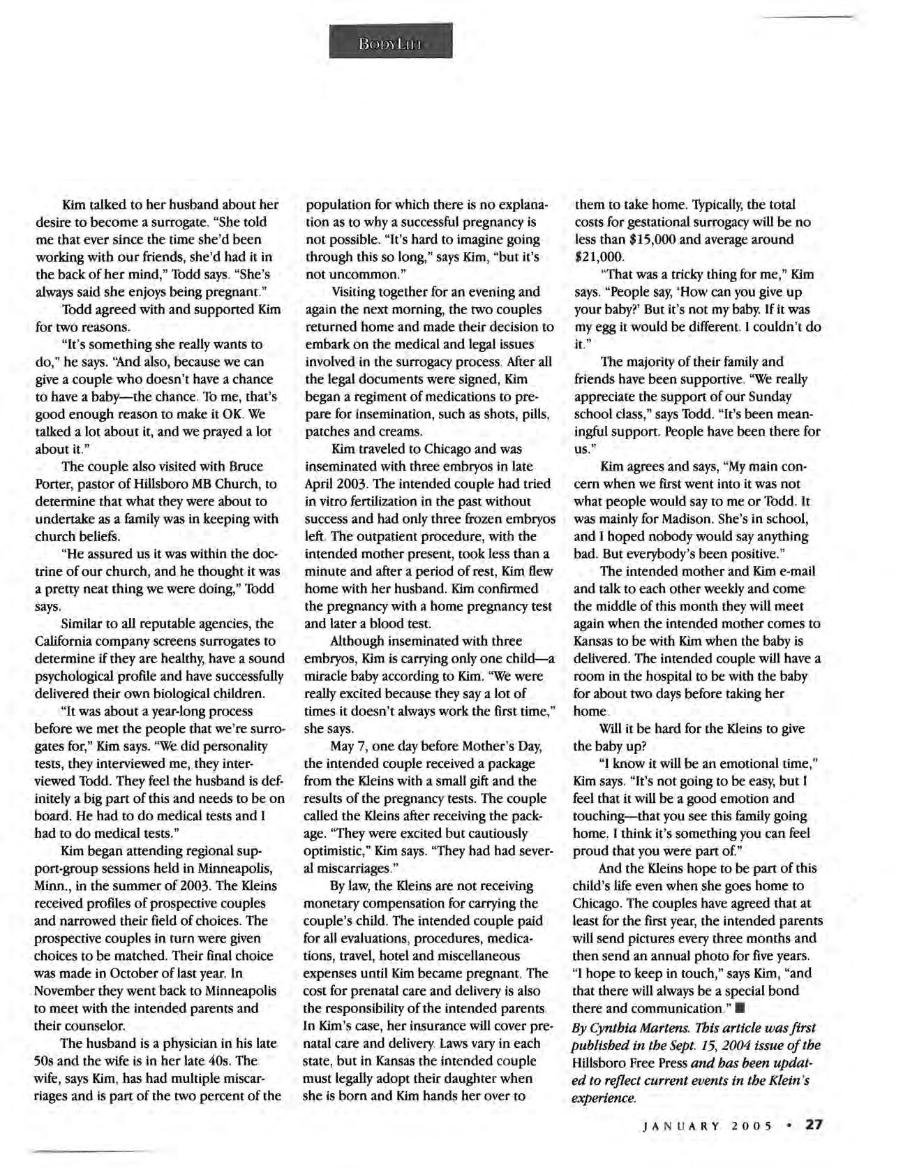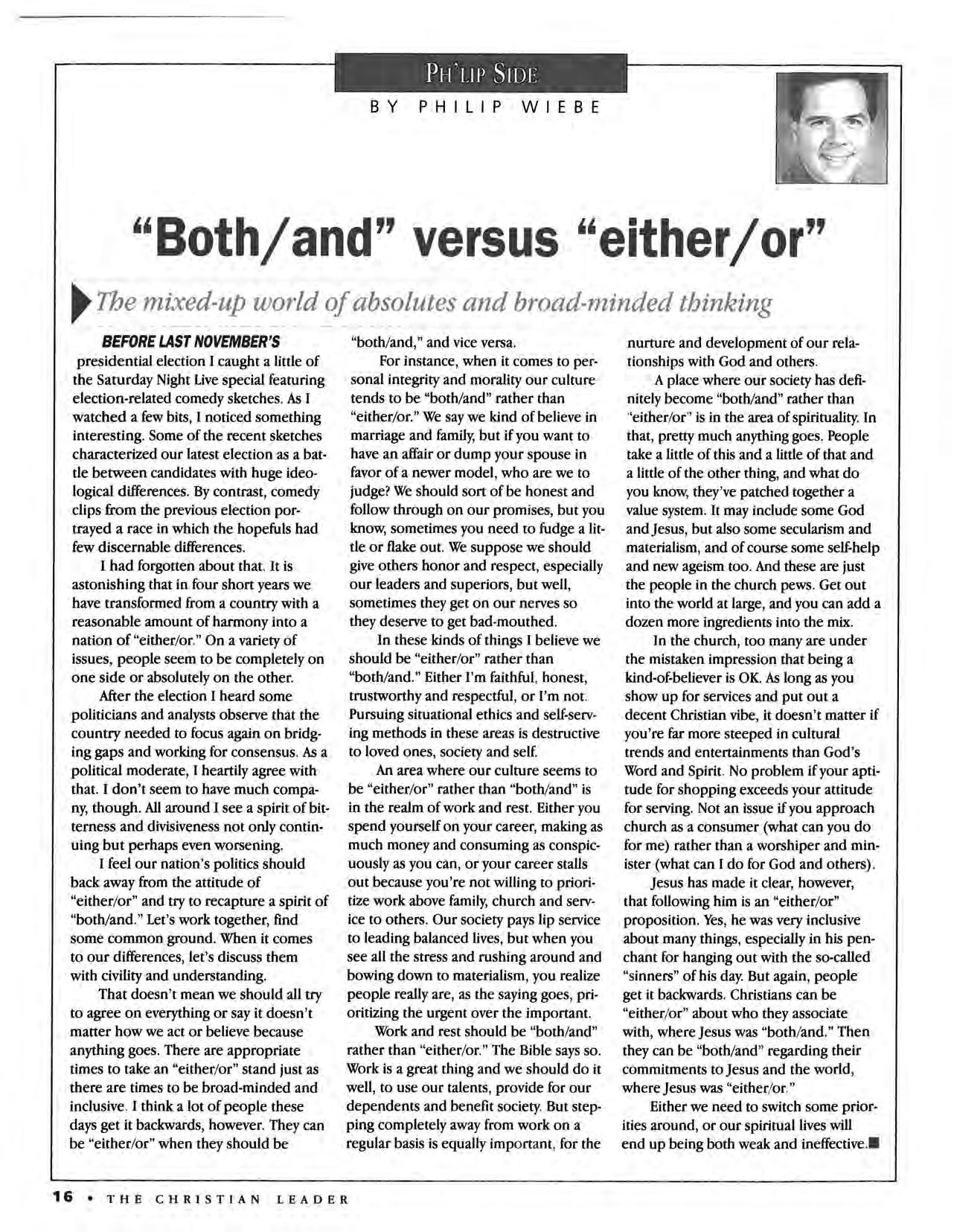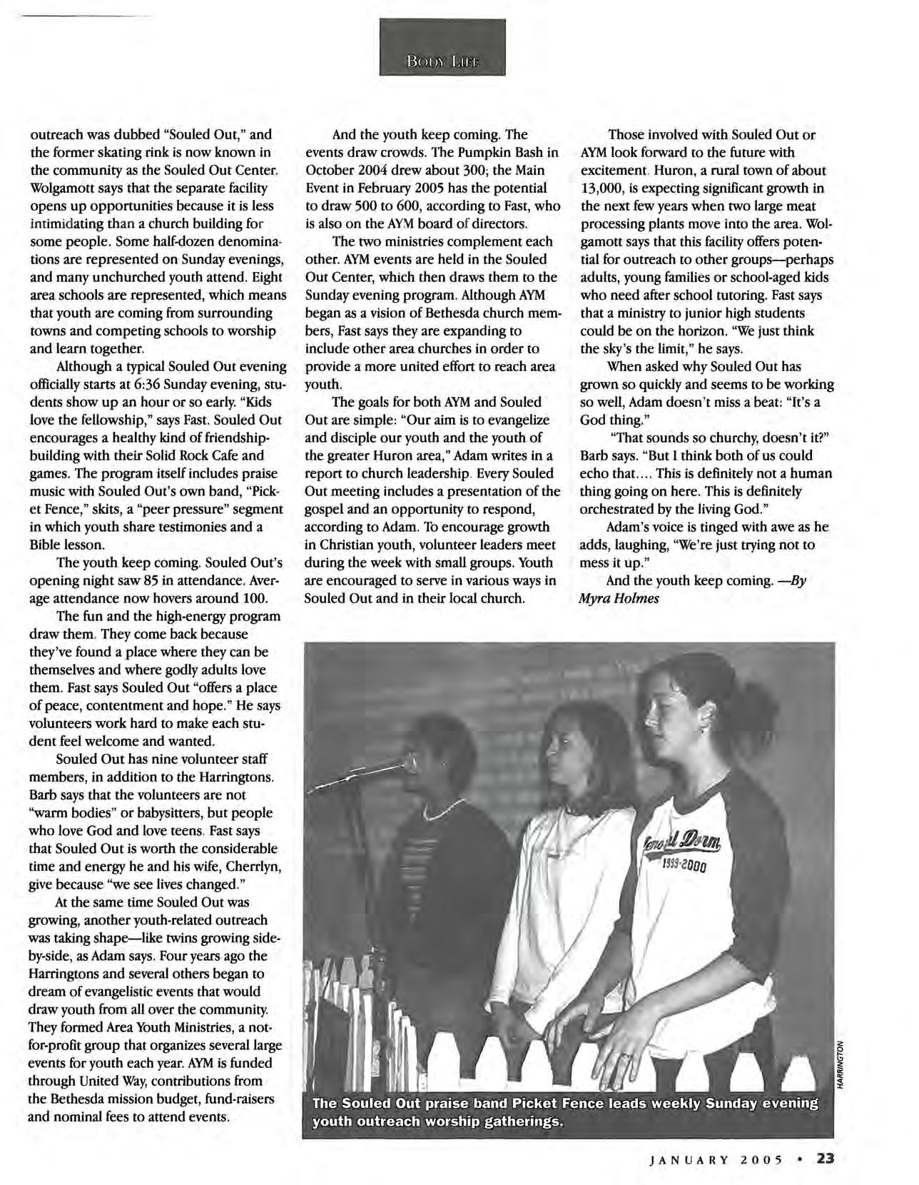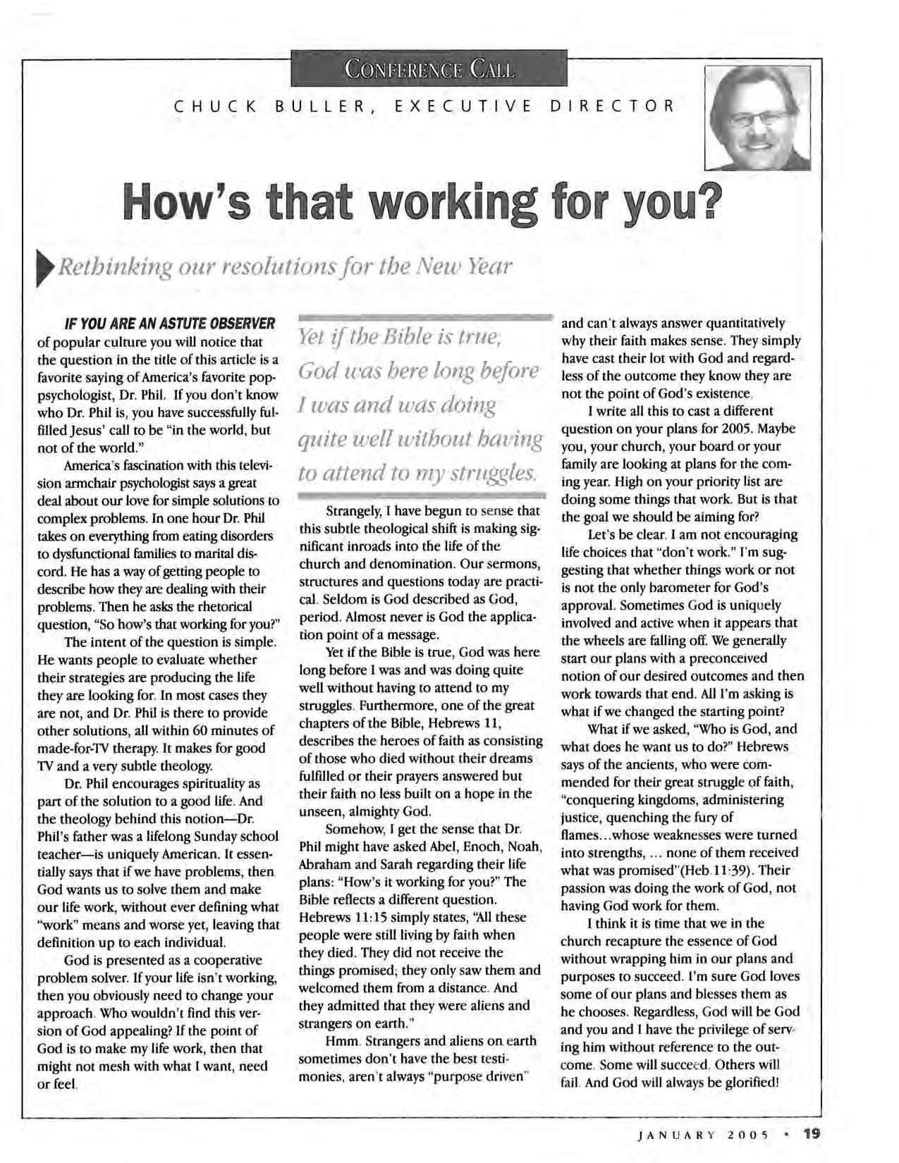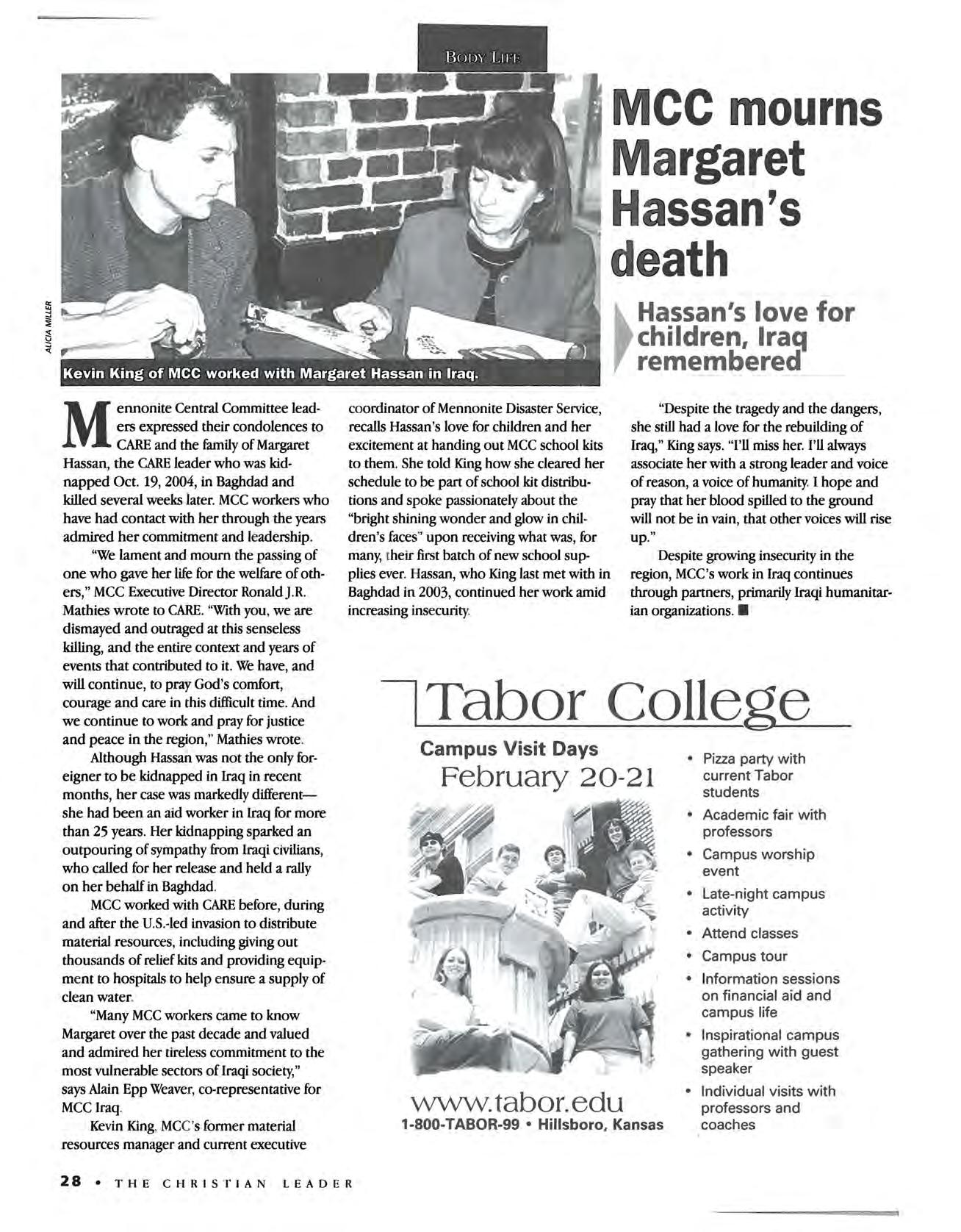 In the news section we include a review of U.S. Conference 2004 highlights, an interview with a Kansas couple that has ventured into the world of in vitro fertilization, the story of a growing community youth outreach in South Dakota and news from British Columbia of Mennonite Brethren facing the challenge of working with a local Buddhist temple proposing significant facility expansion.