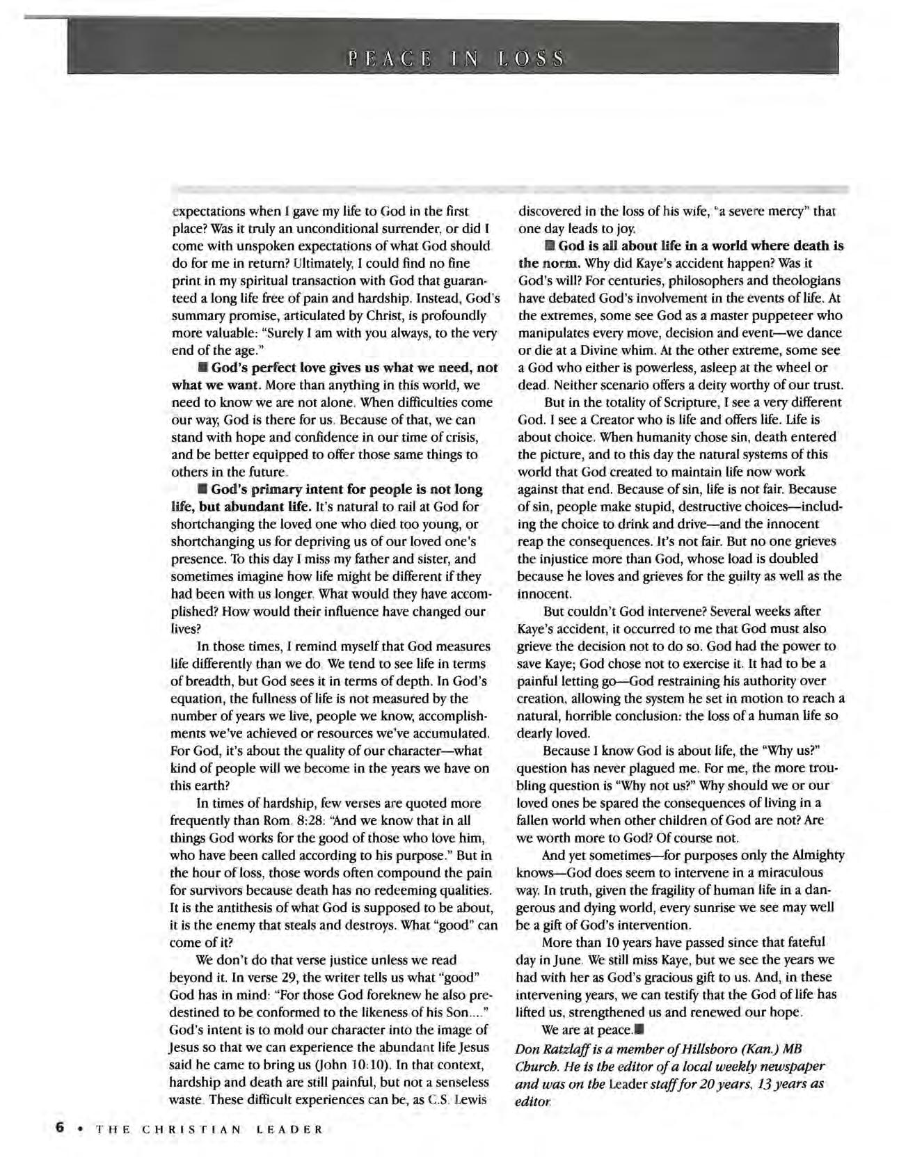 Don Ratz laff is a member of Hillsboro (Kan.) MB Church. He is the editor of a local weekly newspaper and was on the Leader stafffor 20 y ears, 13 years as edito r.