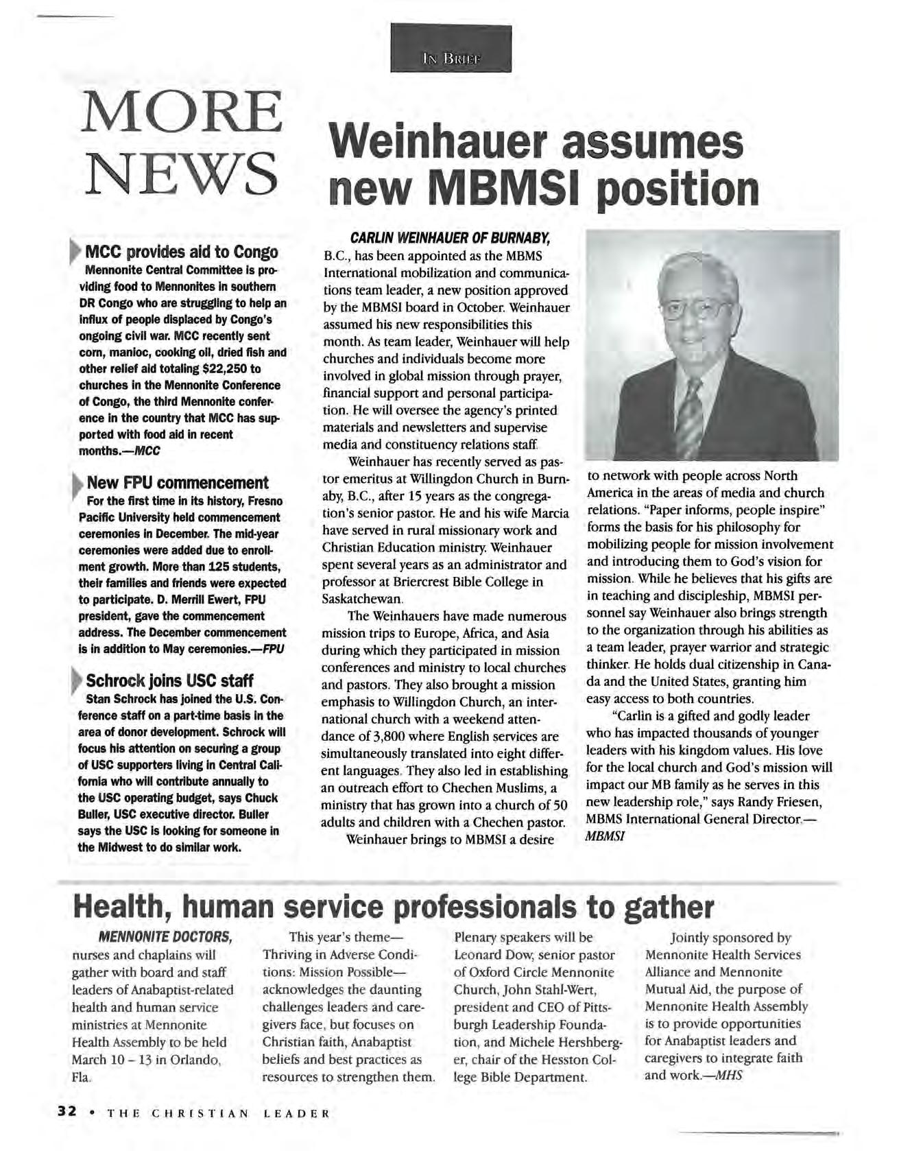 MANDATE: The Christian Leader (lSSN 0009-5149) is published monthly by the U.S. Conference of Mennonite Brethren Churches. The Christian Leader seeks to inform Mennonite Brethren members and churches of the events, activities, decisions and issues of their denomination, and to instruct, inspire and initiate dialogue so members will aspire to be faithful disciples of Christ as understood in the evangelical/Anabapt i st theological tradition.