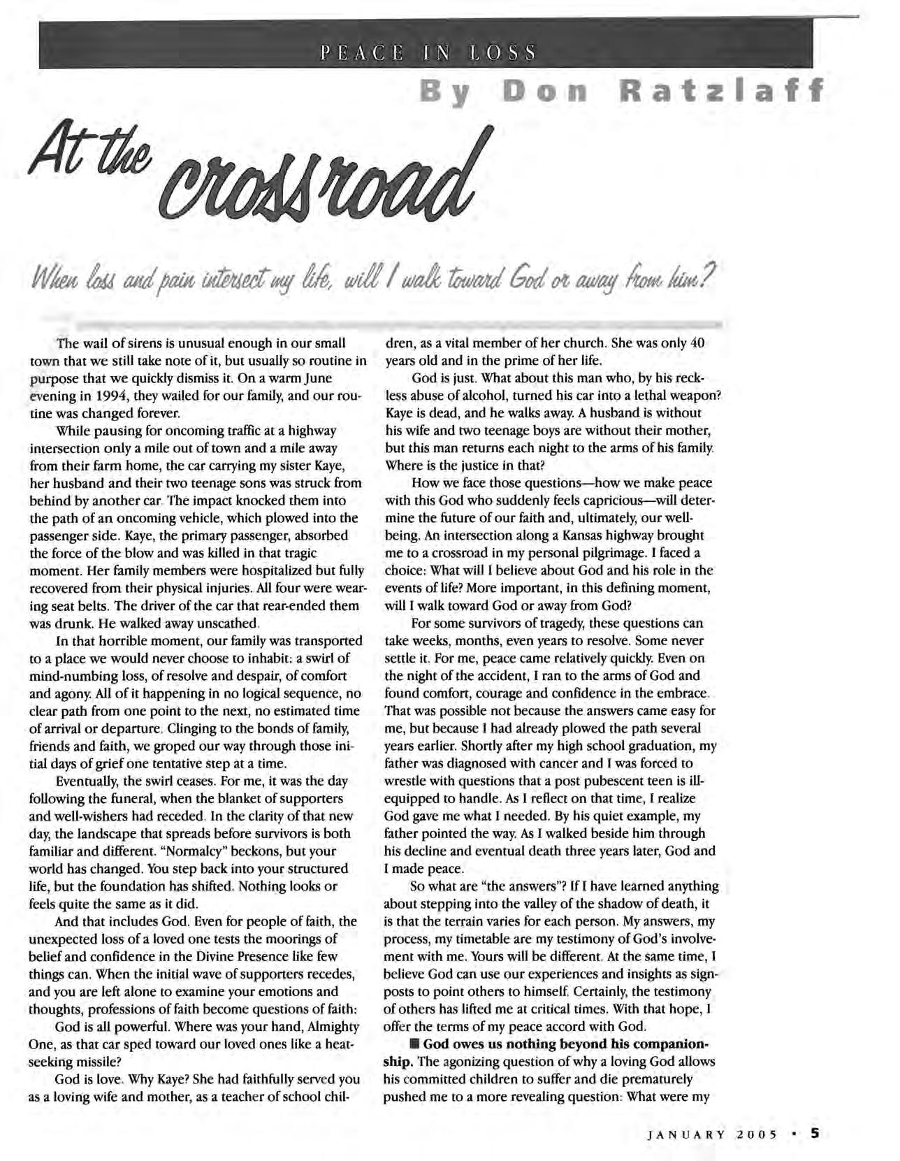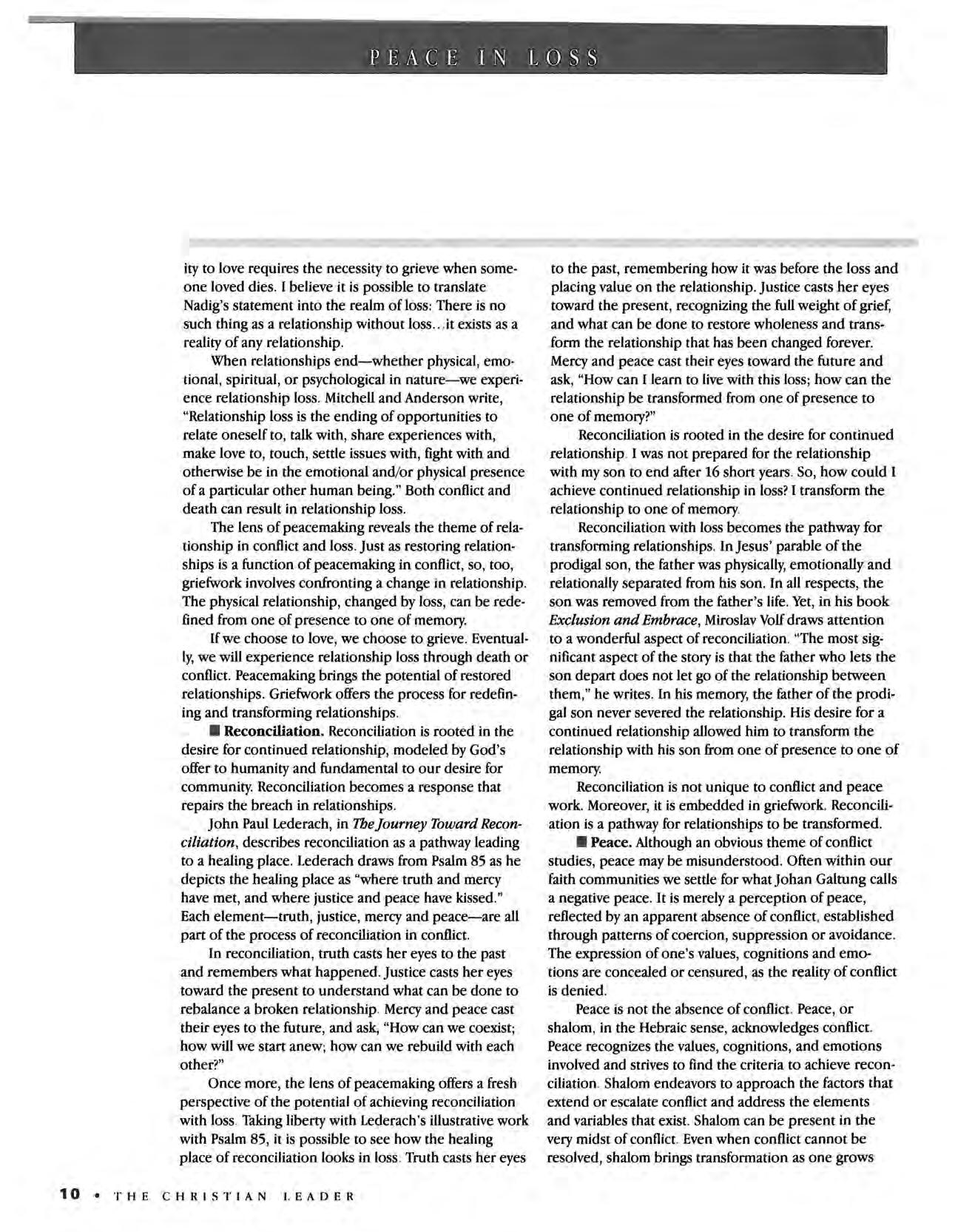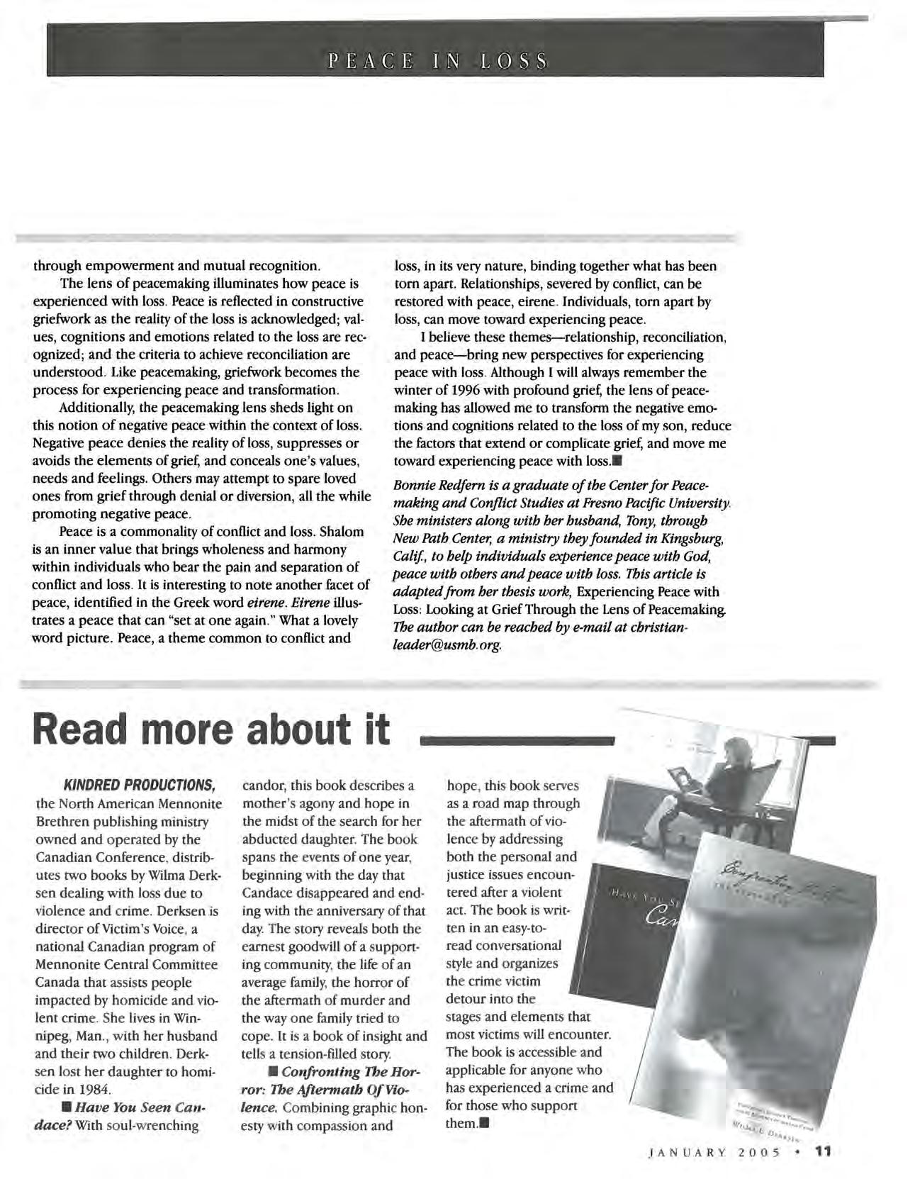 This year we want to continue expanding our understanding of peace by looking at how we can and do make peace with loss. While most of this month's feature articles focus on the death of a loved one, loss comes in all shapes and sizes. We can lose material things-like our "perfect" house thanks to a move or natural disaster. We can lose good mental or physical health. We can lose our innocence due to abuse or premarital sex. We can lose our sense of identity thanks to the loss of a job or divorce. We can lose a relationship we once treasured due to a misunderstanding, unresolved contlict or divorce.