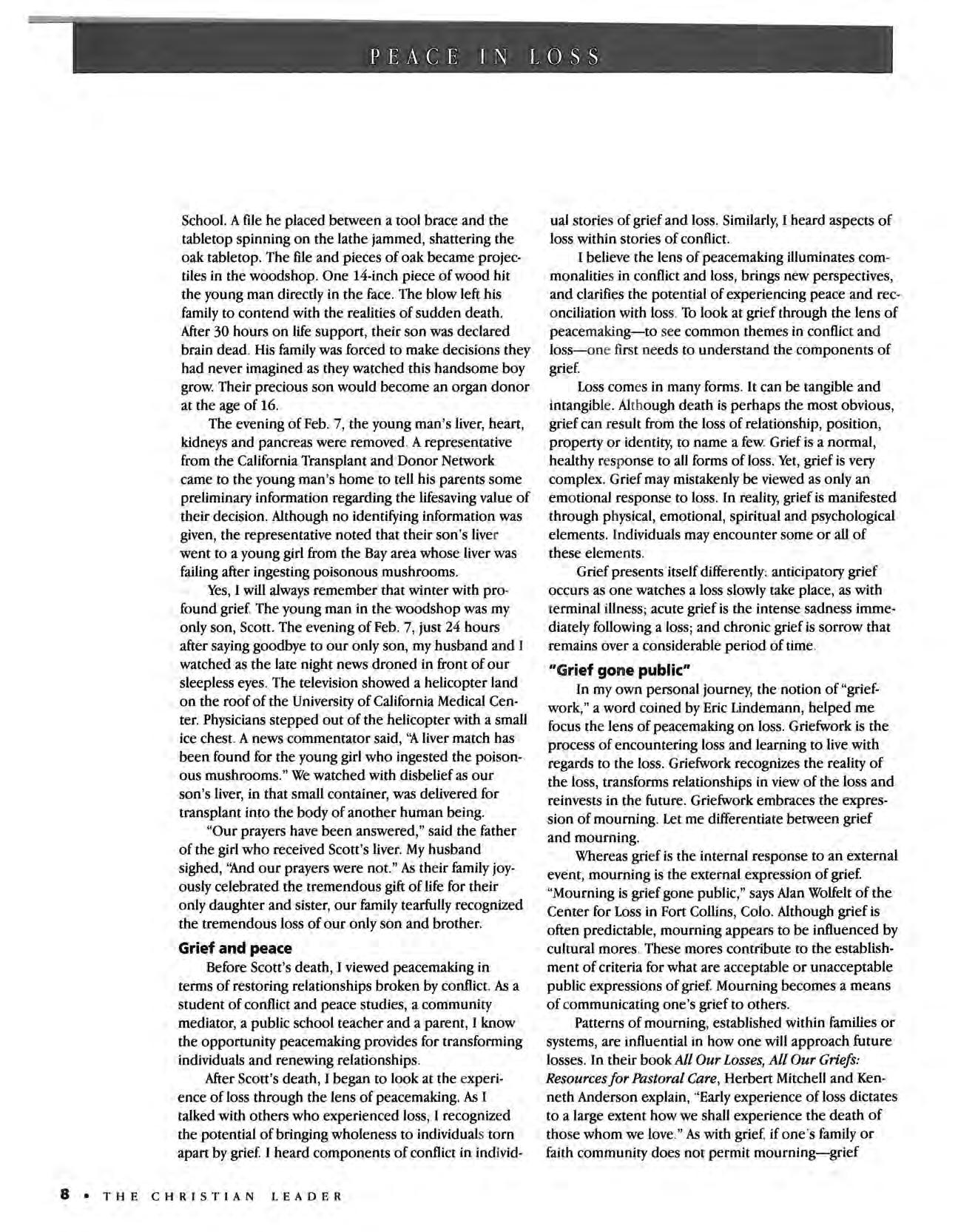 After Scott's death, I began to look at the experience of loss through the lens of peacemaking. As I talked with others who experienced loss, I recognized the potential of bringing wholeness to individual s torn apart by grief. I heard components of conflict in ind ivid-