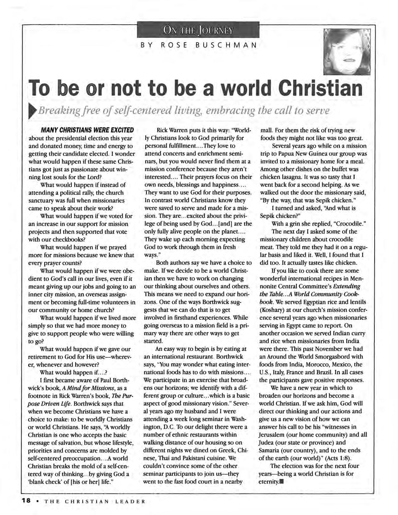 EDITORIAL POLICY: The views expressed in this publication do not necessarily represent the position of the Christian Leader, the U S. Conference Leadership Board or the Mennonite Brethren Church Scripture references are from New International Version unless otherwise noted. The editors invite free-lance article submissions. A SASE must accompany articles