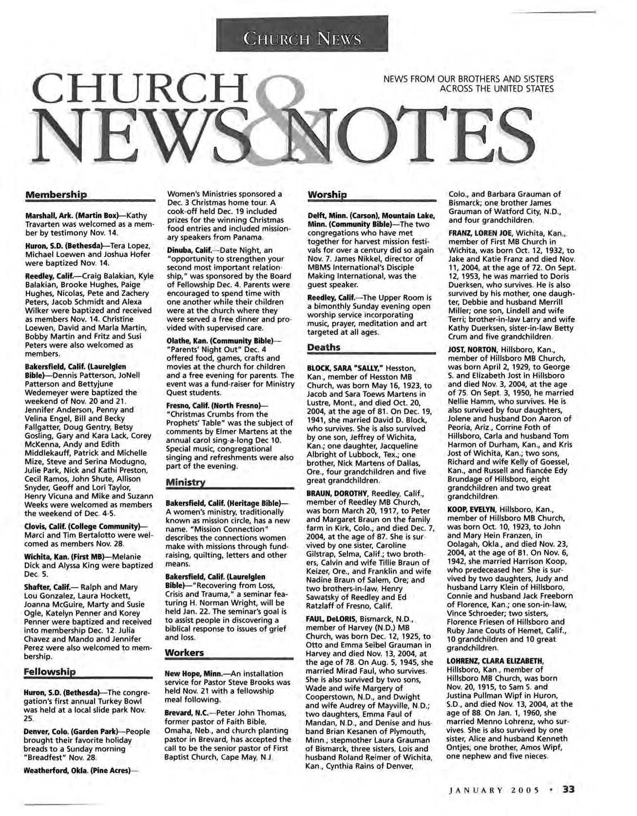 FRANZ. lOREN JOE, Wichita, Kan ., member of First MB Church in Wichita, was born Oct. 12, 1932, to Jake and Katie Franz and died Nov 11, 2004, at the age of 72. On Sept. 12, 1953, he was married to Doris Duerksen, who survives He is also survived by his mother, one daughter, Debbie and husband Merrill Miller; one son, Lindell and wife Terri; brother-in-law larry and wife Kathy Duerksen, sister-in-law Betty Crum and five grandchildren