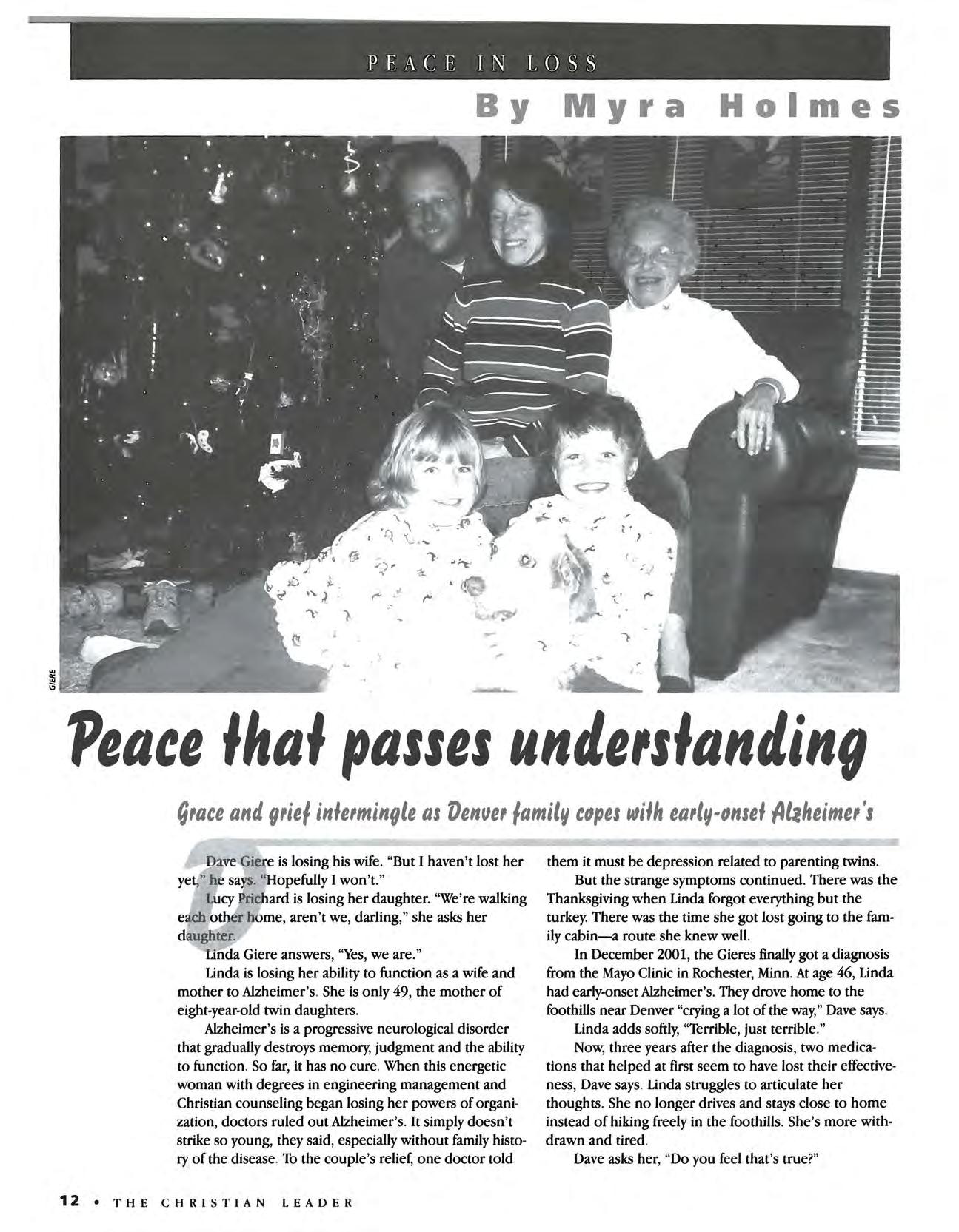 In the midst of early-onset Al zheimer's, a Denver family g ives witness to the amazing outpouring of peace that only God can give
