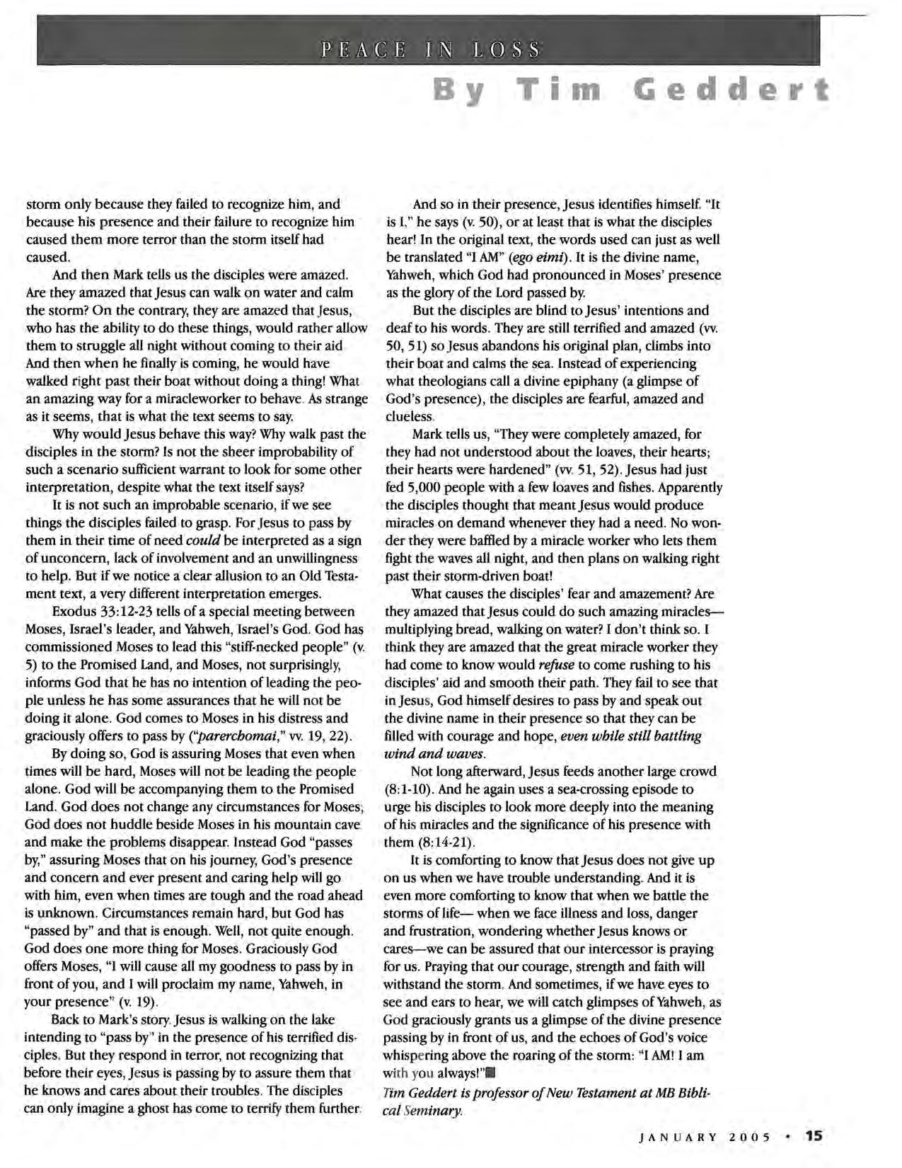What do we do when faced with loss and grief? Our writers offer a variety of insights. Don Ratzlaff learned that loss prompts one to either walk towards or away from God. Bonnie Redfern encourages us to make peace with the conflicts that come with loss. The Guire family reminds us that walking with God is the best way to survive times of loss. And Tim Geddert says that when we walk through life's storms, Jesus intercedes for us and walks with us. In a guest editOrial, Brad Thiessen reflects on what he has learned about living in the shadow of cancer. I join these writers in praying that their words will provide comfort and insight.