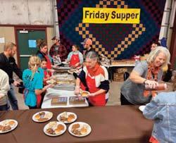 Top right: The congregation helps make and serve the Friday evening meal, typically pulled pork, at the Oklahoma Mennonite Relief Sale. Pictured is the junior high youth and other volunteers serving the meal.