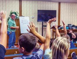 Top left: FMBC runs a bus service to pick up children for Wednesday evening youth programming, which begins with a fellowship meal, followed by activities. Elementary age children participate in the AWANA program (pictured), while junior high and high school students each have their own activities.