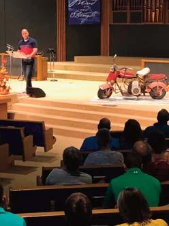 Left: Pastor Travis Schmidt speaks during Biker Sunday, an annual fellowship and outreach event that includes a meal, a prayer of blessing and a ride designed to bring together riders from multiple churches and introduce others to church.