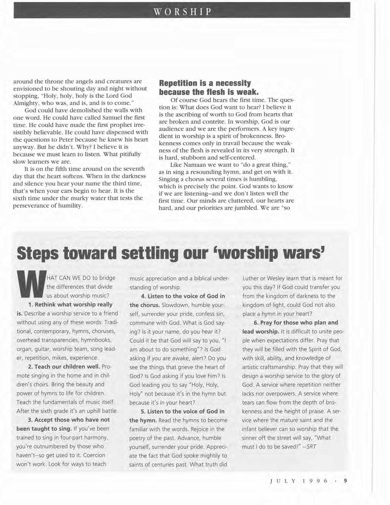 2. Try to describe a worship service as the author says to in the first suggestion in the sidebar "Steps Toward Settling Our Worship Wars" (page 9).