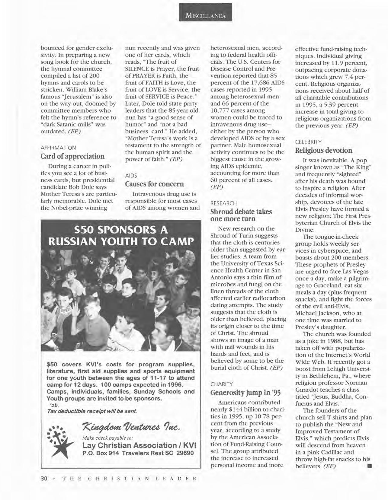 $50 covers KVI's costs for program supplies, literature, first aid supplies and sports equipment for one youth between the ages of 11-17 to attend camp for 12 days. 100 camps expected in 1996. Camps, individuals, families, Sunday Schools and Youth groups are invited to be sponsors. 'ot,. Tax deductible receipt will be sent.