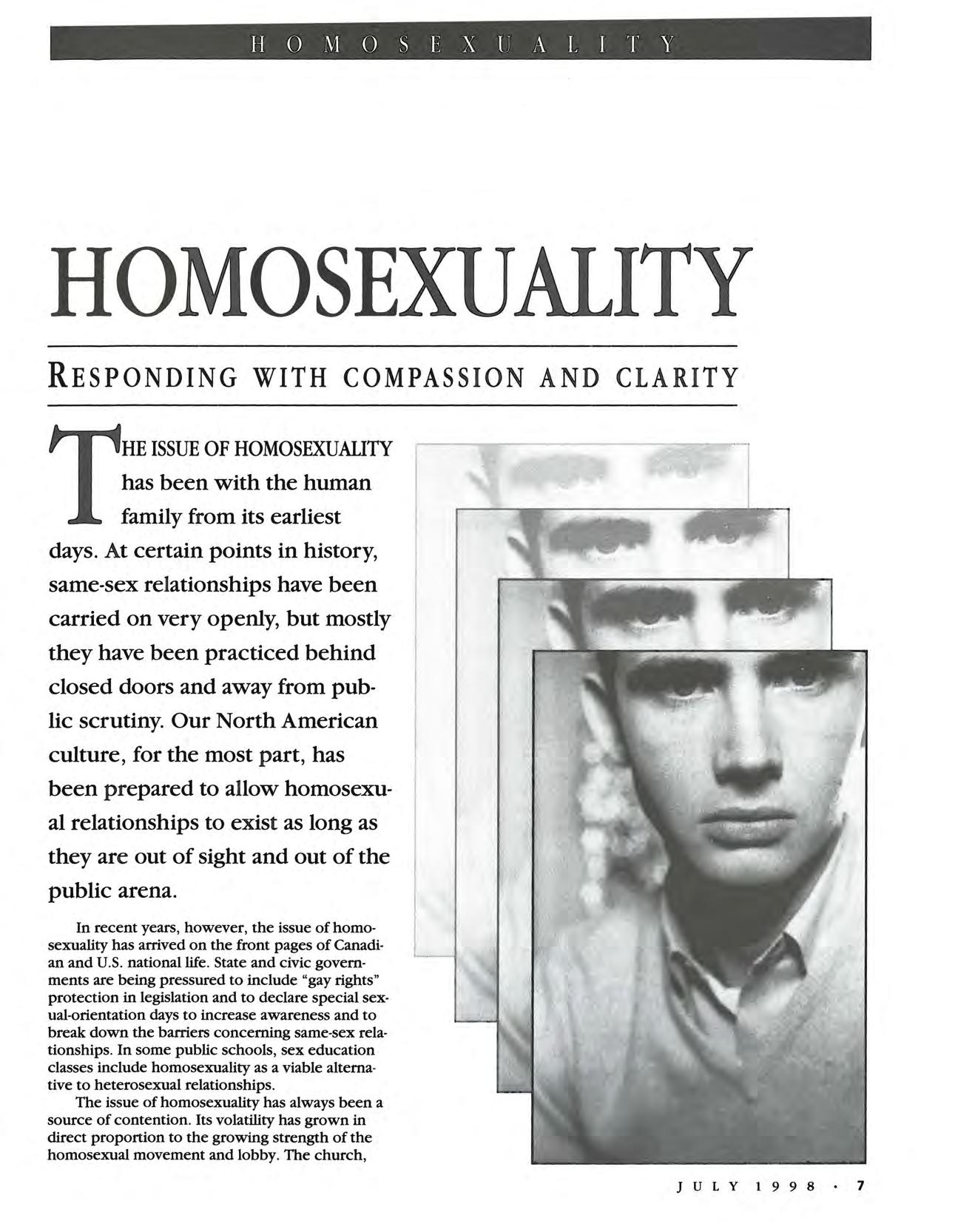 Where does the church stand on the issue of homosexuality? Historically, it has proclaimed that the only legitimate intimate relationships are heterosexual, and these only within the bounds of marriage. This is also the position of the Mennonite Brethren Church. In reviewing the bibli· cal material on the subject, the following five points are important.